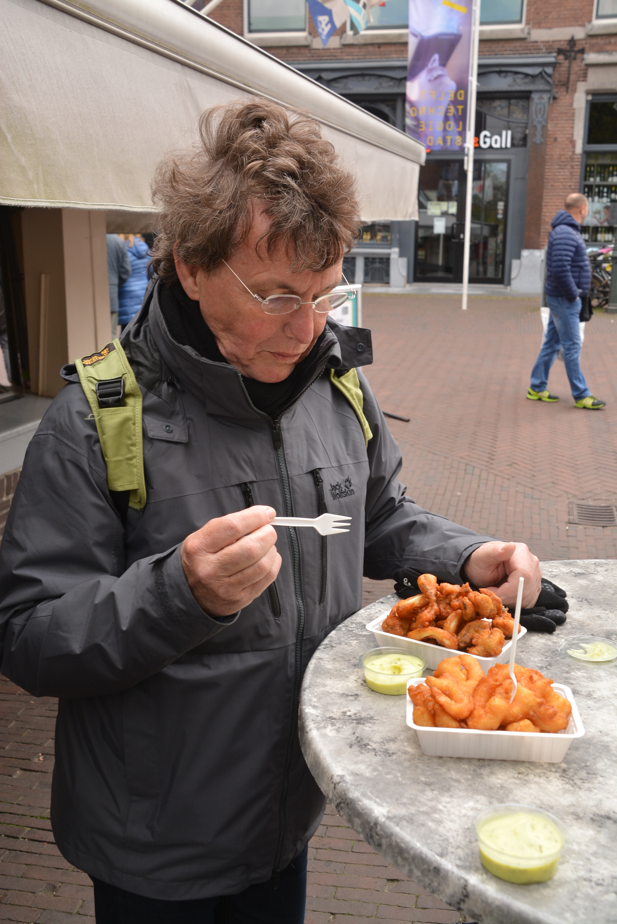 An der Voldersgracht riecht es nach leckerem Fisch und Sekunden später stoßen wir auf eine sehr frequentierte Fischbude. Hier spachteln wir gebackene Scampi, Muscheln und Tintenfischringe – zwei Riesenportionen!!! Lecki, lecki, lecki!!!