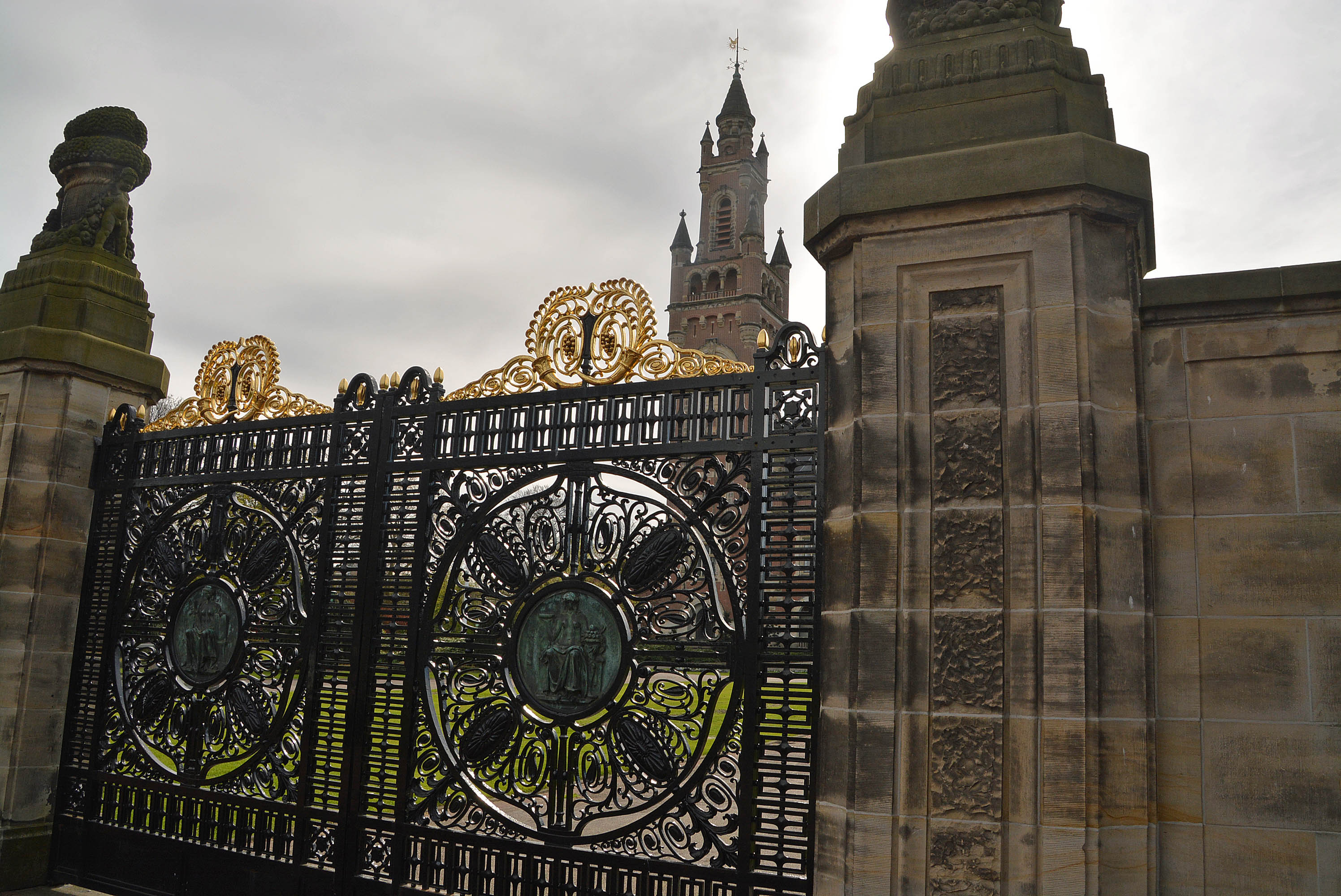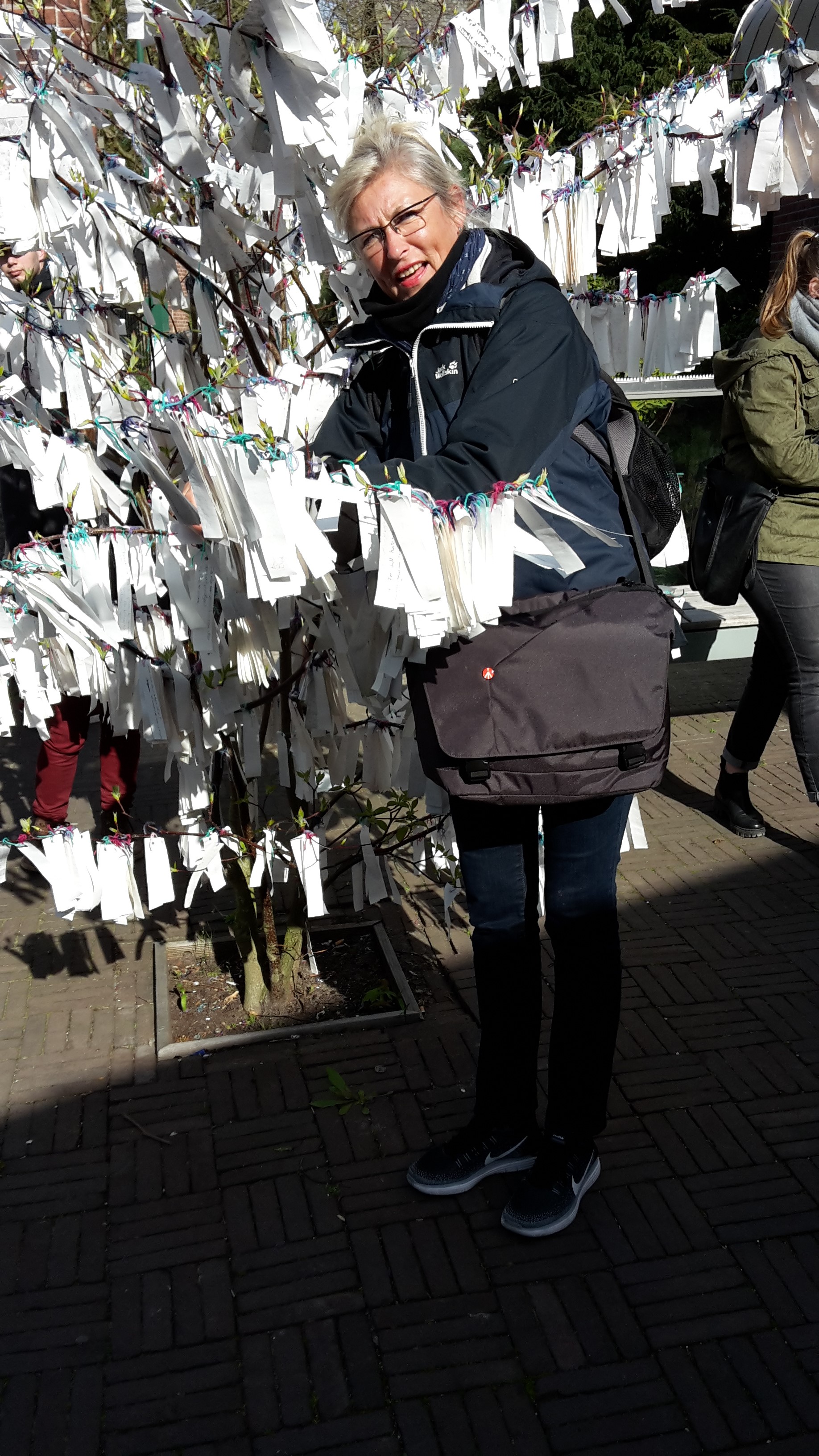 In Anbetracht des auffrischenden und kühlen Windes entschließen wir uns als letztes, den Internationalen Gerichtshof aufzusuchen, das Hauptrechtsprechungs-Organ der Vereinten Nationen. Seit 1945 wird im Den Haager Friedenspalast internationales Recht gesprochen. An einem Bäumchen im Innenhof flattern hunderte weißer Zettel mit Friedenswünschen. Ich organisiere mir auch einen Zettel und hänge unsere Wünsche ebenfalls auf.