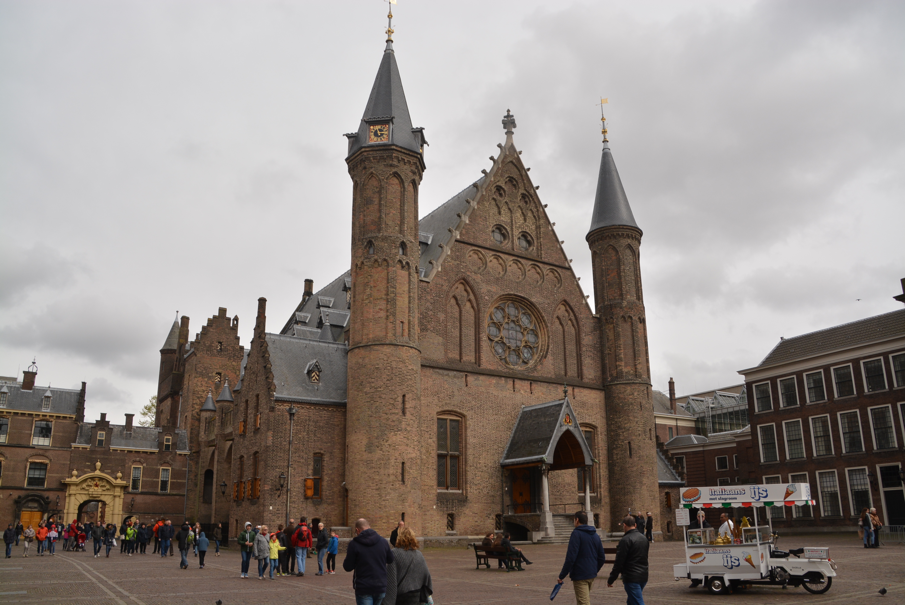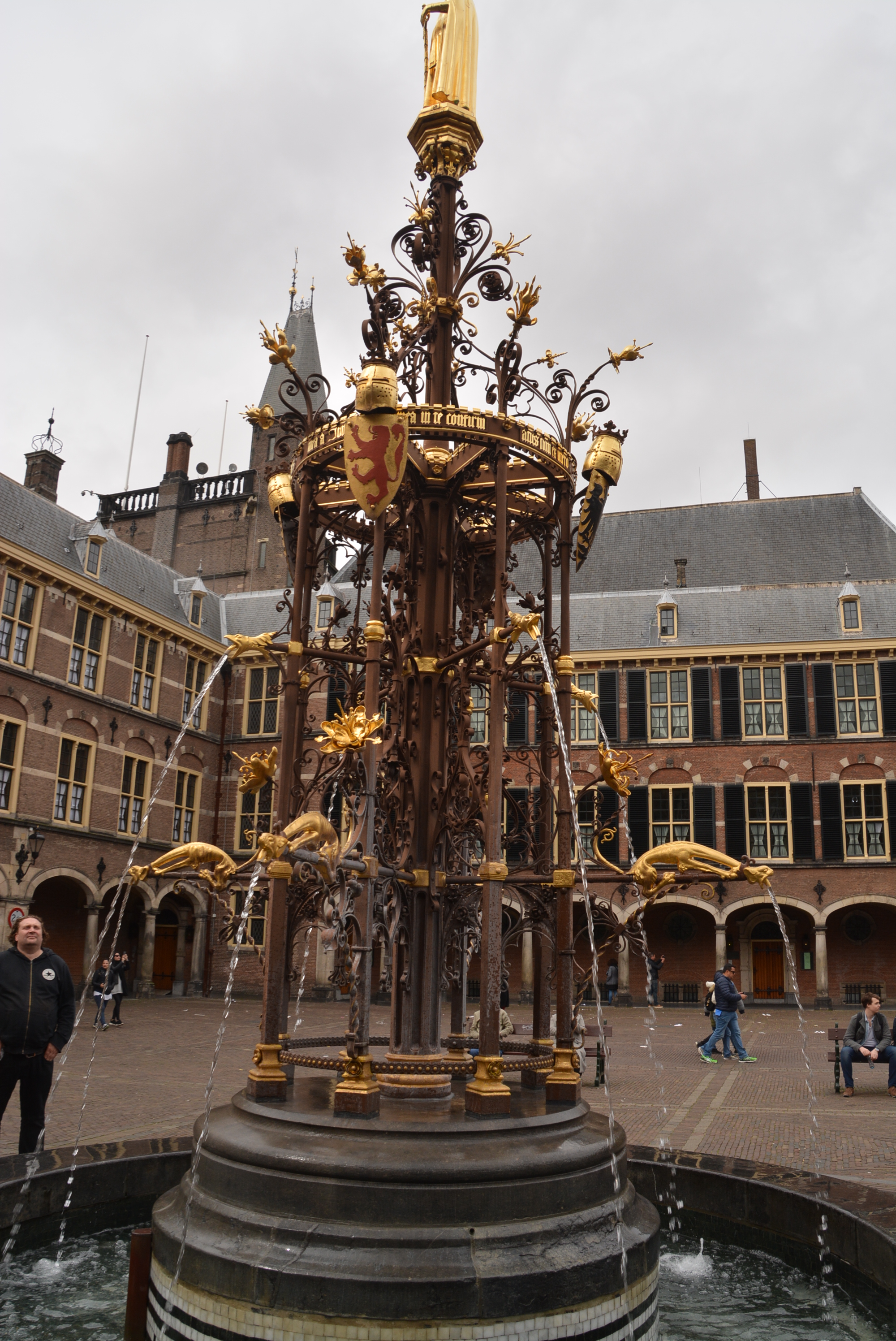 Der Binnenhof ist das politische Zentrum der Niederlande und der erste wirklich schöne Gebäudekomplex. Er liegt mitten in der Stadt und ist kaum zu übersehen. Das ist auch der Grund, weshalb wir das aus dem 13. Jahrhundert stammende Gesamtgebäude auf Anhieb finden. Ursprünglich war es das Jagdschloss des Grafen von Holland. Im kleinen Turm hat der niederländische Ministerpräsident seinen Arbeitsplatz. Wir entdecken auf dem großzügigen Innenhof einen wunderbaren Brunnen. Jedes Jahr im September am dritten Dienstag dem ‚Prinsjesdag‘, hält der König im Rittersaal die Thronrede, mit der das neue Parlamentsjahr eröffnet wird. Wir befinden uns demnach im Herzen der holländischen Demokratie! Eine besonders schöne Ansicht des Gebäudekomplexes finden wir gegenüber des Hofvijver-Sees.
