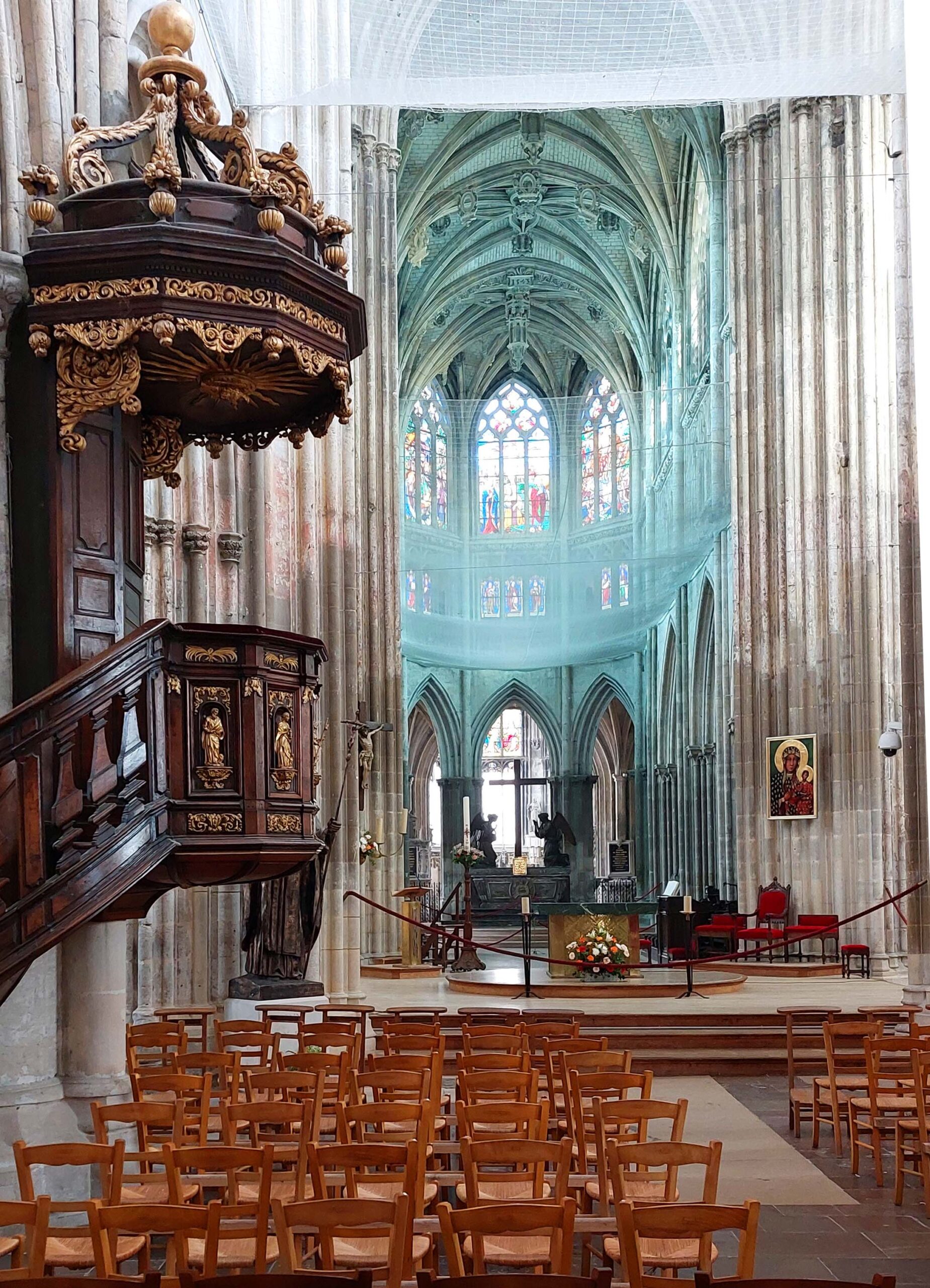 Der Gottesdienst ist beendet und ich schaue mir das beeindruckende Kirchenschiff mit den wunderschönen großen Buntglasfenstern an. Zehn Jahrhunderte lang wurden hier über 30 französische Könige gekrönt.
