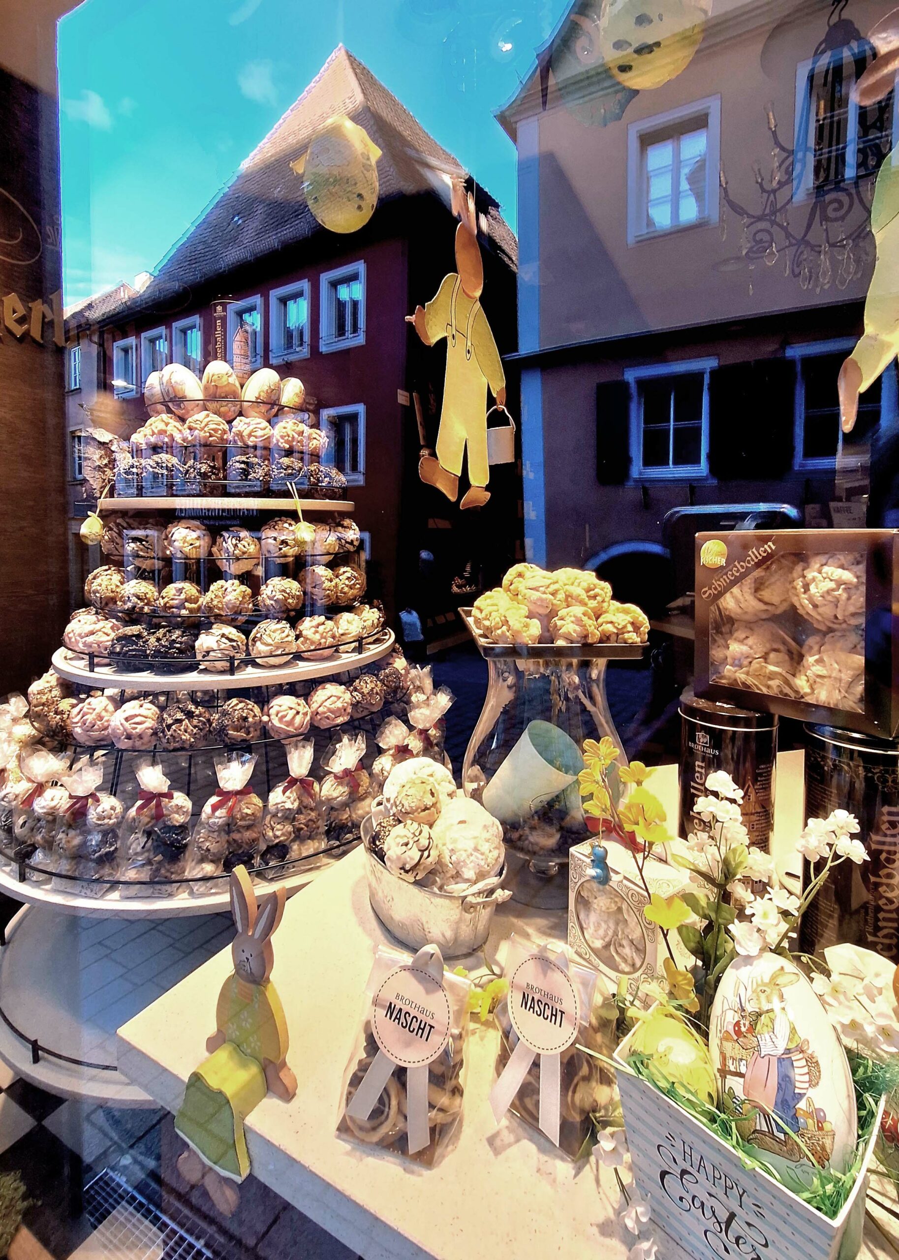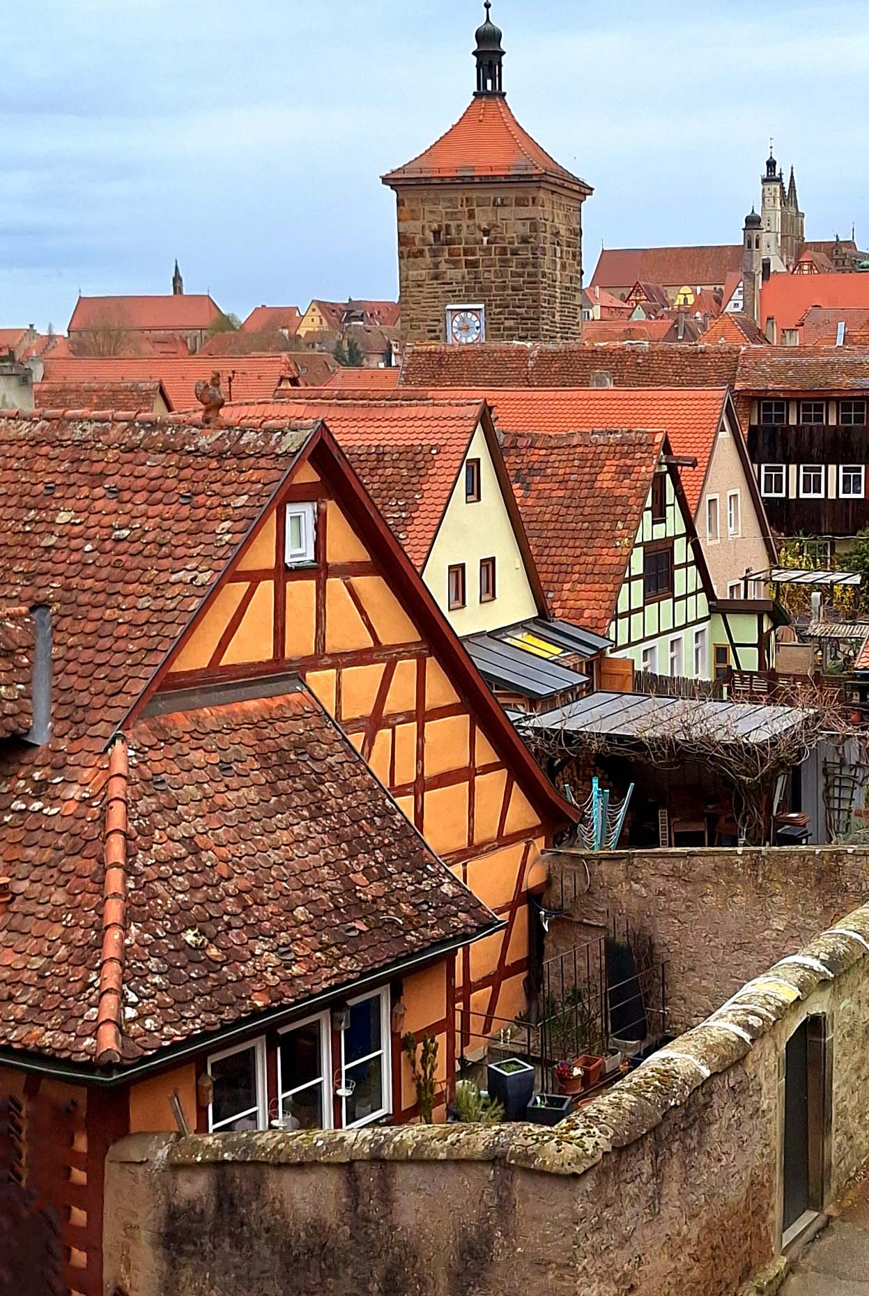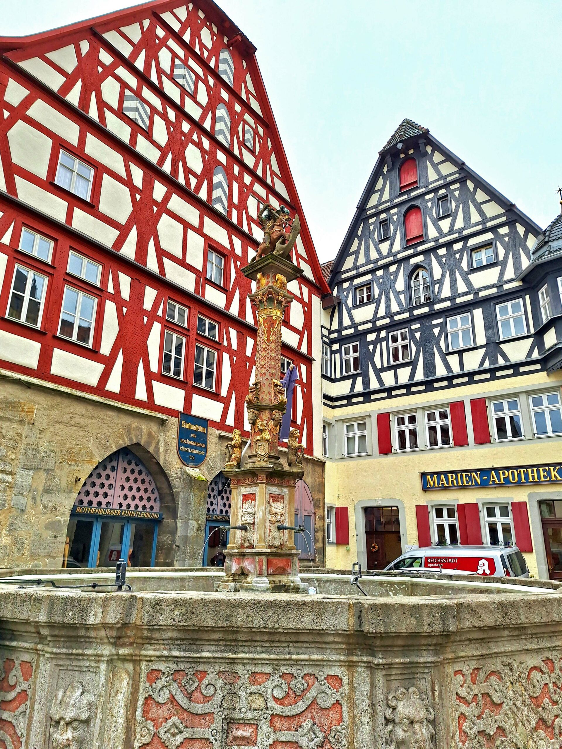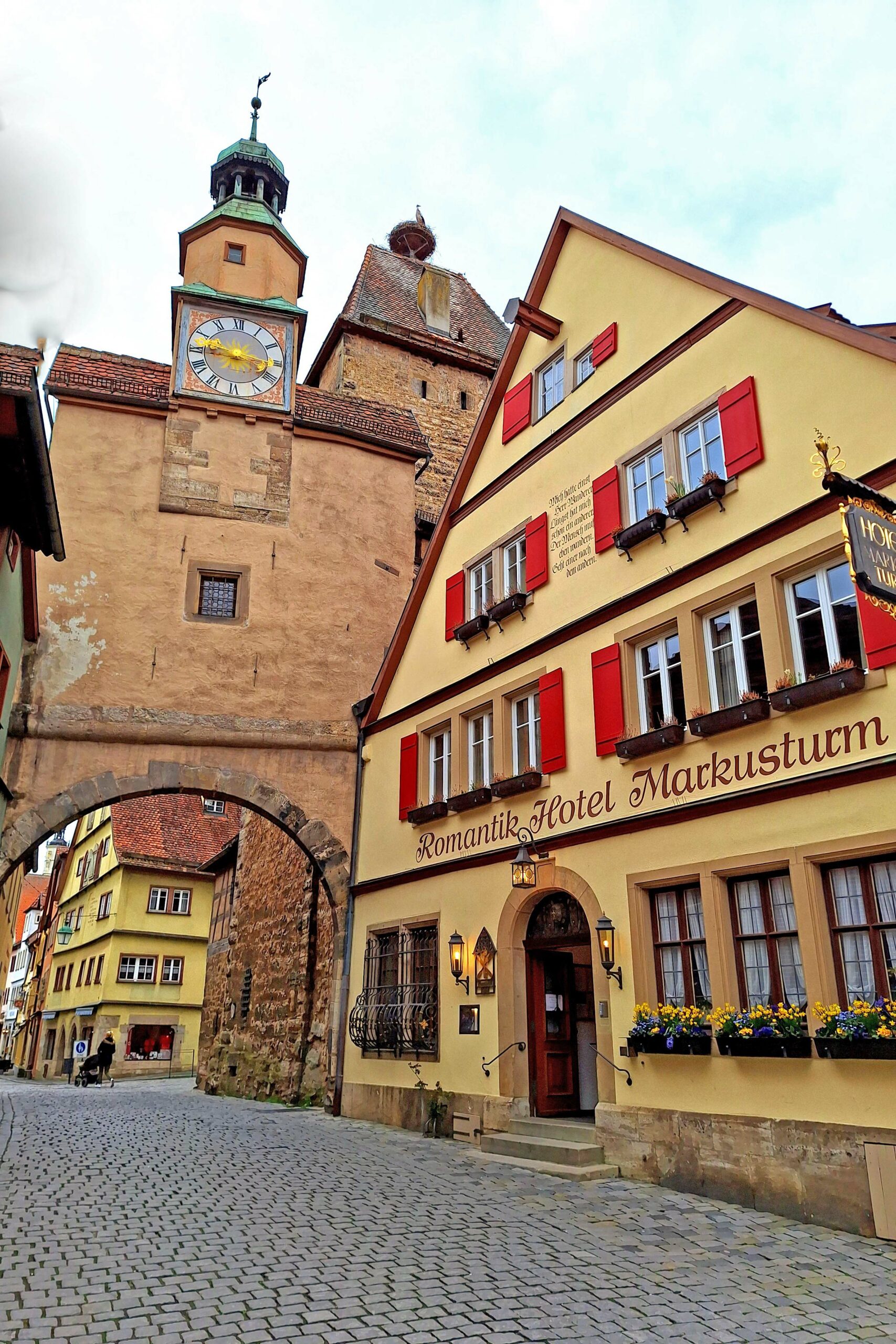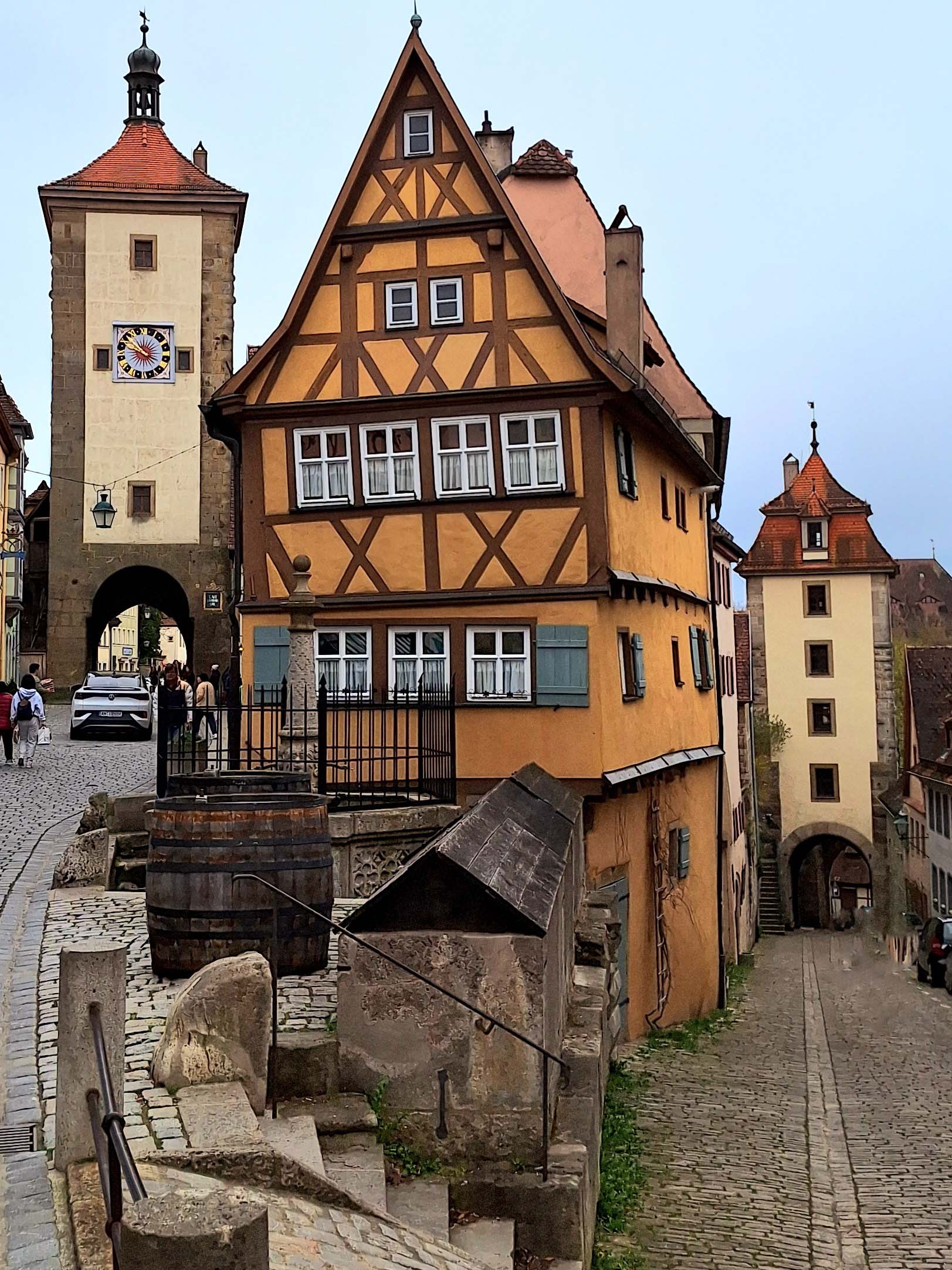 Auf dem Rückweg komme ich beim „Plönlein“ vorbei. Das ist ein schiefes krummes gelbes Fachwerkhäuschen mit Brunnen zwischen zwei Stadttoren. Wahrscheinlich schon milliarden Mal fotografiert!!! 🤭