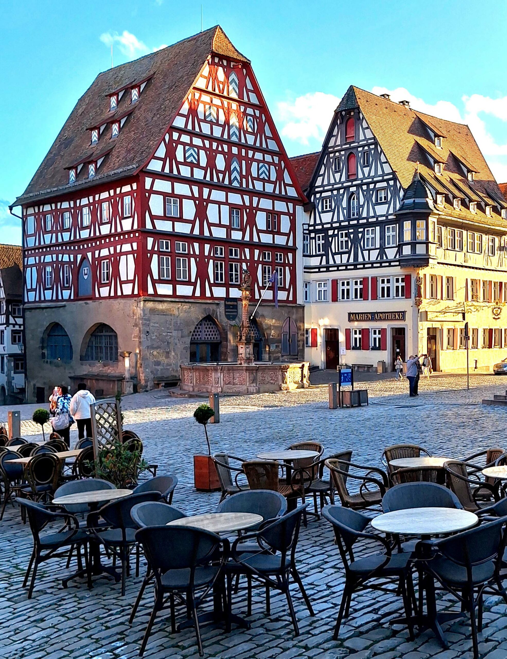 Ich schildere dem Barkeeper die Situation. Er zeigt vollstes Verständnis, ich eile zurück, schnappe die Geldbörse und bezahle mein Bierchen mit einem entsprechenden Bonus. Wir tauschen noch ein Lächeln aus und ab geht’s zum idyllischen mittelalterlichen Marktplatz. Hier starte ich meinen Rundgang.