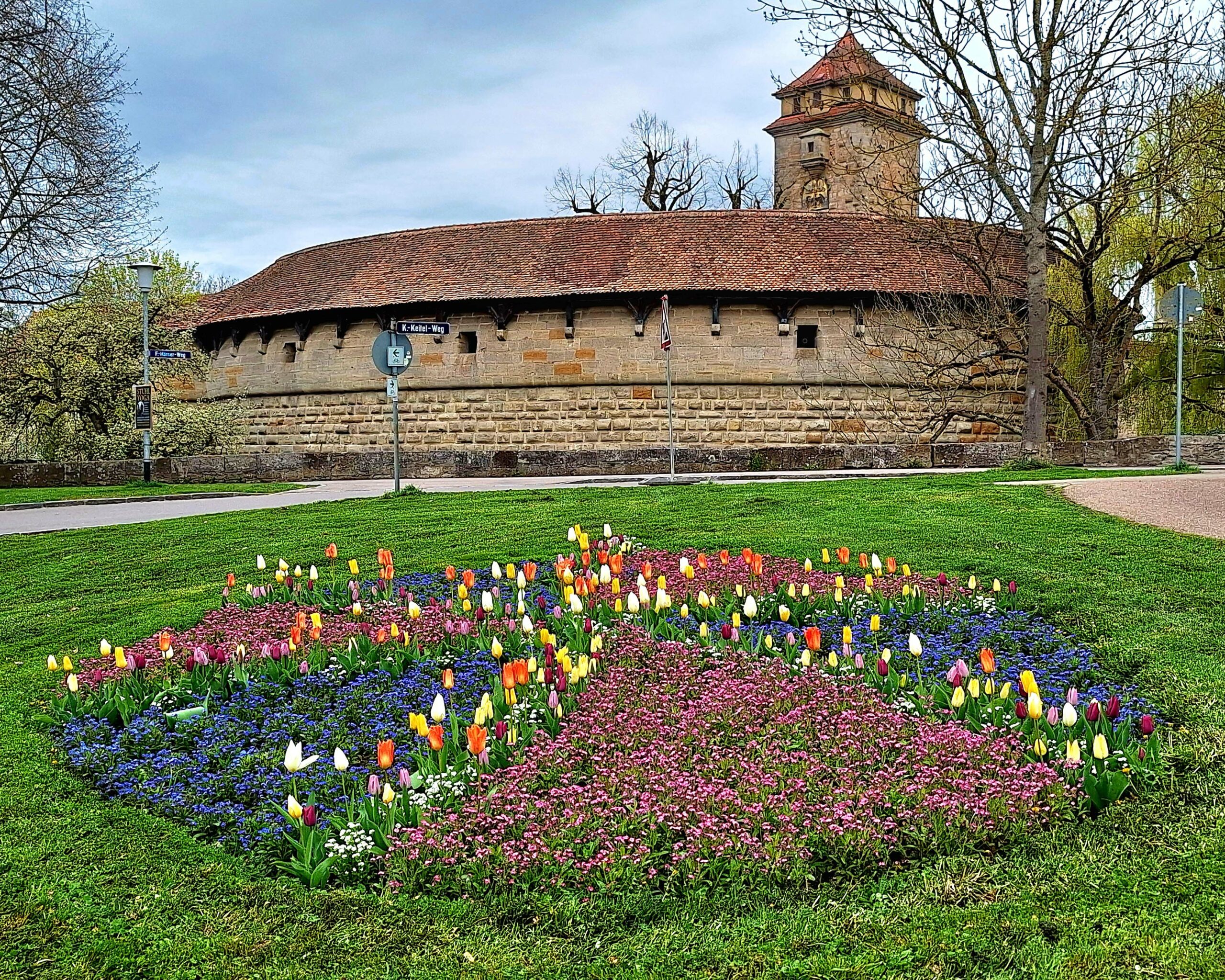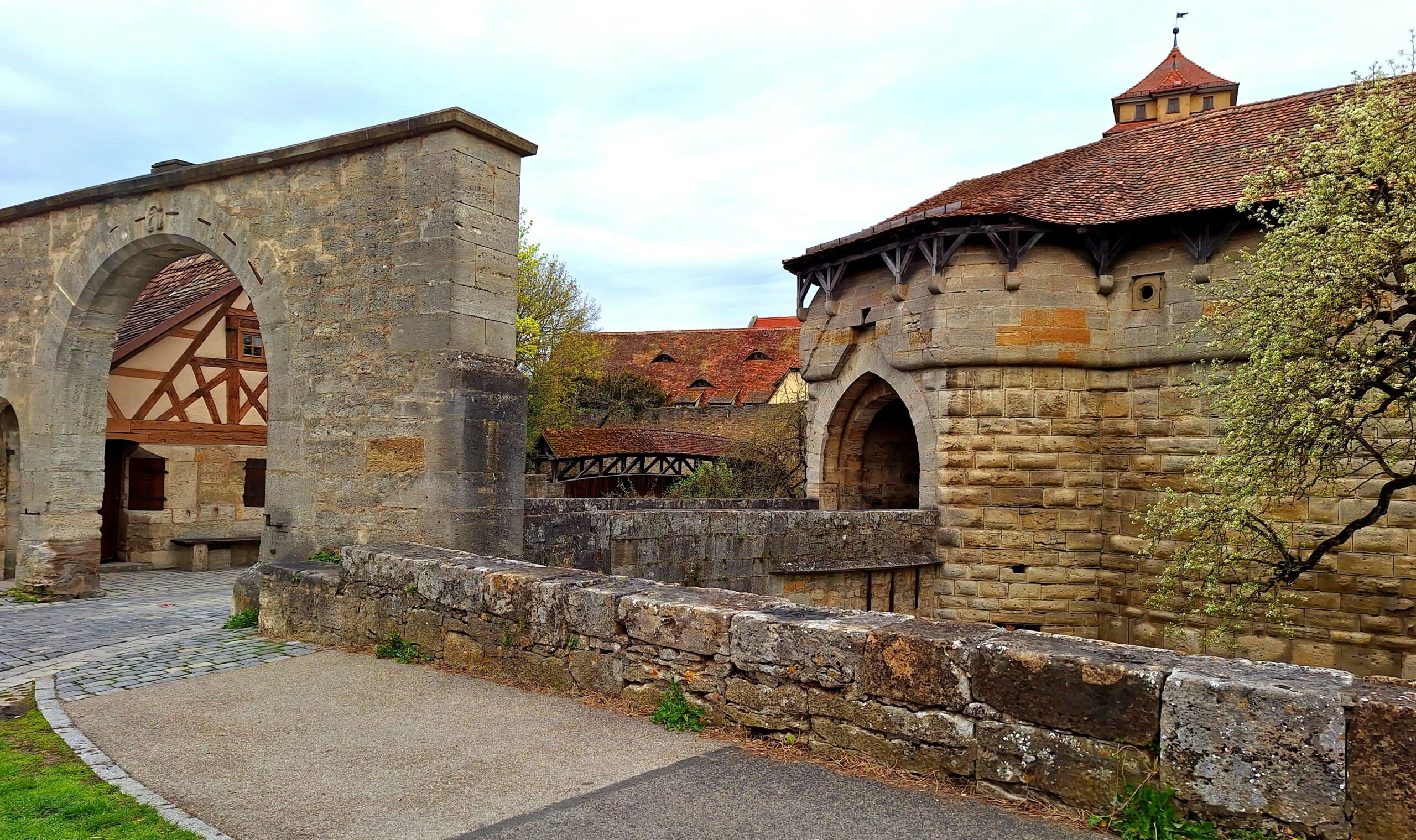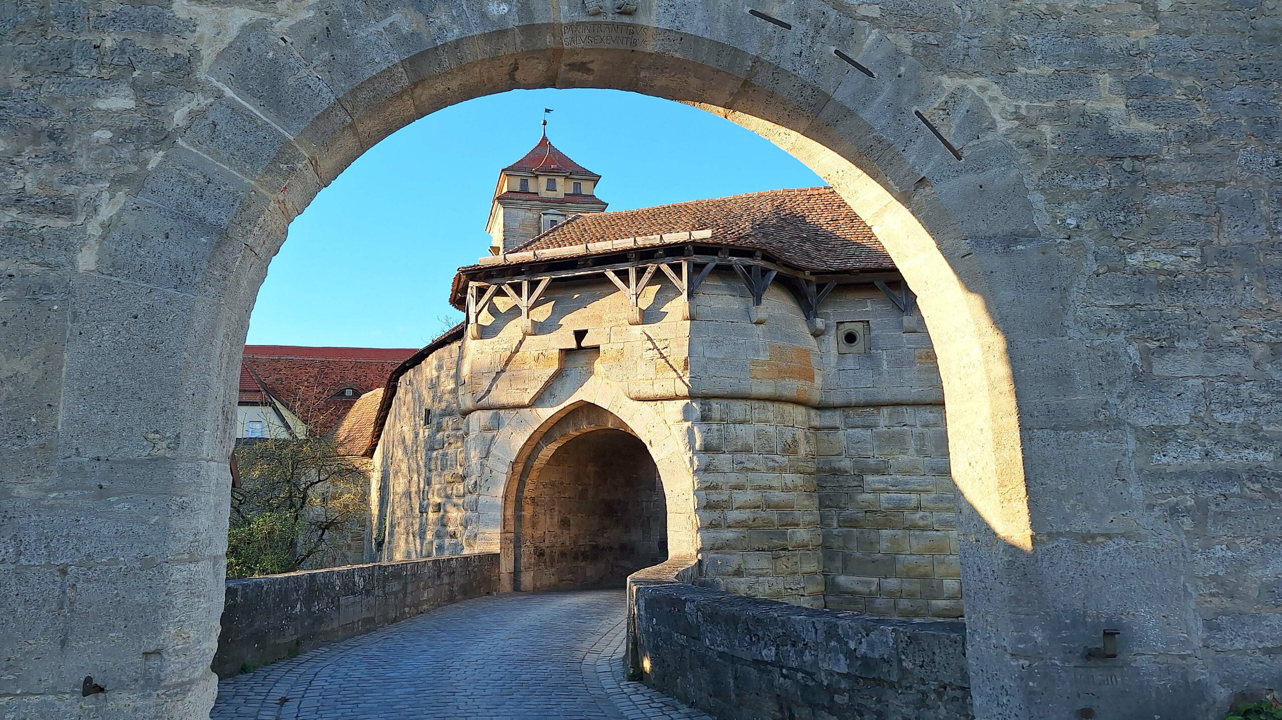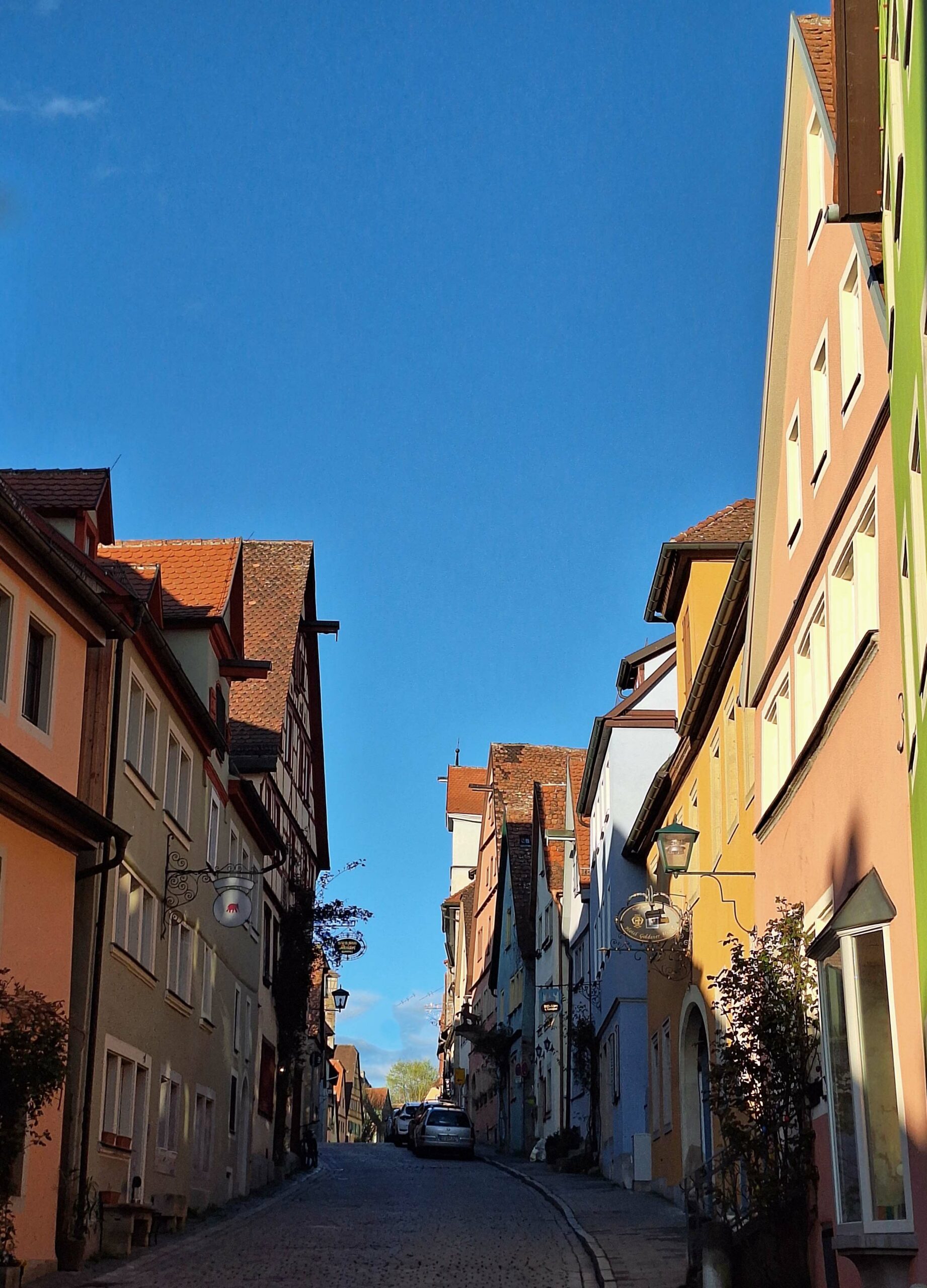 Die Sonne scheint auf das mittelalterliche Städtchen. Rothenburg ob der Tauber wird jährlich von bis zu 2 Mio. Besuchern überflutet. (Ich möchte nicht wissen, was hier los ist, wenn in wenigen Wochen die 750-Jahr-Feier startet! ) 🙈 Und deshalb möchte ich unbedingt schnell nochmal reinschauen, weil die meisten Touris sich jetzt in den Restaurants die Bäuche vollschlagen.