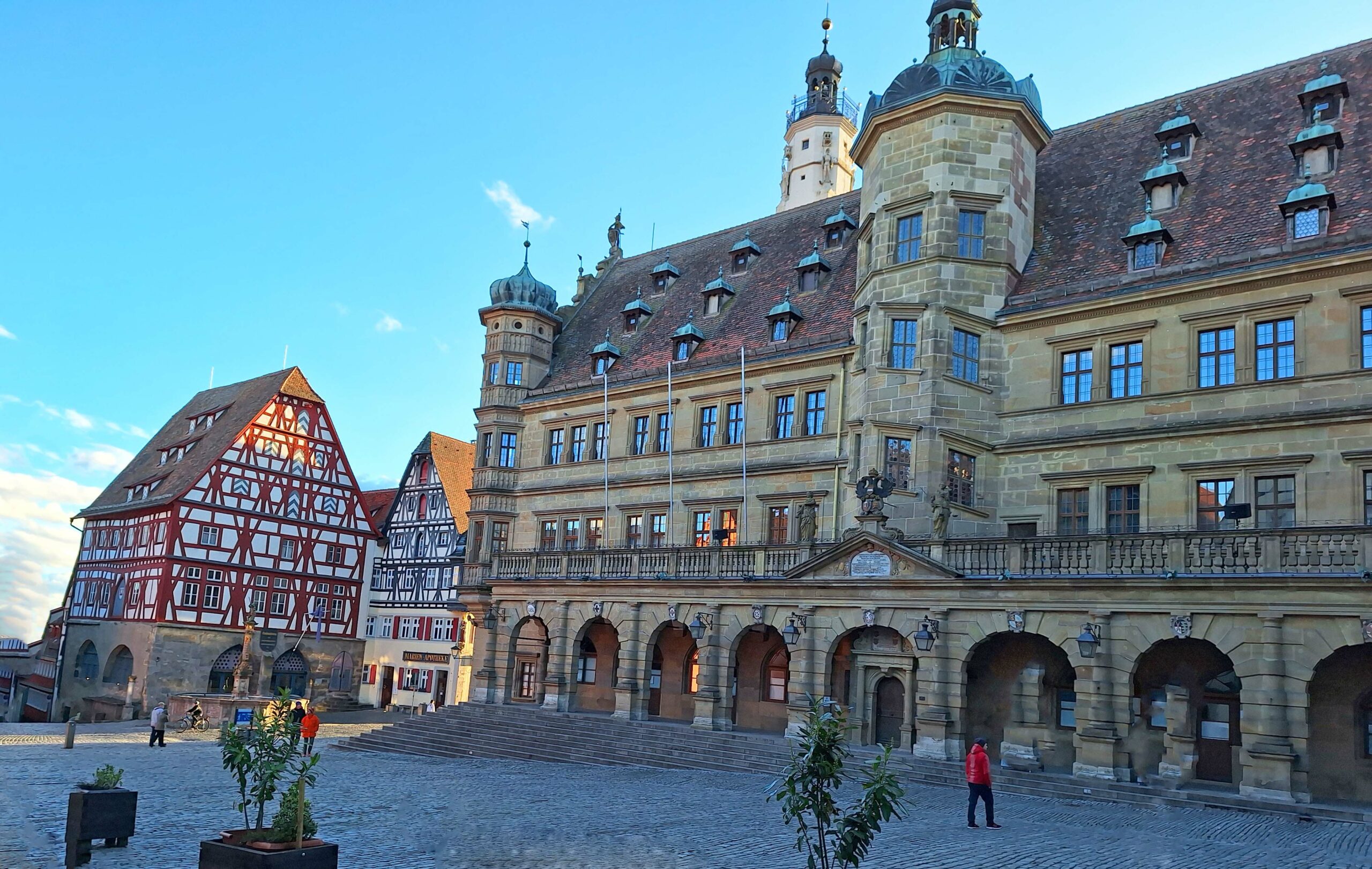 Nach dem Abstieg laufe ich zum Kreuzungspunkt der Jakobspilger – Santiago de Compostela – und gehe in die Jakobuskirche, um den berühmten Riemenschneider-Altar anzusehen. Kann man aber nicht so ohne Weiteres, man benötigt eine Eintrittskarte. Ich entscheide mich nach kurzer Überlegung wegen der fortgeschrittenen Zeit für ein „nein“.
