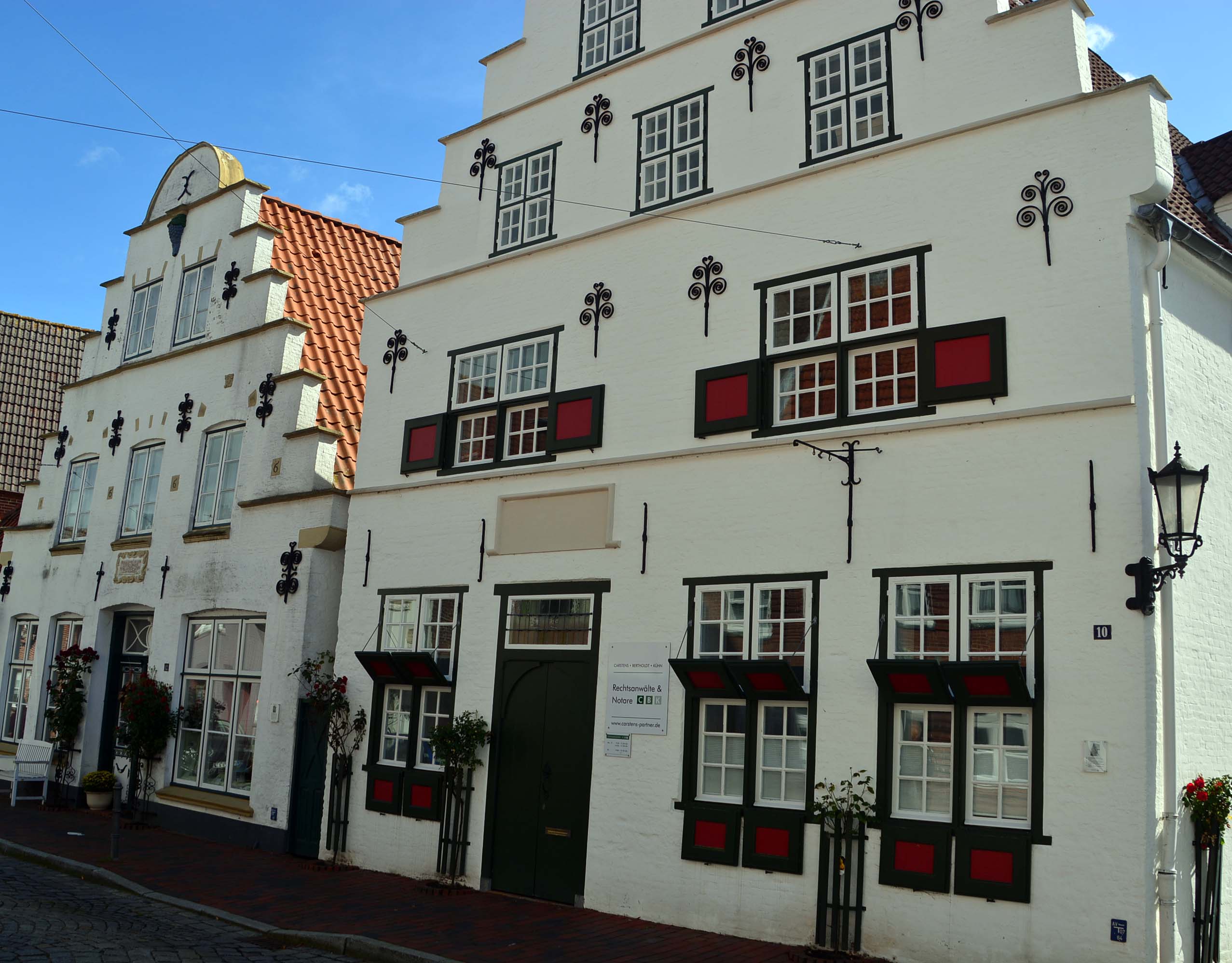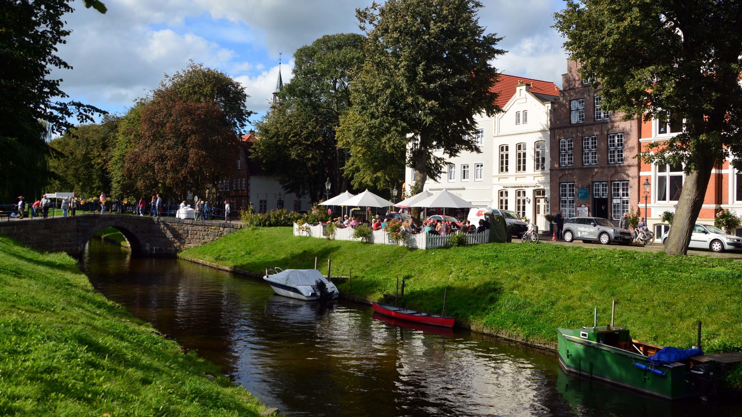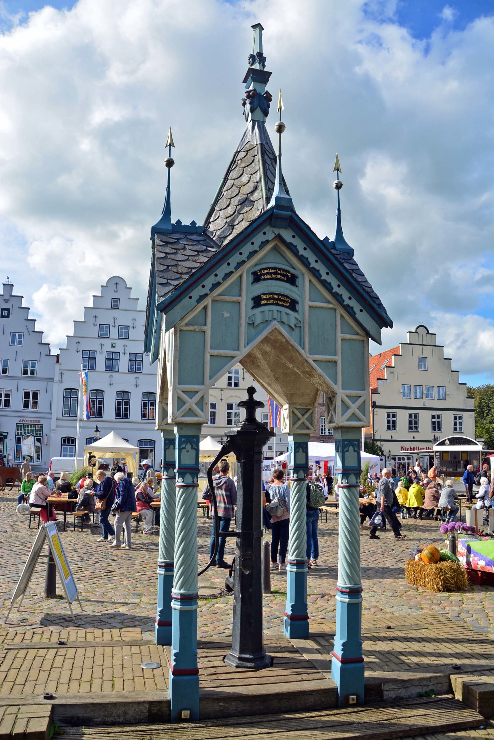 Letztes Ziel für den heutigen Tag ist Friedrichstadt – die kleine Holländerstadt. Sie liegt zwischen zwei Flüssen, der Eider und der Treene und heißt wegen ihrer Grachten und schnurgeraden Gassen so. Toll anzusehen sind die schmalen Häuser mit ihren Treppengiebeln, die neun, 400 Jahre alten Kaufmannshäuser an der Westseite des Marktplatzes, und das Wahrzeichen der Stadt, das blau-weiße Pumpenhäuschen von 1879 mit der Schwengelpumpe.