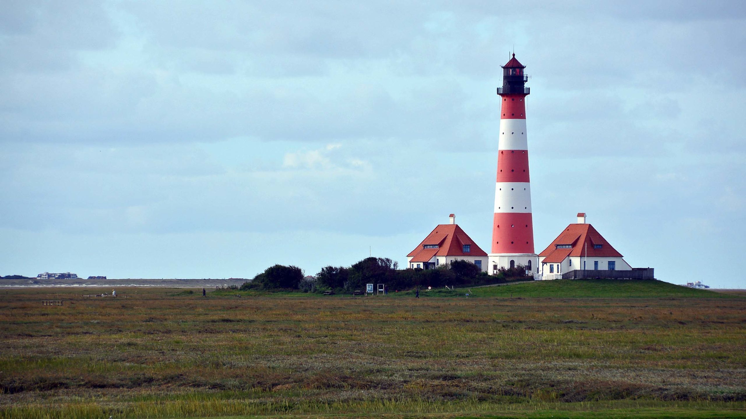 Und da steht er – in einiger Entfernung – stolz im Wind und am Meer, der rotweiß gestreifte Leuchtturm mit seinen beiden Wärterhäuschen, eingebettet in eine Bilderbuch-Salzwiesen-Landschaft. Der fast 42 Meter hohe Turm wurde 1906 erbaut und kann besichtigt werden. Seine Sicht beträgt bei gutem Wetter nachts bis zu 50 km. In Poppenbüll entdecke ich einen Mast mit den höchsten Wasserständen und die Kirche St. Stephanus auf einer Warft in der Nähe des Leuchtturms von 1370. Den langen Weg zum Turm erspare ich mir, das Programm ist straff heute.
