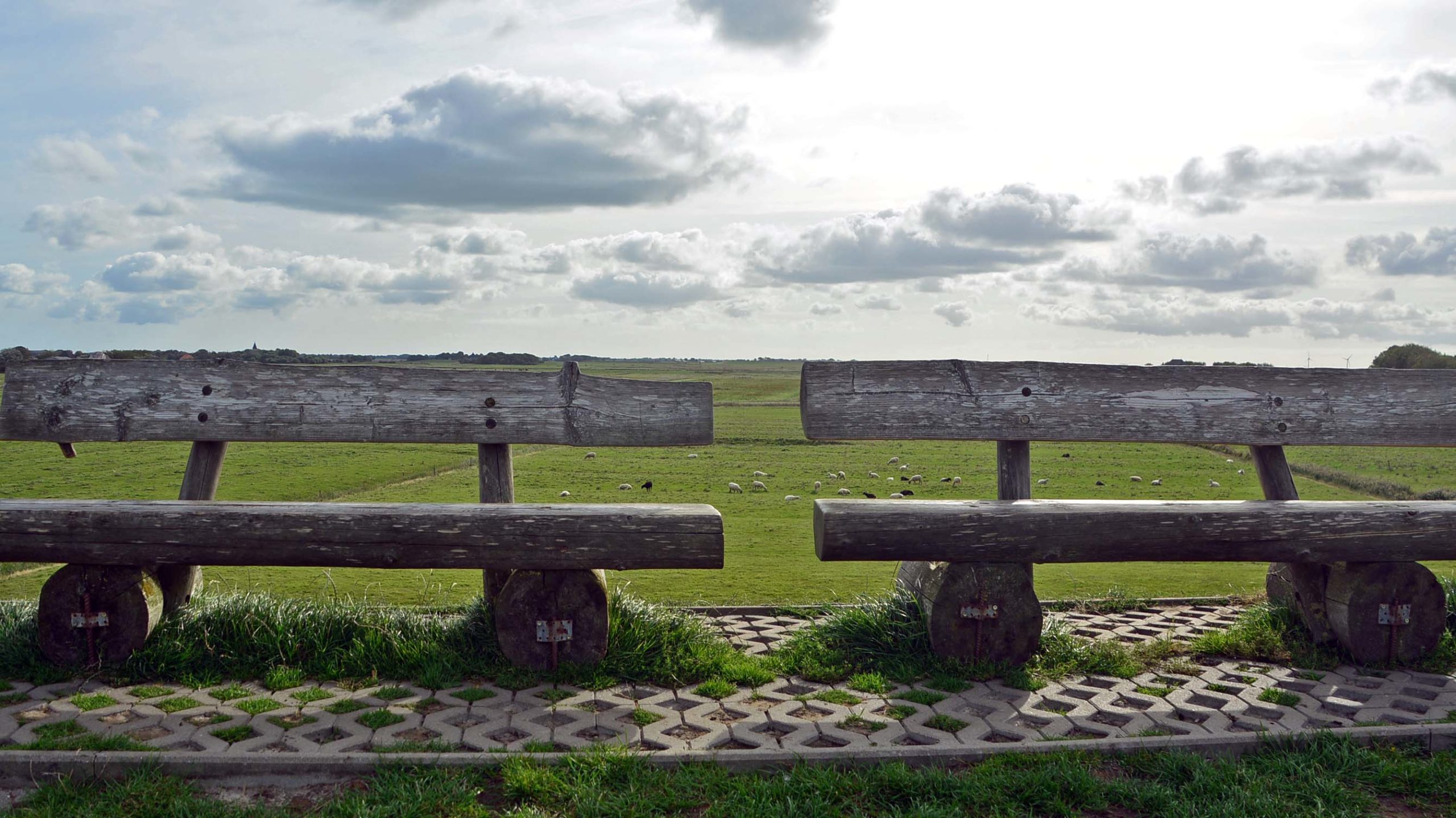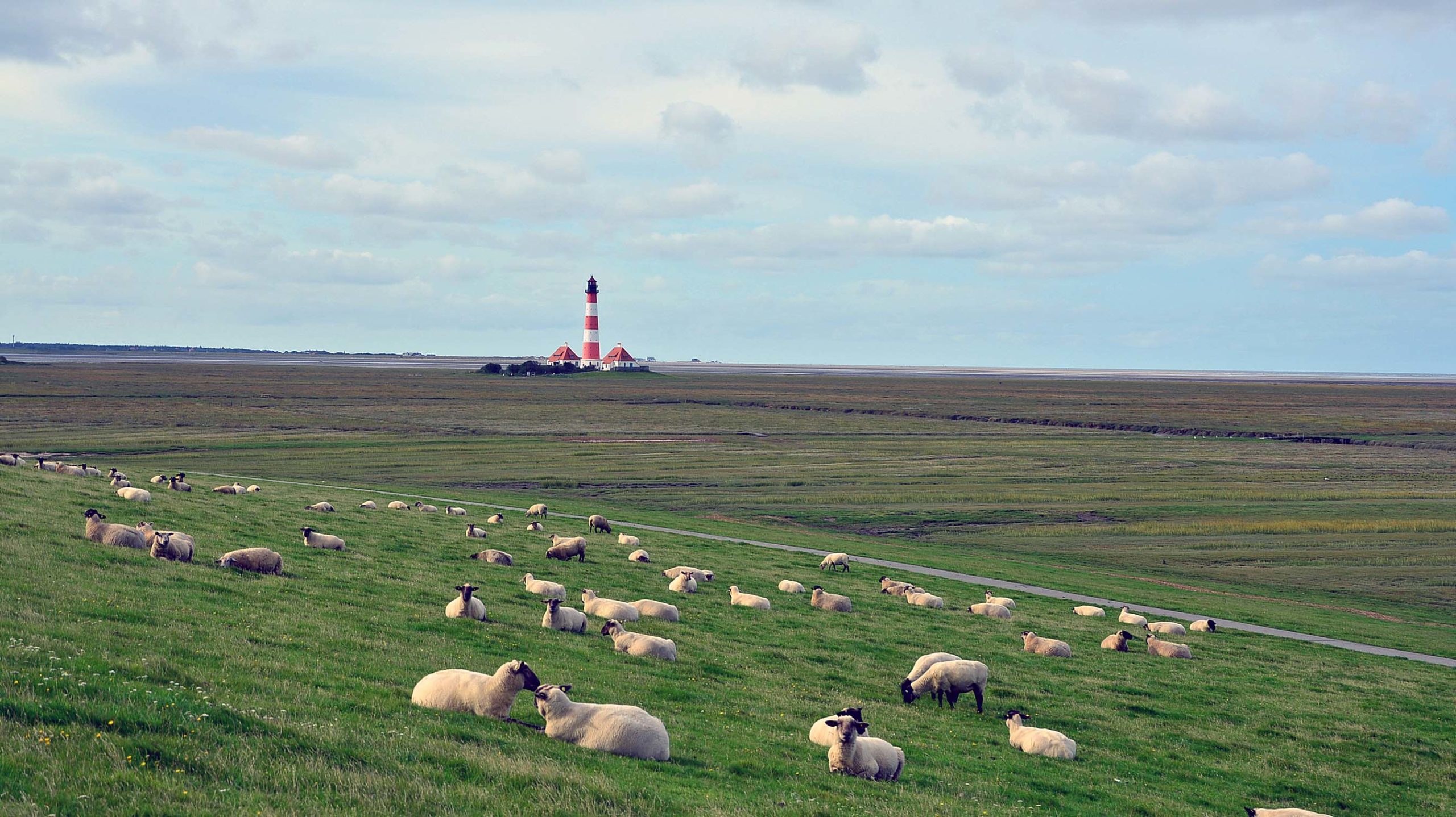 Das erste Ziel ist der meist fotografierte Leuchtturm Schleswig-Holsteins in Westerhever, Wahrzeichen der Halbinsel Eiderstedt. Eine halbe Stunde später fahre ich auf einen großen Parkplatz hinter dem Deich und kaufe in der Information eine Espressotasse. Jetzt geht’s zu Fuß weiter in Richtung Leuchtturm durch plattes Land, hinauf auf den Deich, vorbei an unendlich vielen Schafen. Zwischendurch – damit es nicht langweilig wird – gibt’s auch die eine oder andere Kuh und sogar ein Pferd! Die Sonne kann sich noch nicht richtig durchsetzen.