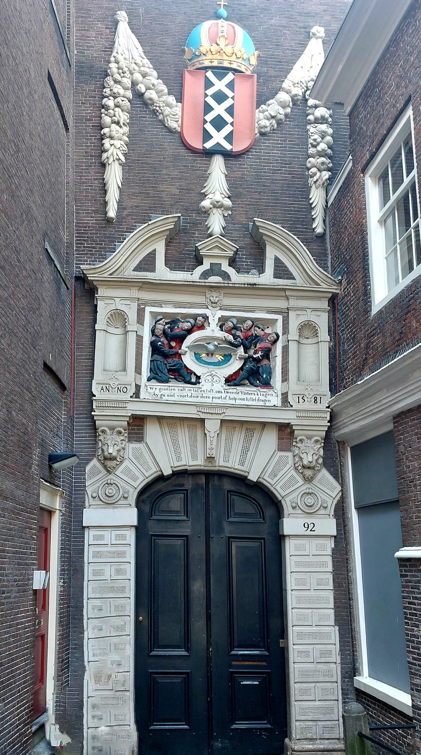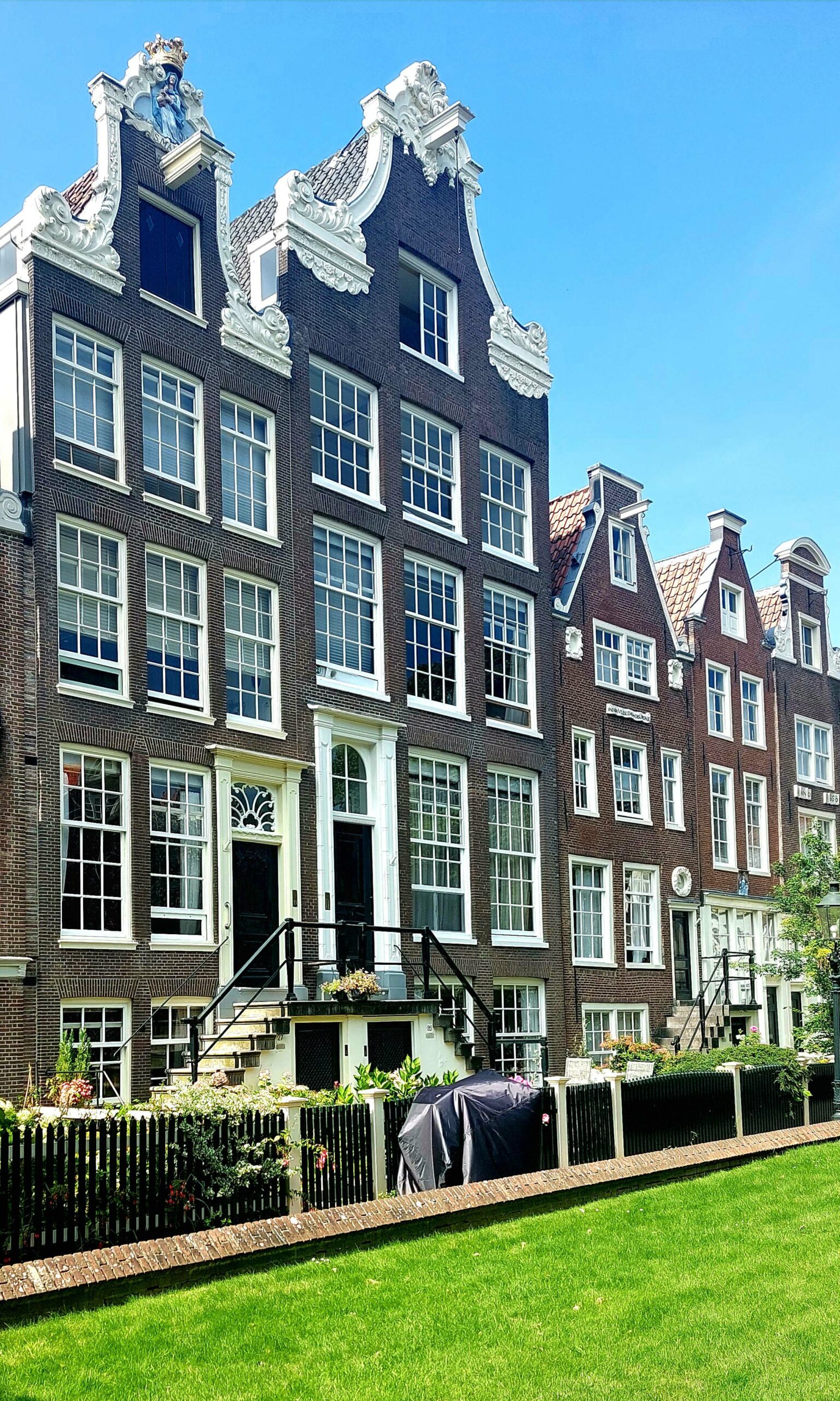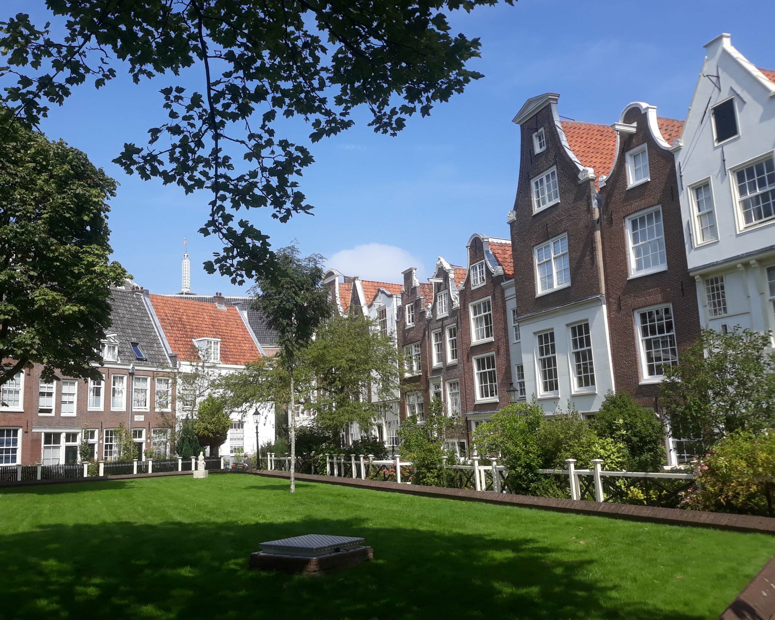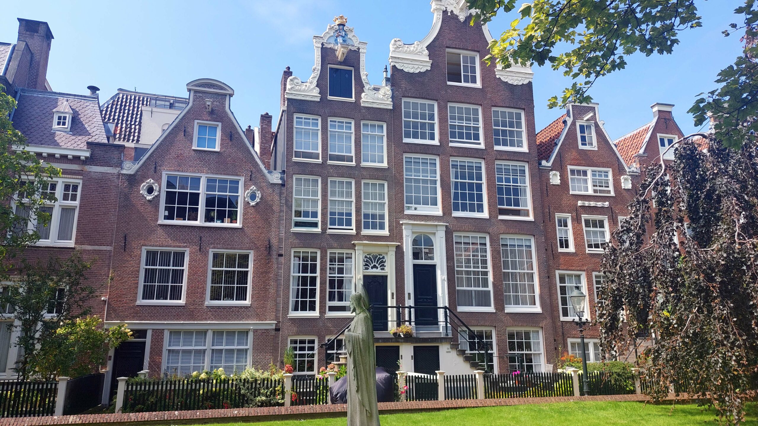 Wir machen uns jetzt auf den Weg zum sehr versteckt liegenden Begijnhof aus dem 14. Jahrhundert. Er ist der älteste und bekannteste von etwa zwei Dutzend Amsterdamer Hofjes. Es ist eine Oase der Ruhe: wenige Touris, eine kleine Kirche, schmale Giebelhäuser, Kastanienbäume, ein hübscher Garten und winzige Vorgärten. Hier wohnten alleinstehende, verwitwete und gläubige Frauen, die Beginen. Ein Juwel ist das „Houten Huys“, das älteste Holzhaus der Niederlande. Es stammt aus der Zeit um 1528, hat steinerne Seitenwände und eine hölzerne Vorder- und Rückfassade.