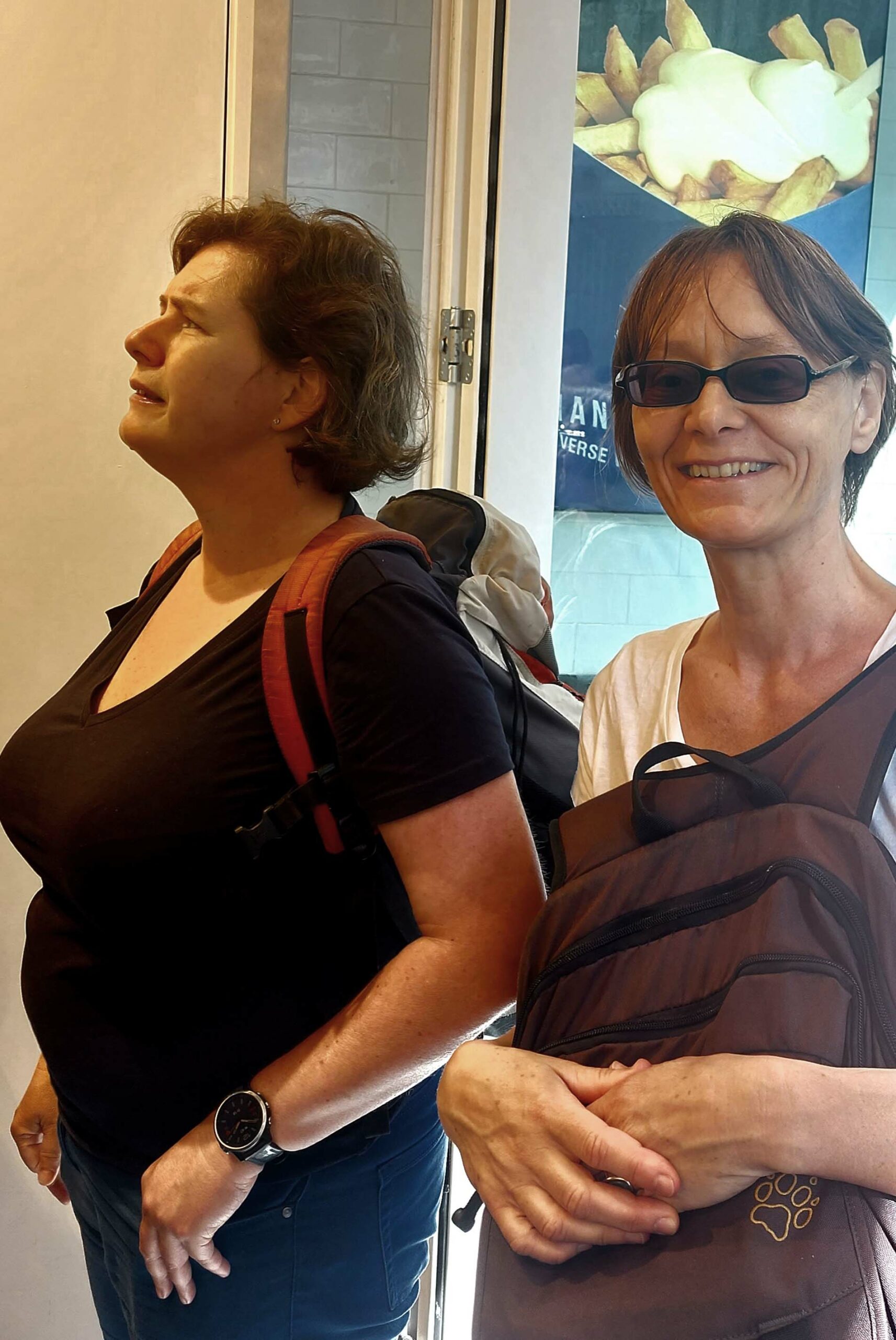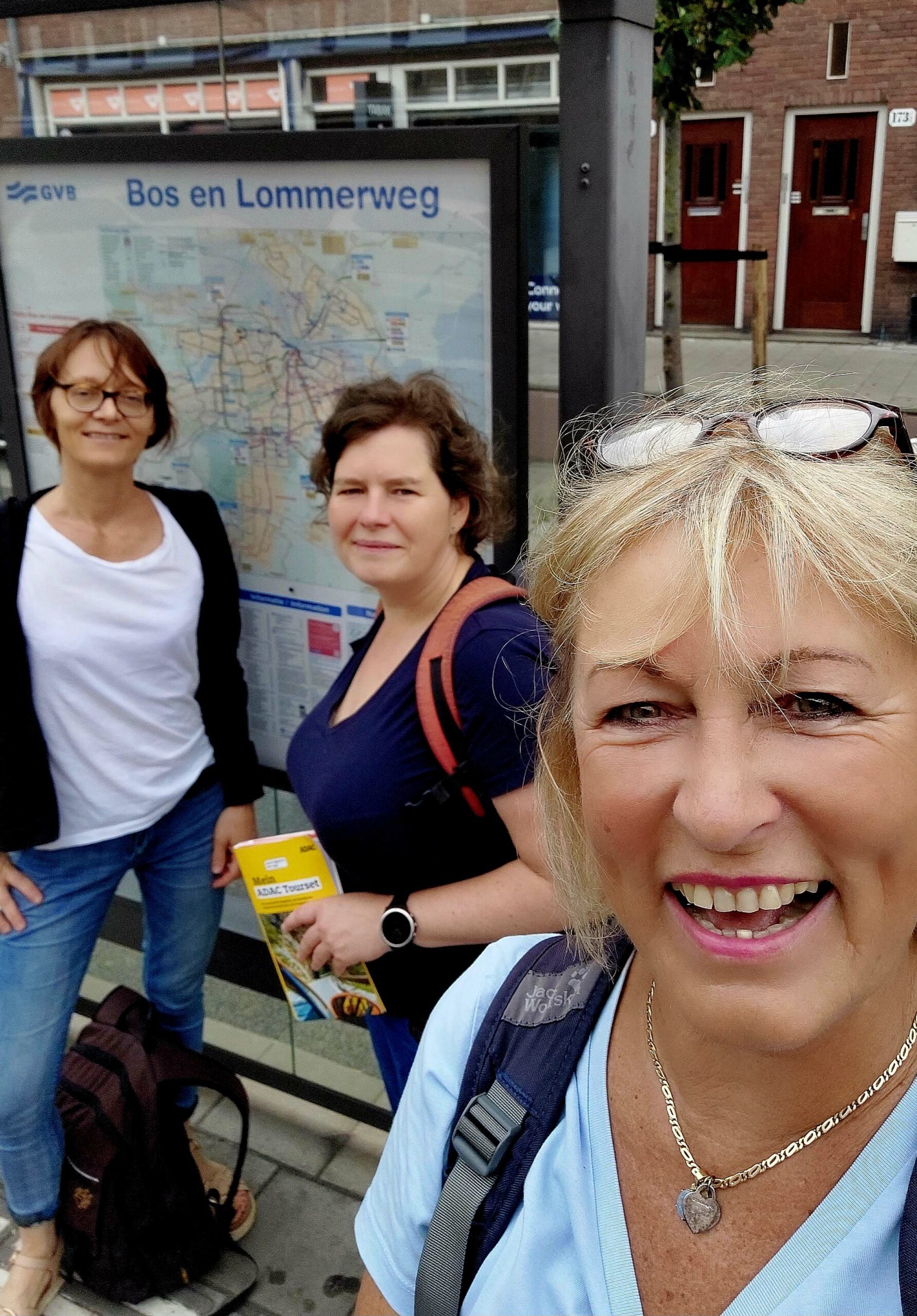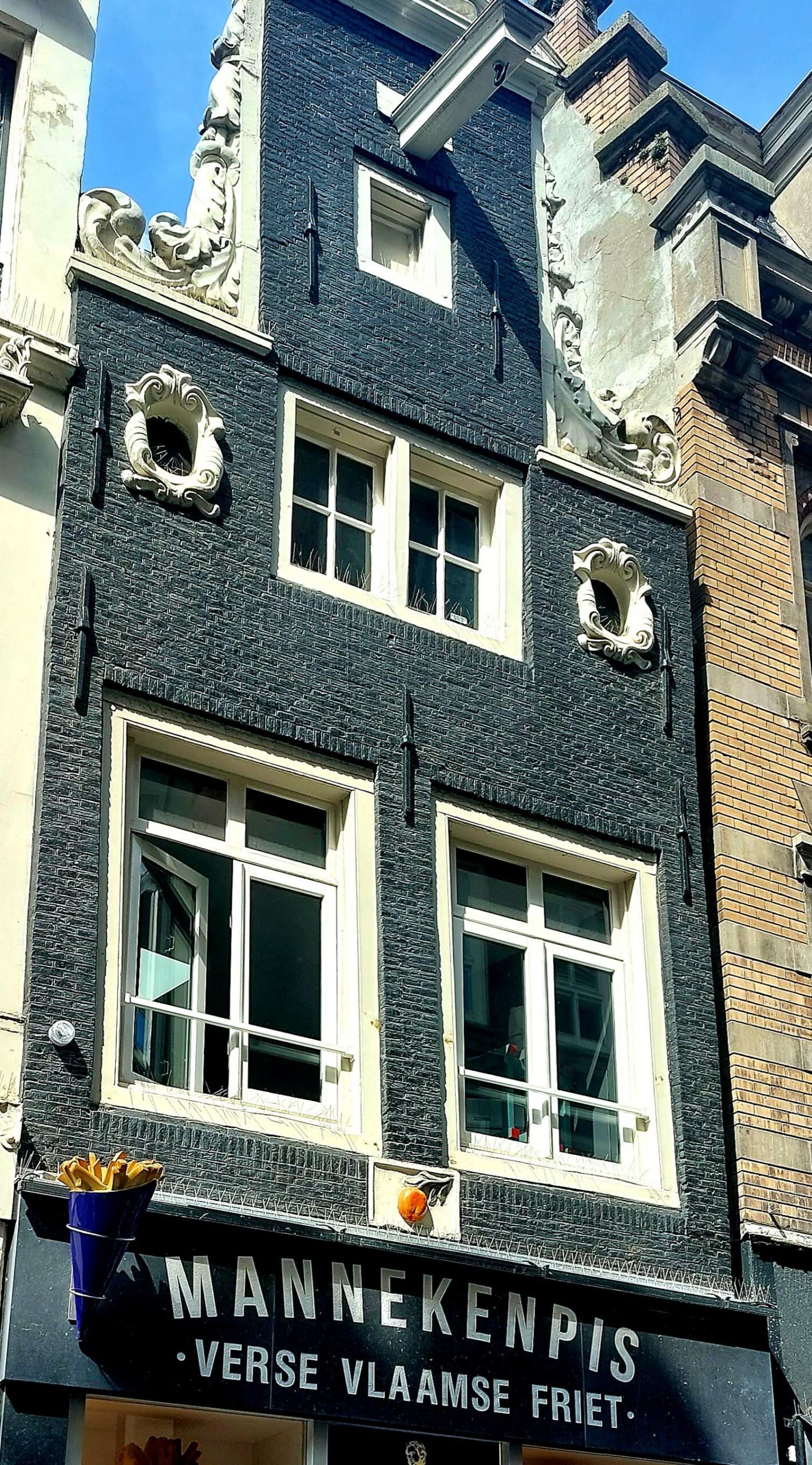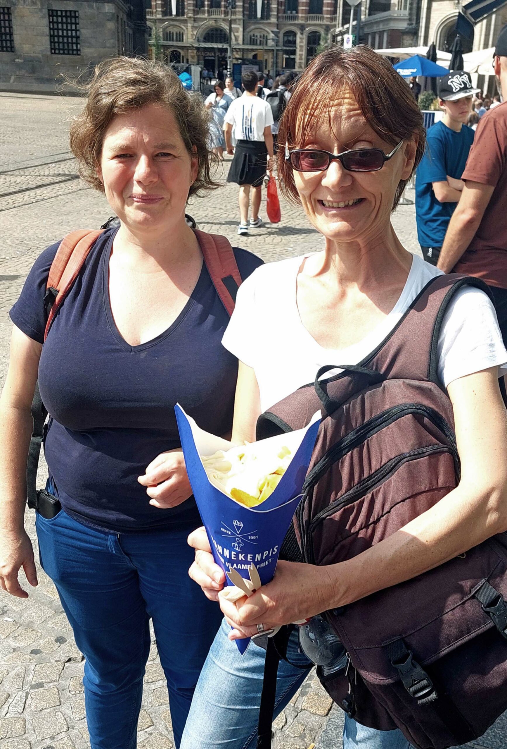 Aber Birgit und Ines haben nur Augen für eine ganz bestimmte Frittenbude, das „Manneken Pis“, angeblich der beste Pommes-Schuppen 🍟🍟 in ganz Amsterdam! Großen Hunger darf man hier nicht haben. Weil die Warteschlange immer ellenlang ist, droht im schlimmsten Fall der plötzliche Tod. 💀 Die Mädels sind Feuer und Flamme und seeeehr hungrig. Sie stellen sich an für eine Tüte „Friets to go“. Ich schnuppere in der Zwischenzeit ein bisschen auf dem Dam herum. Er ist die Keimzelle der Stadt, also das Gelbe vom Ei!!
