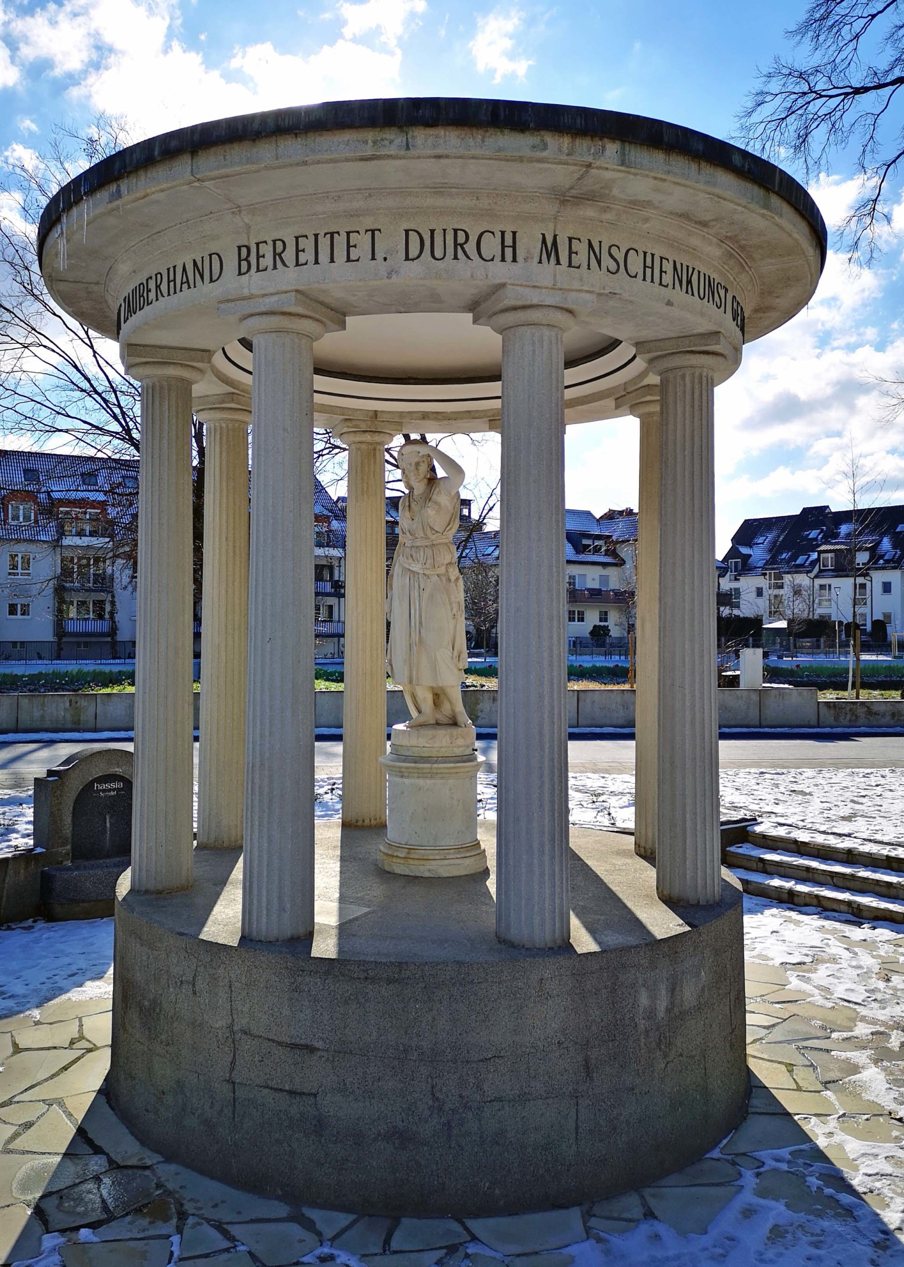 Der Hassia-Sprudelbrunnen ist wegen der Großbaustelle zur Erneuerung des Kurparks zur Zeit ‚geschlossen‘. Das ist der lieblichen Figur im Brunnentempel relativ egal, denn ihr Blick richtet sich ausschließlich zur Sonne.