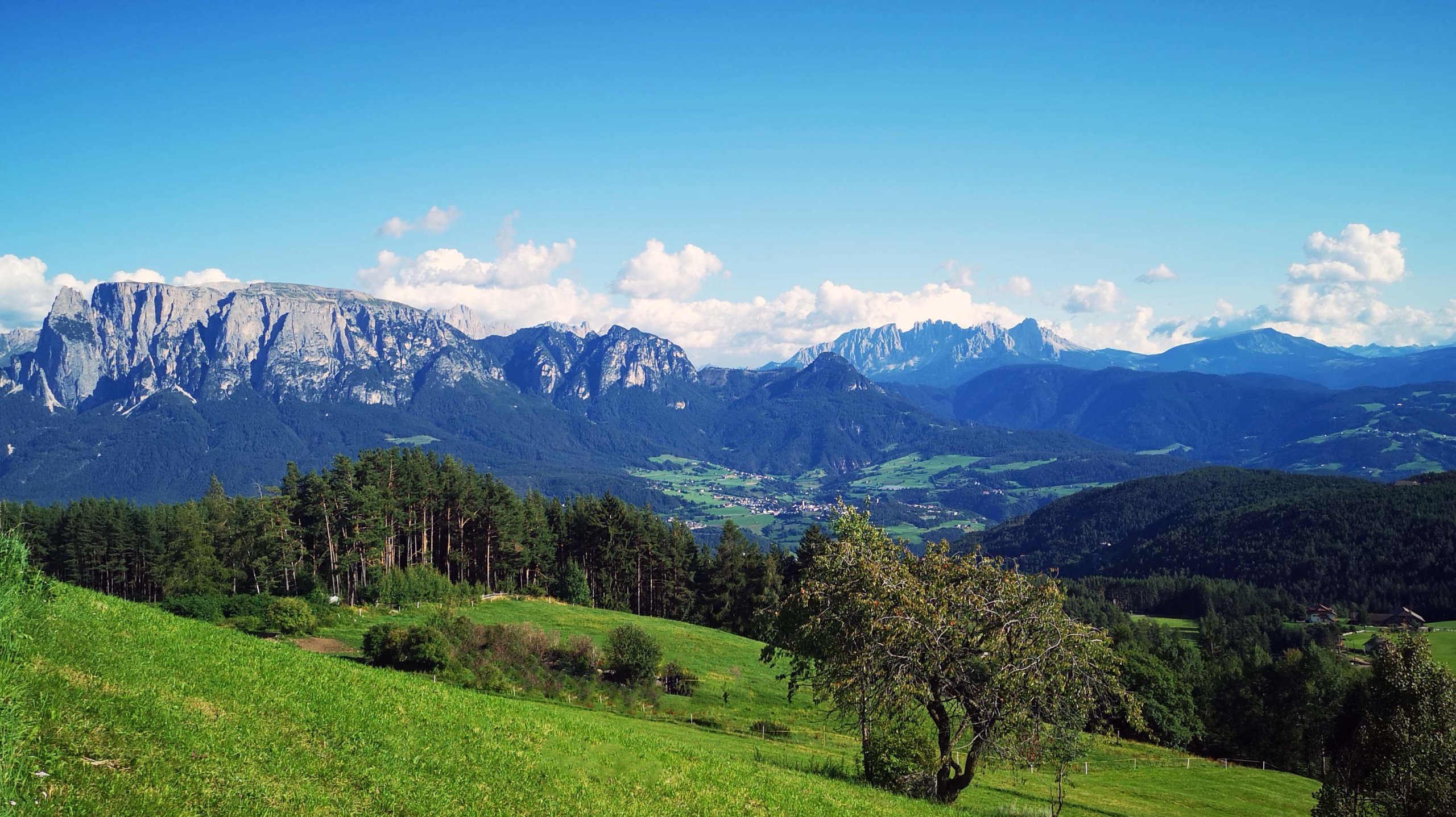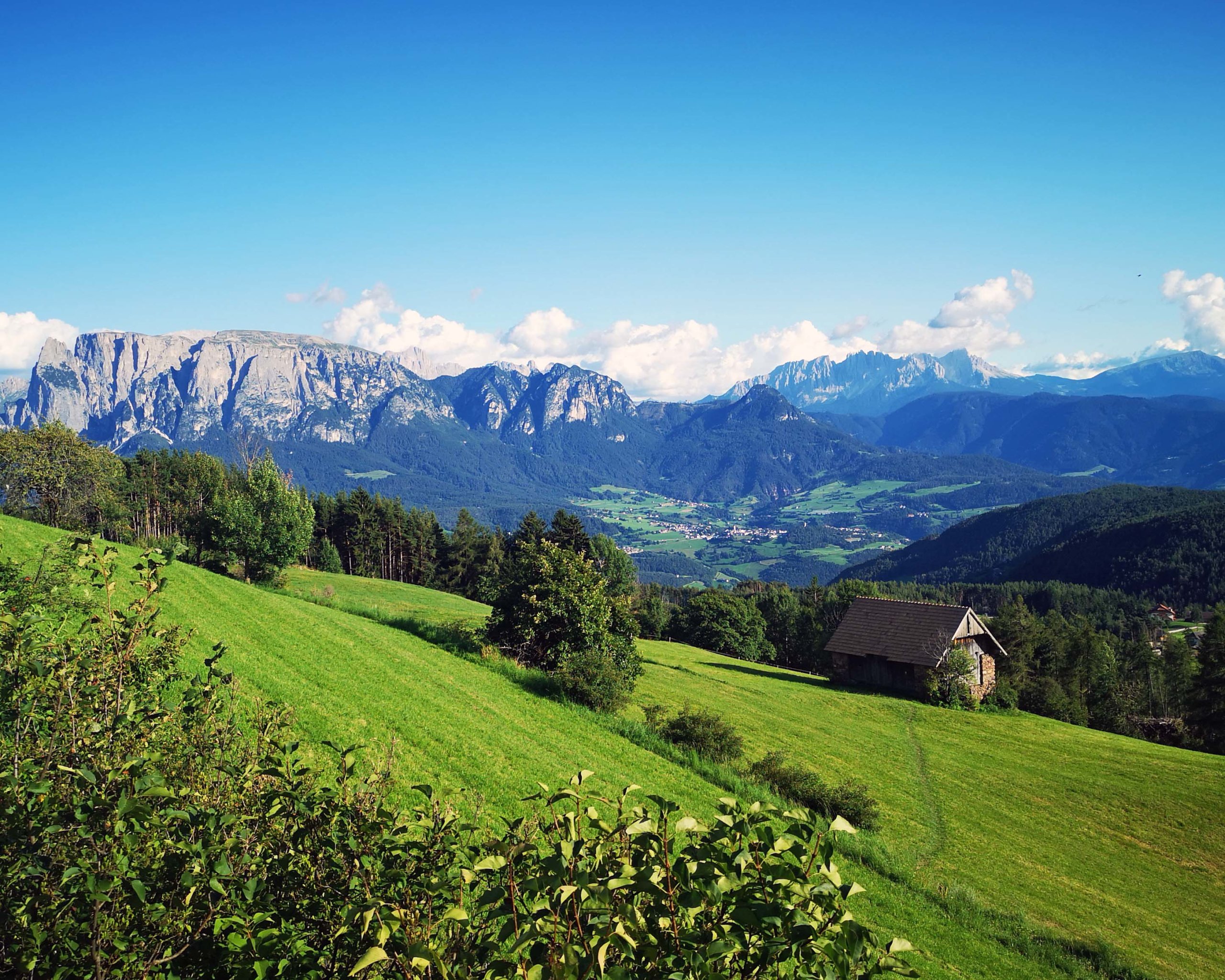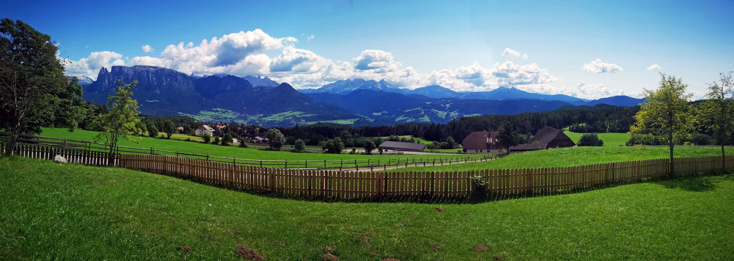 Wir sitzen im Garten und haben einen malerischen Ausblick auf das Eisacktal, den Schlern, die Geislerspitzen, den Sellastock und den Lang- sowie den Plattkofel.