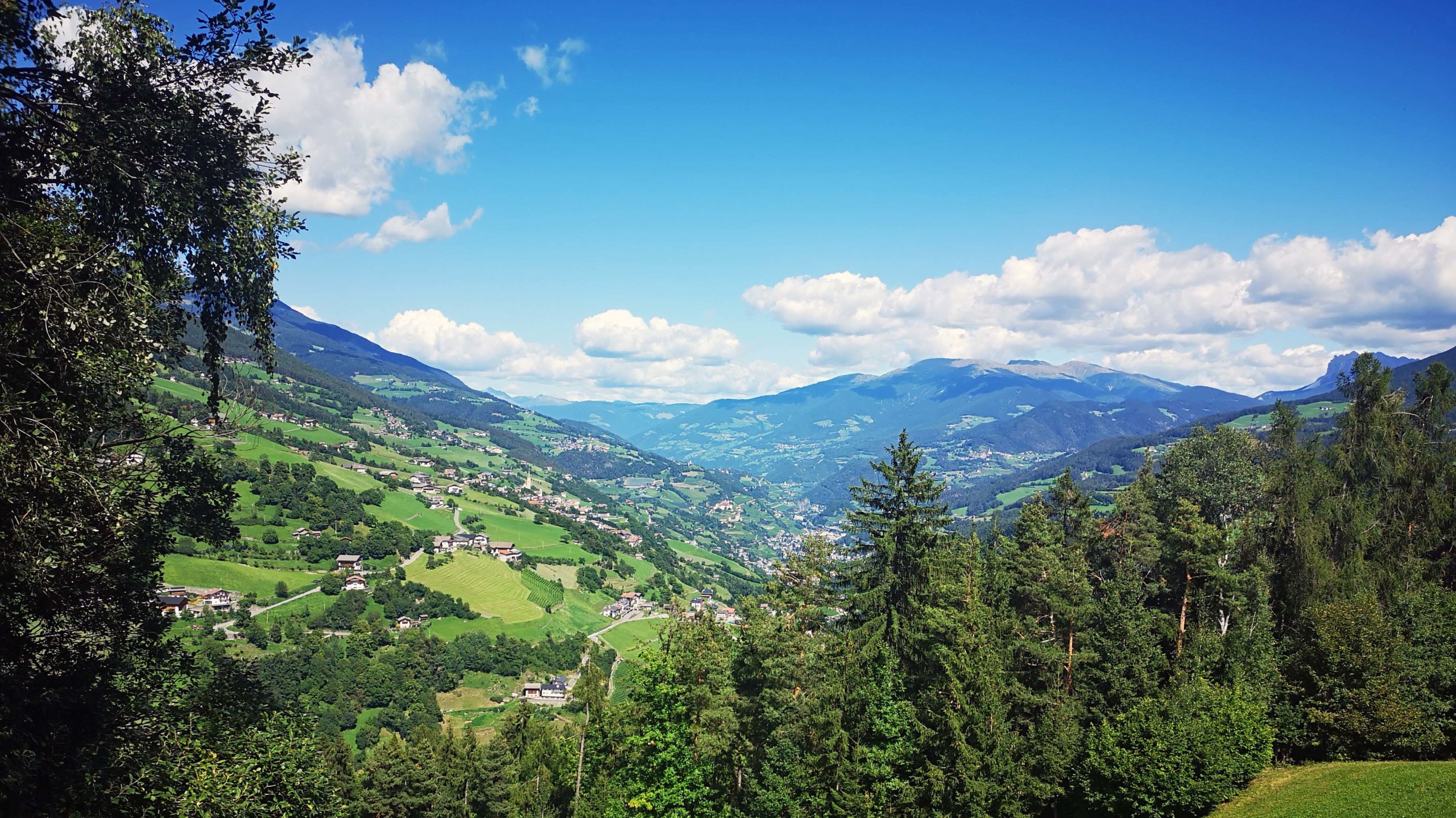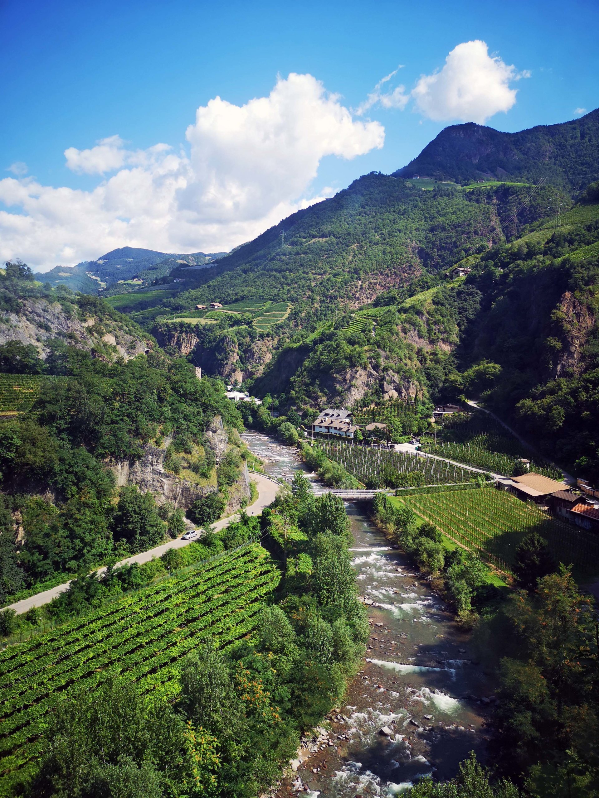 Immer wieder stoppen wir die Fahrt, um uns an dem satten Grün und dem hammermäßigen Bergpanorama zu ergötzen. Aus immer anderen Blickwinkeln sehen wir einen Teil der Dolomiten, nur der Hexenberg Schlern ist immer dabei. Mangels Parkmöglichkeiten hält Manfred mal eben mitten auf der Straße an, damit wir Frauen zu unseren Bildern kommen. Wir erreichen Barbian im südlichen Eisacktal mit der neuen Barbianer Hängebrücke über den Ganderbach. Der schiefe Kirchturm des Städtchens ist nachweislich schiefer, als der Turm von Pisa!!!