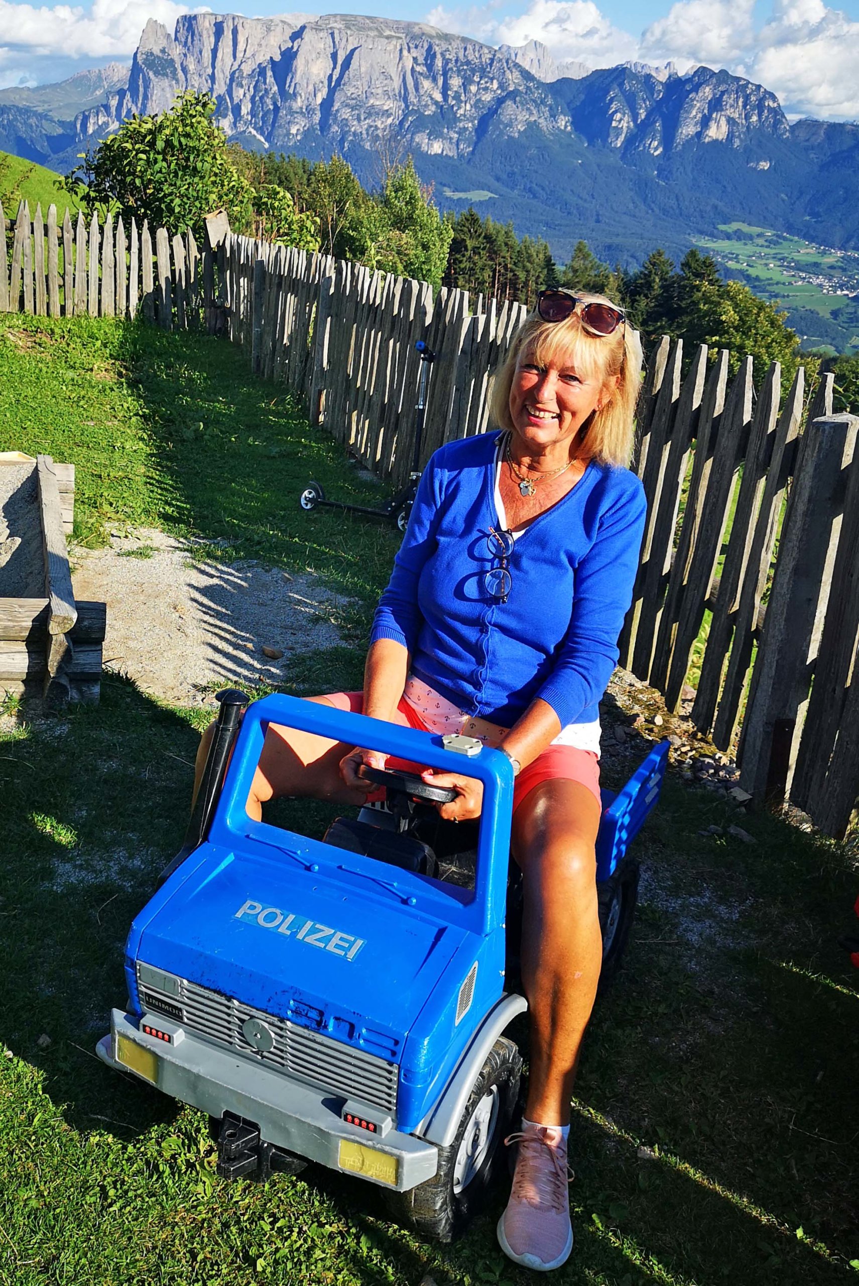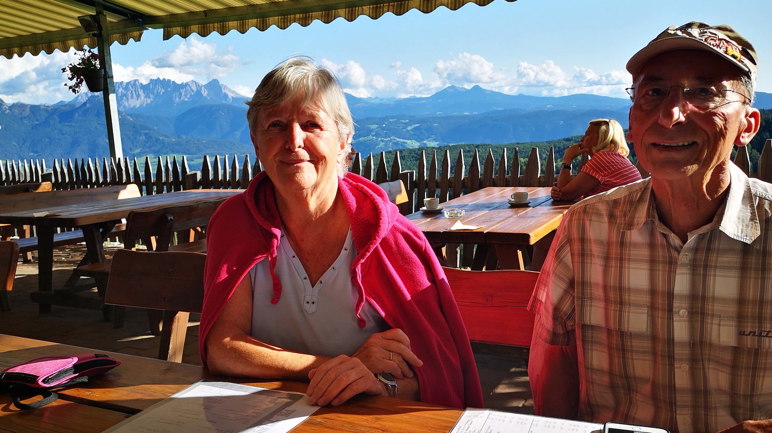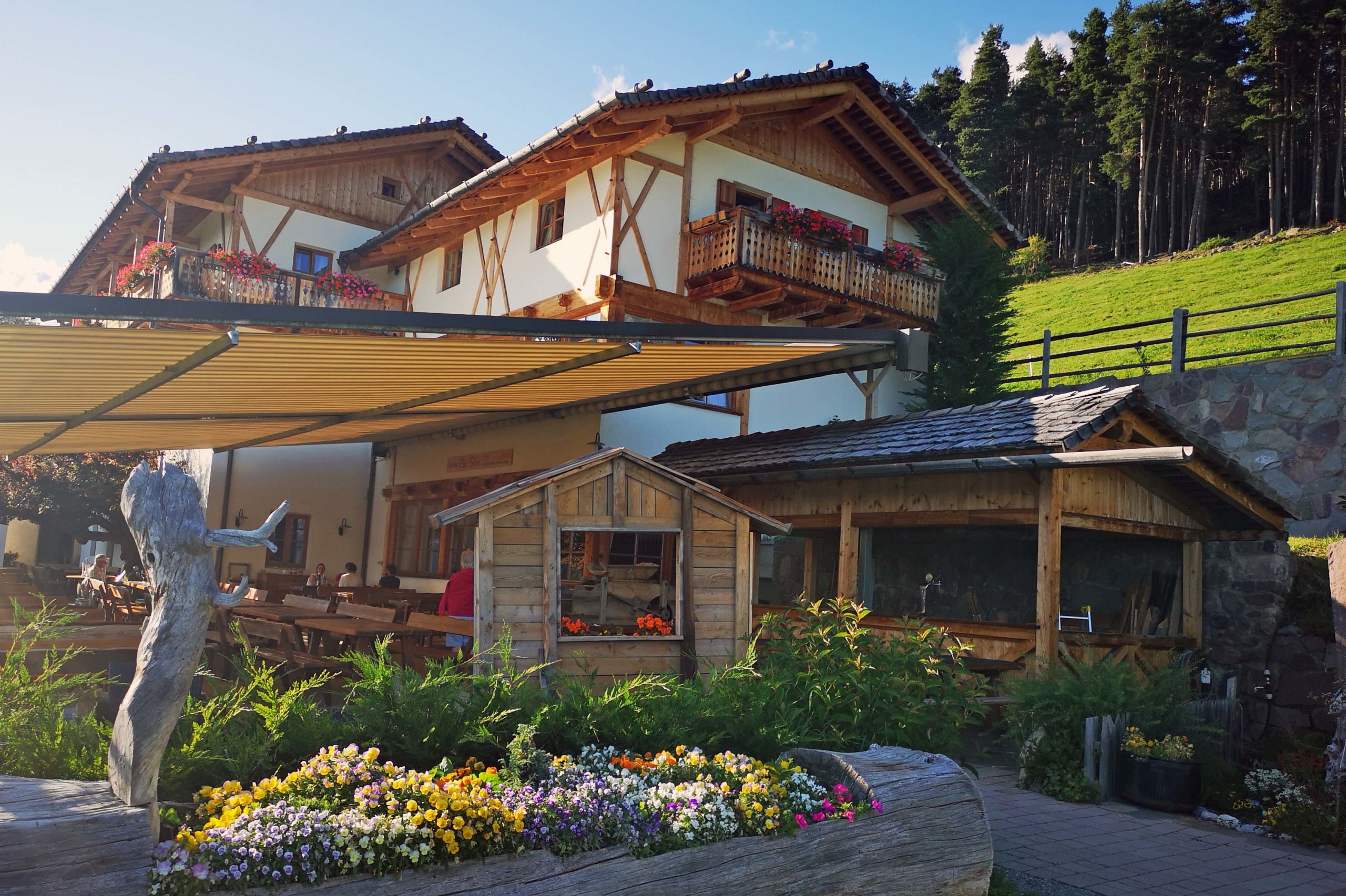 Und auch jetzt fahren wir wieder durch sanfte Hügel auf sehr schmalen Sträßchen zum „Gasthaus Bad Siess“, das von sich behauptet, das schönste Ausflugsziel in Südtirol auf dem Rittner Hochplateau zu sein! Der Panoramagasthof ist umgeben von den Dolomiten und liegt in der Nähe der Seilbahn zur Schwarzseespitze auf dem Ritten. Er hat eine fantastische Sonnenterrasse in einmaliger Panoramalage und liegt auf 1450 Metern. Leider sind wir zum Sonnenbaden schon fast zu spät und es wird kühl im Schatten in dieser Höhe. Wir speisen vorzüglich, und begießen den wunderschonen Tagesausflug.