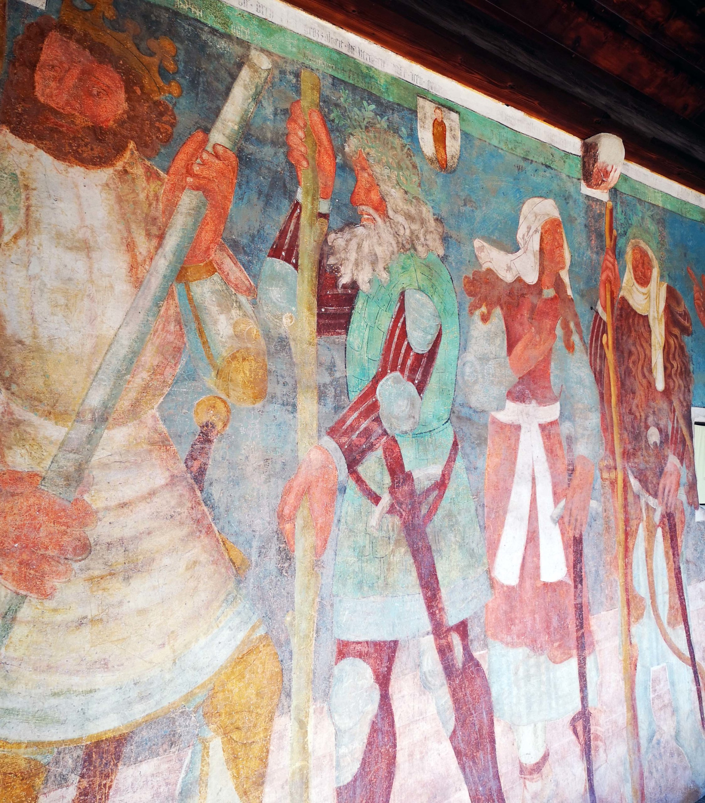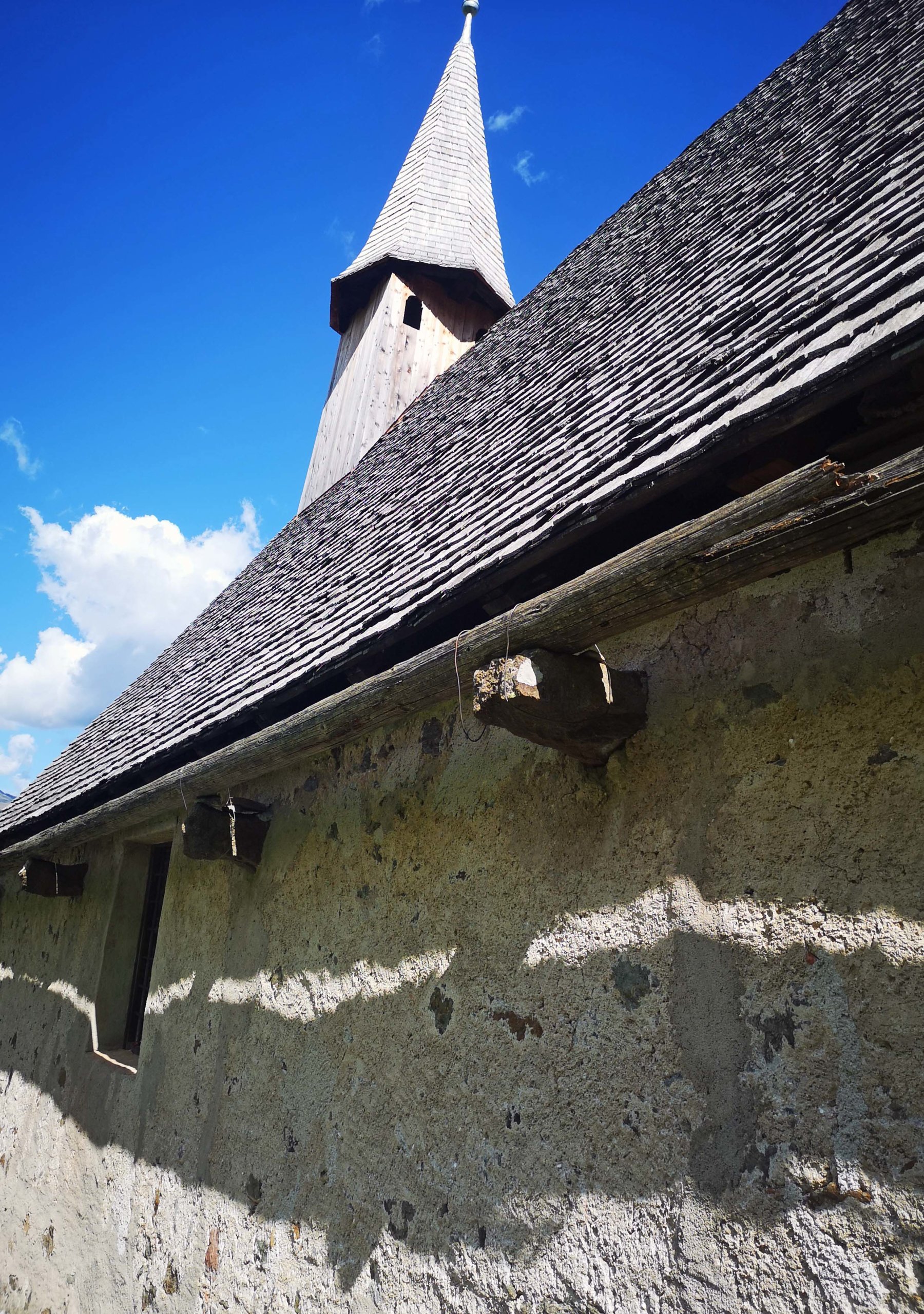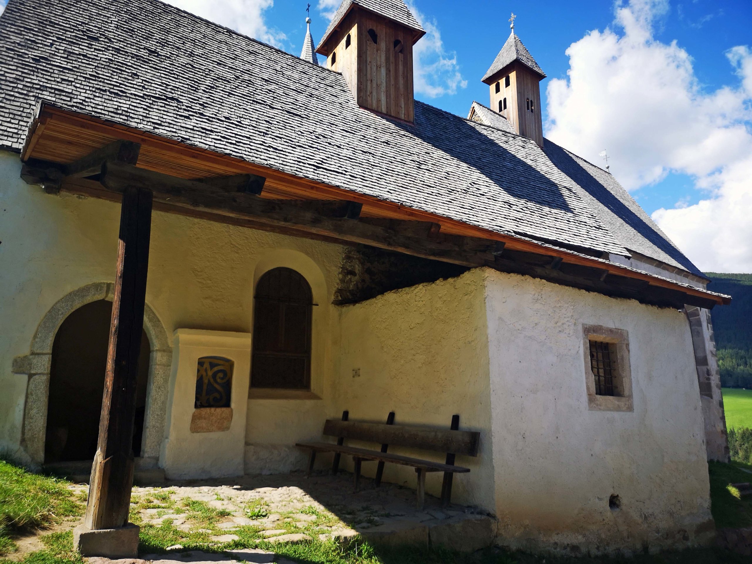 Hier bestaunen wir die ‚Drei Kirchen‘, die trotz unterschiedlicher Bauzeit ineinander verschachtelt aber eigenständig sind. Sie haben ein gemeinsames hölzernes Schindeldach. Im Innern verbergen sich wunderschöne gotische Flügelaltäre und Fresken der spätmittelalterlichen Brixner Schule.