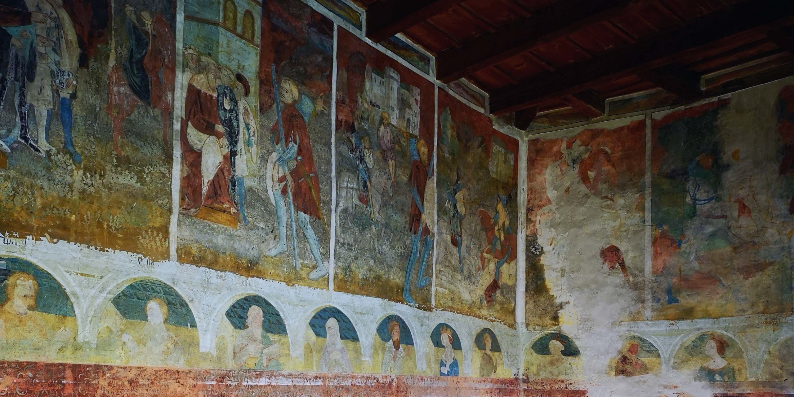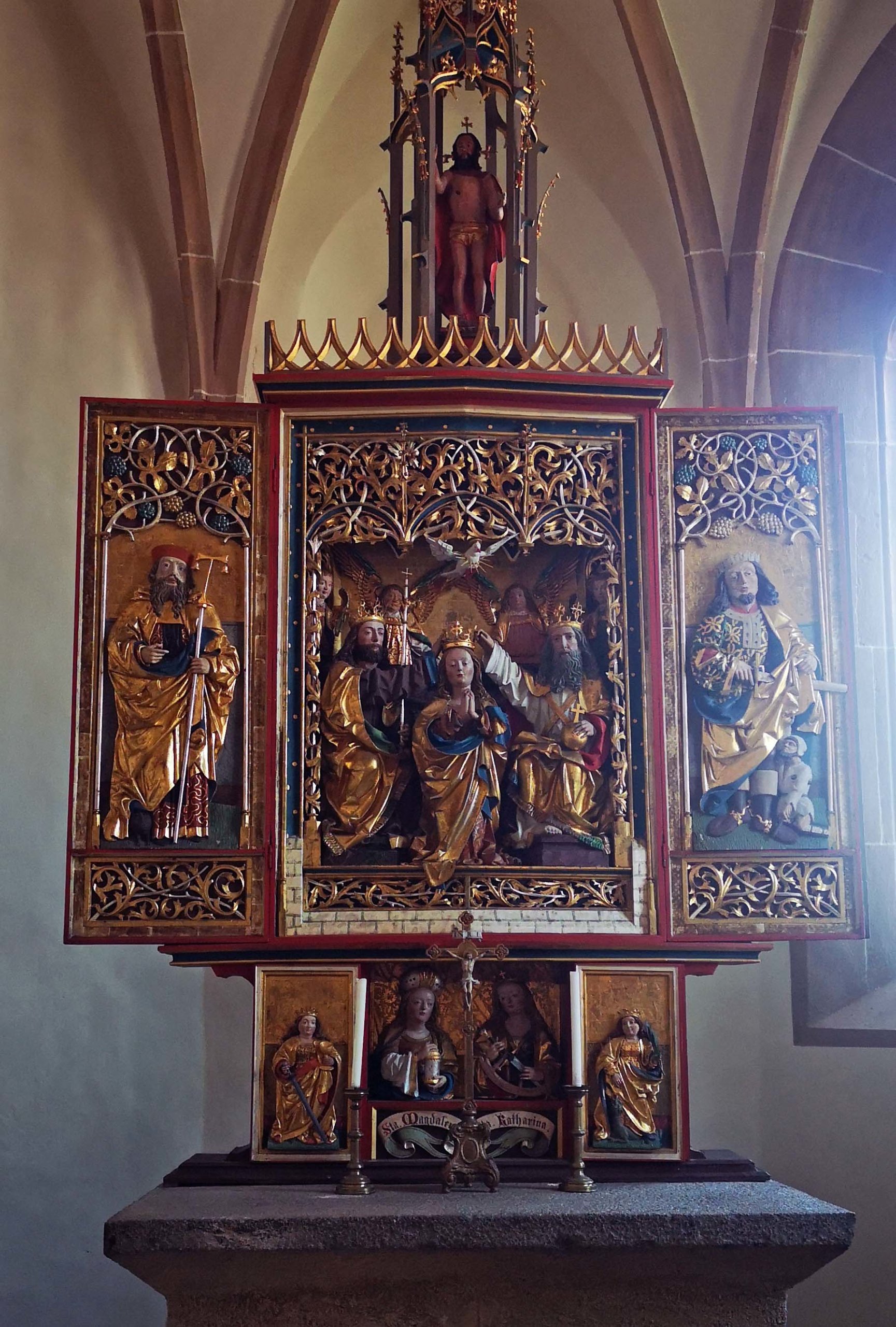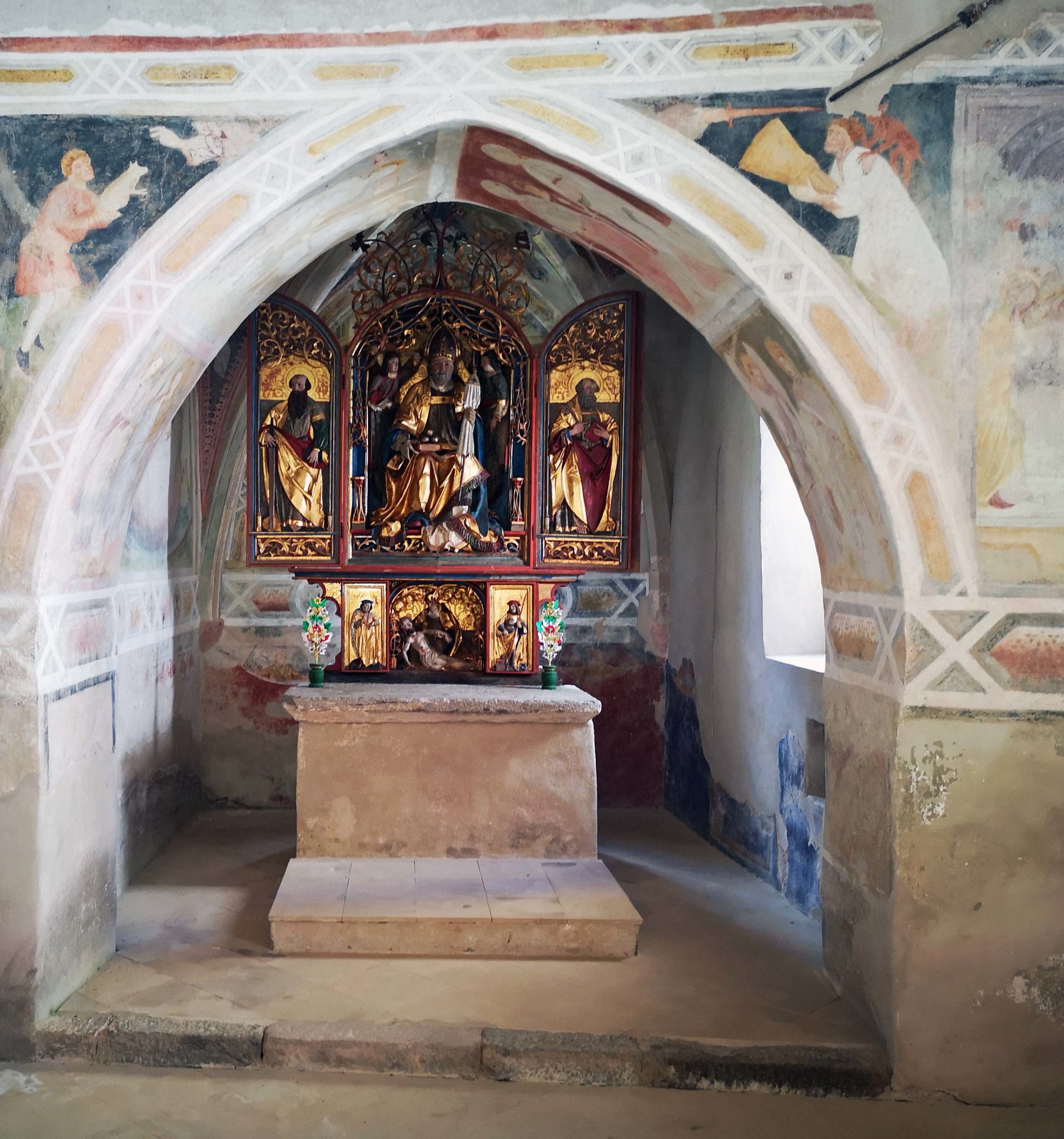 Hier bestaunen wir die ‚Drei Kirchen‘, die trotz unterschiedlicher Bauzeit ineinander verschachtelt aber eigenständig sind. Sie haben ein gemeinsames hölzernes Schindeldach. Im Innern verbergen sich wunderschöne gotische Flügelaltäre und Fresken der spätmittelalterlichen Brixner Schule.