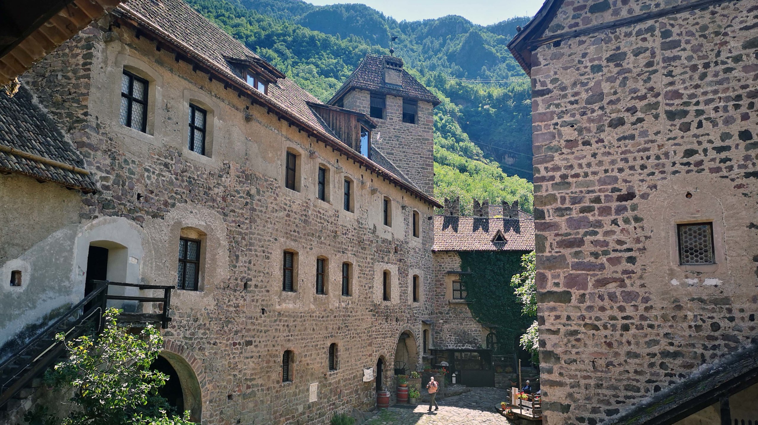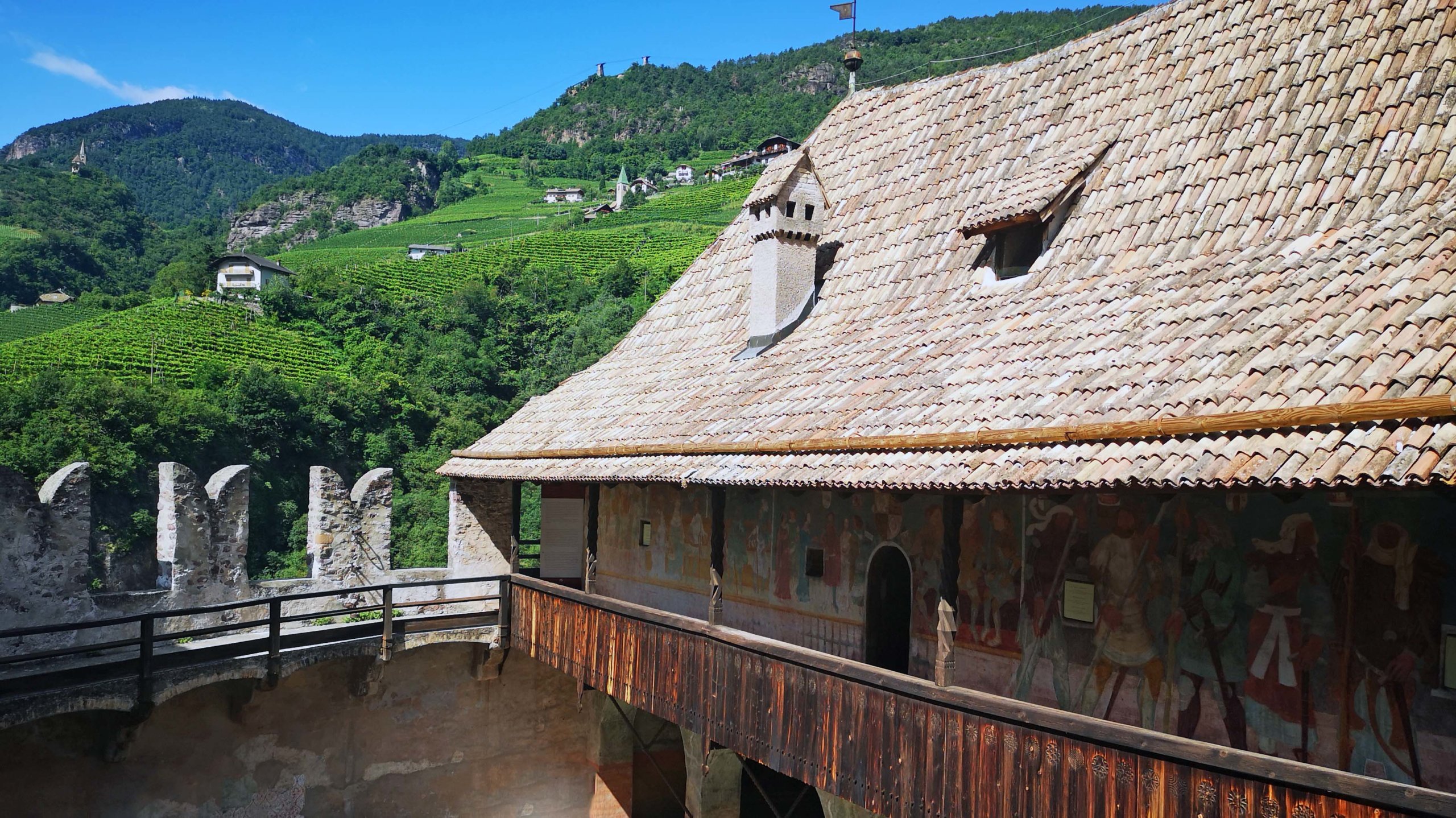 Zuerst erklimmen wir den steilen Weg zur Burg, den schon Kaiser Franz-Josef entlangschritt. Es ist sonnig und warm. Die Gemäuer der ‚Bilderburg‘ bergen prächtige Fresken mit Szenen aus dem Leben bei Hofe. Sie erzählen von der Jagd, von Ritterturnieren, Edeldamen und vom mittelalterlichen Alltag. Für ein ‚Taschengeld‘ bekommen wir extrem gut erhaltene Fresken zu sehen. Wir sind beeindruckt. Und der Blick ins Tal auf Bozen ist fantastisch. Nach soviel Kultur geht’s jetzt ins Eisacktal.