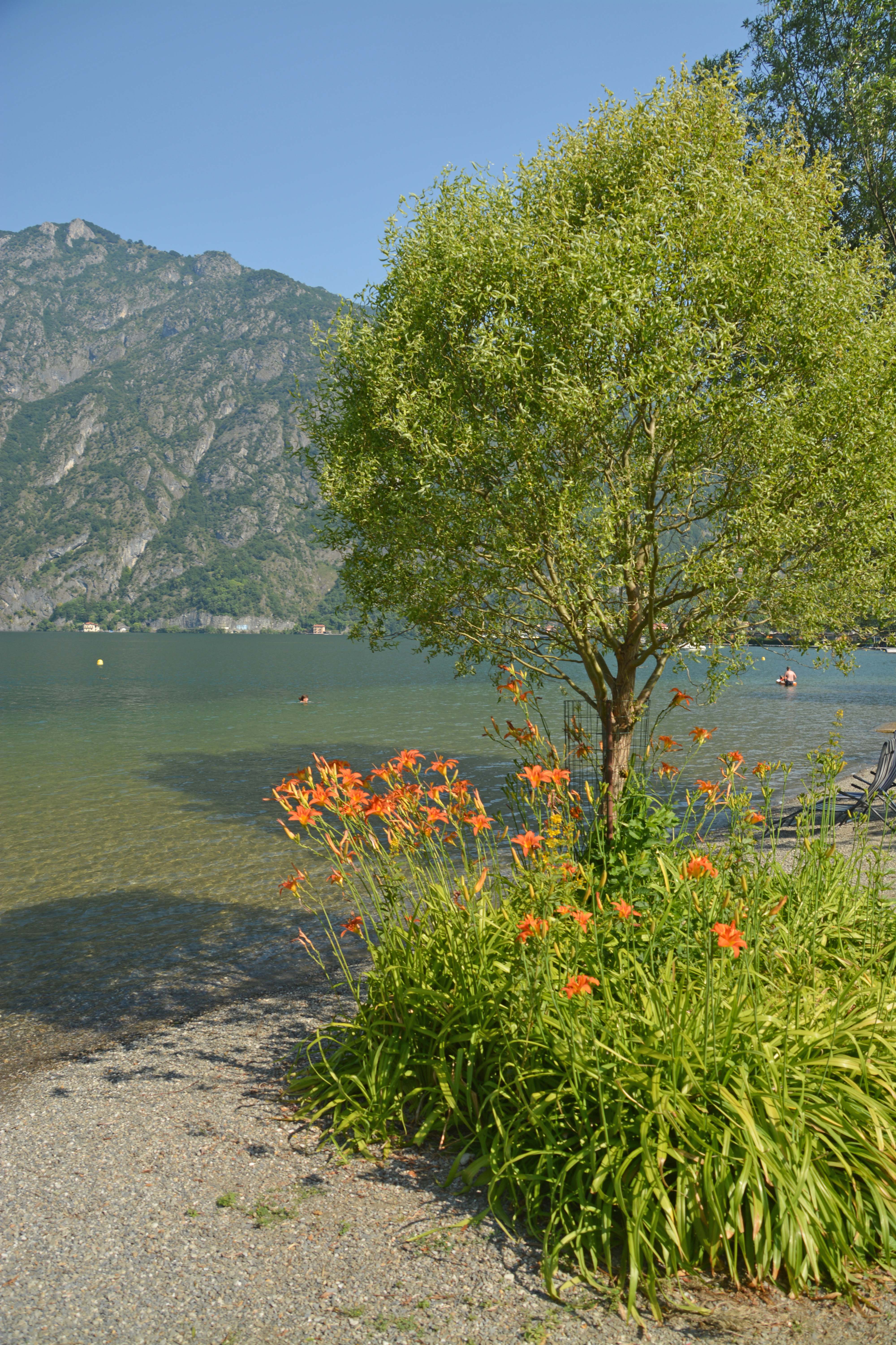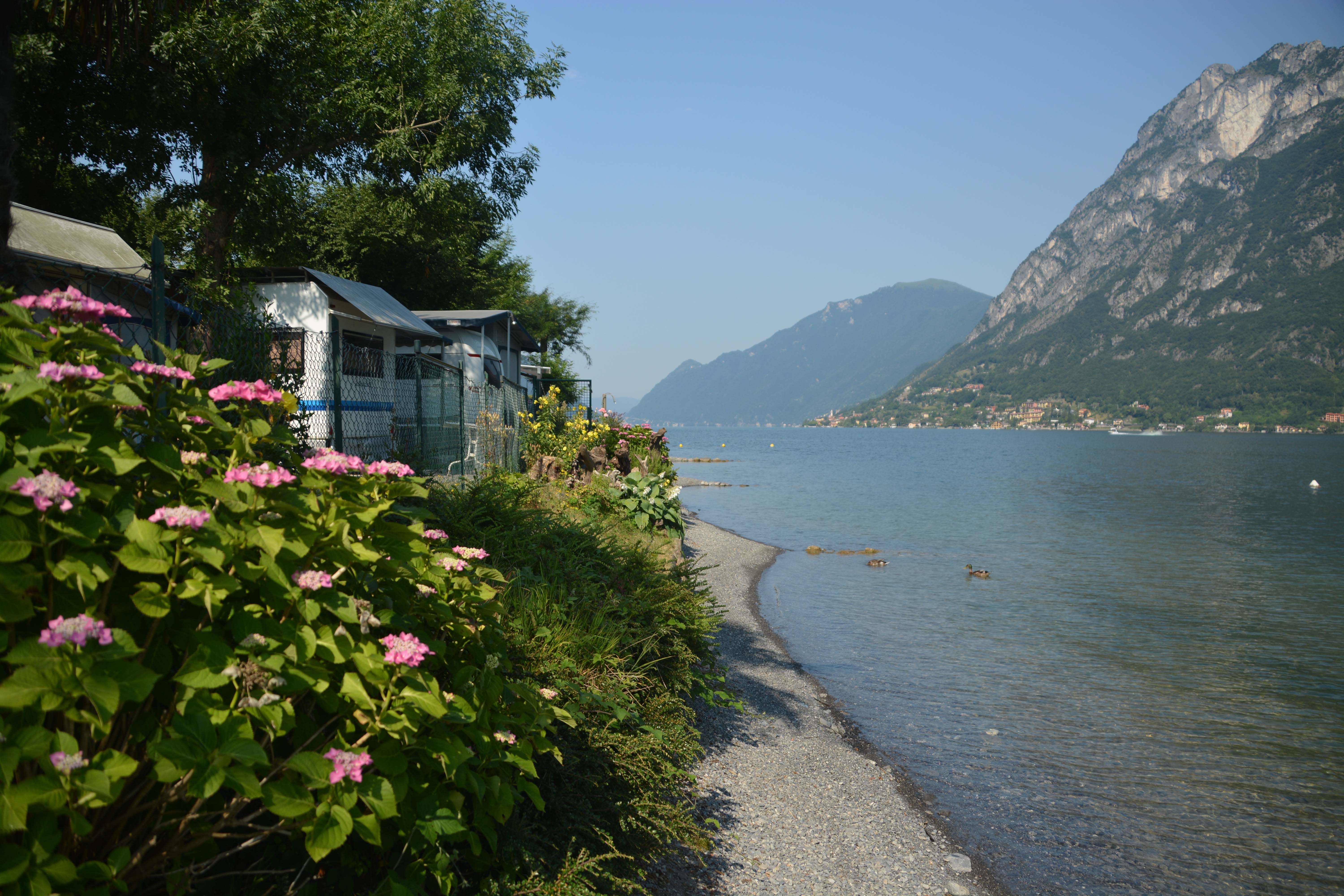 Deshalb stehen wir um 8 Uhr auf. Der Lago di Lugano liegt ganz ruhig vor uns, die Bergketten verstecken sich teilweise im Schatten, die Badegäste schlafen noch. Die Vögel zwitschern, die Entenfamilie putzt sich, ein Schwan zieht gemächlich seine Bahnen. In dieser herrlichen Morgenstimmung nehmen wir unser Frühstück ein und verspeisen die besten Croissants dieses Urlaubs. Ich denke NICHT an die Fahrt durch die ungeliebte Schweiz und konzentriere mich ganz auf die famose Atmosphäre. Danach geht‘s für ein letztes Bad in den See.