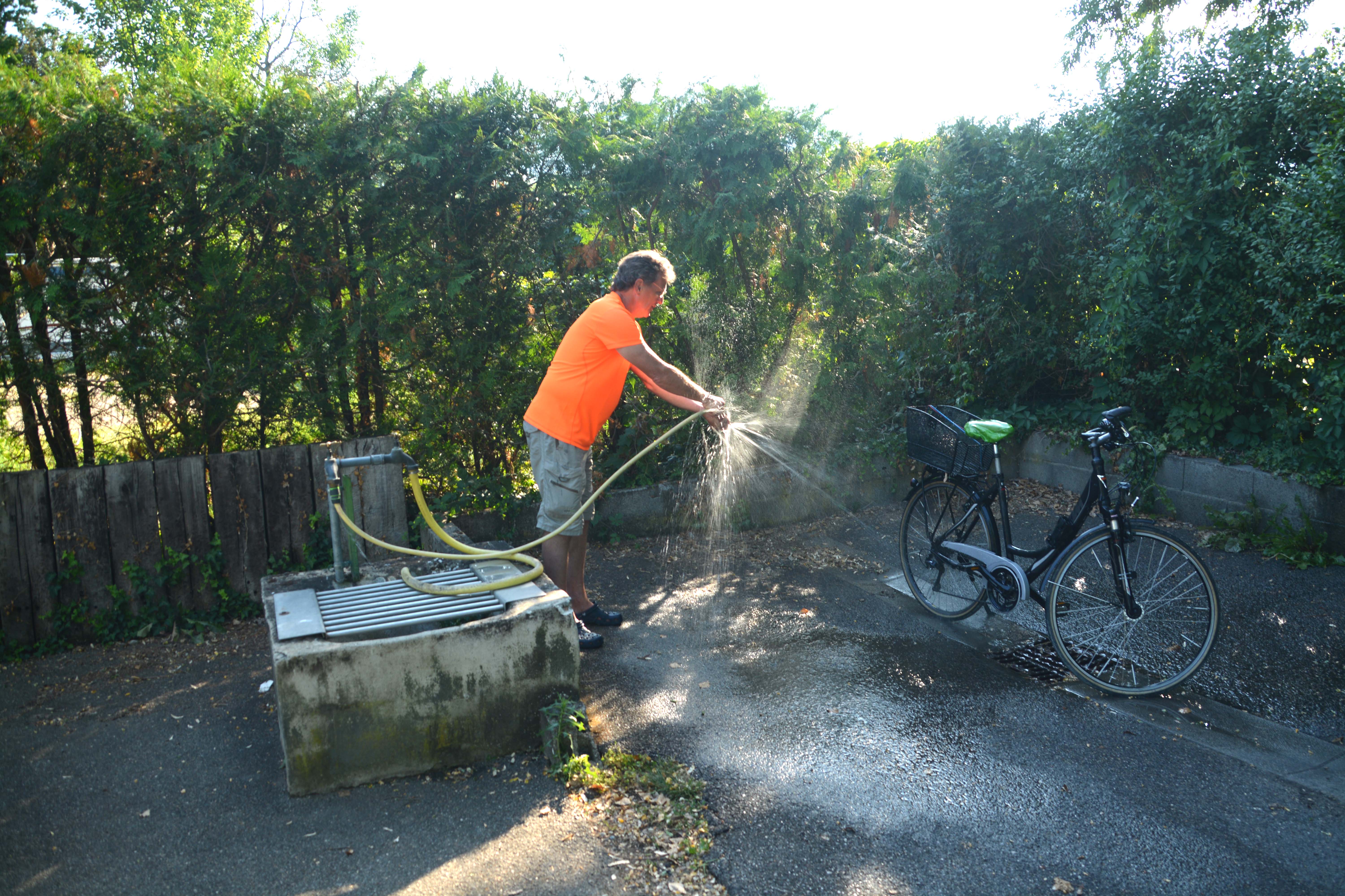 Um 17 Uhr checken wir auf unserem Wunschplatz 47 beim ‚Camping Les Trois Chateaux‘ ein. Wir erwischen ein gutes Zeitfenster, denn der Platz ist in dieser Woche nur zu einem Drittel belegt. Nach einer kurzen Chill-Pause auf der WOMO-Terrasse schnappen wir die Räder und besuchen unsere Störche. Auch unser Campingplatz-Storch stolziert wieder auf der Suche nach Leckereien durch die Wohnwagen- und Wohnmobilplätze. Wir fahren kurz in den Ort und dann zum Dinner zu uns in die Weinberge.