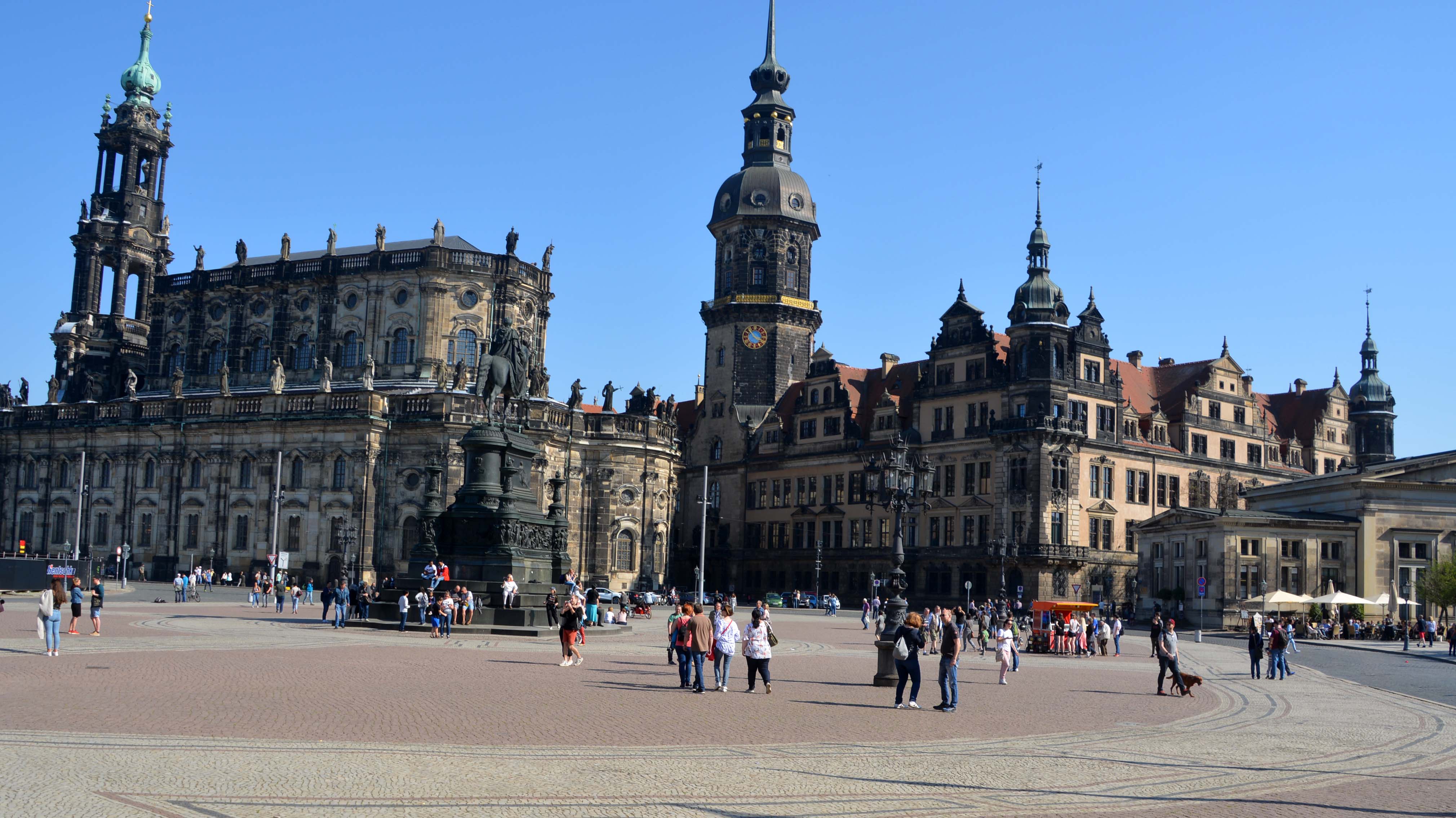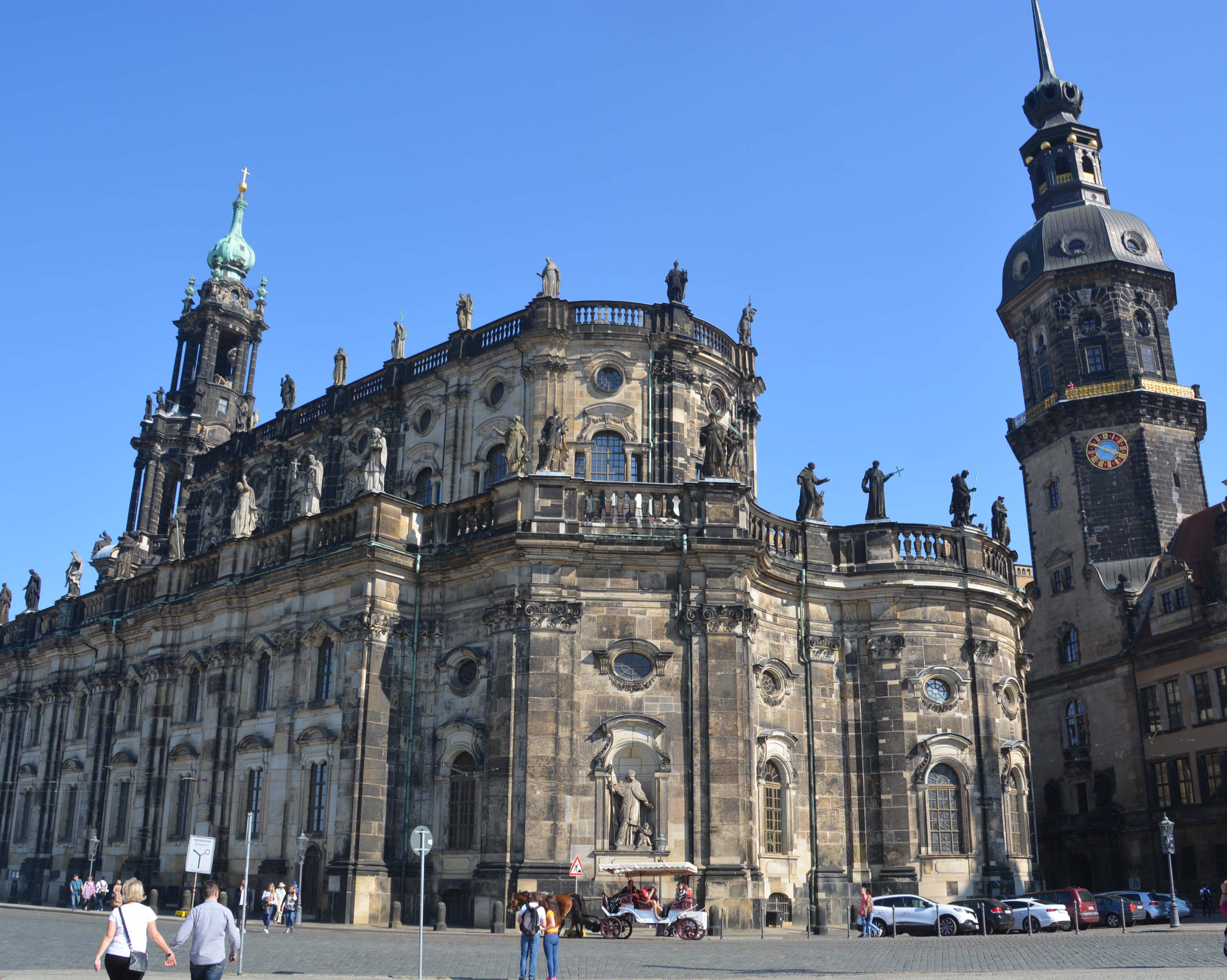 Nur wenige hundert Meter weiter befindet sich das Residenzschloss, einstiger Herrschersitz der sächsischen Kurfürsten und die katholische Hofkirche Kathedrale Sanctissimae Trinitatis. Das Ensemle liegt zwischen Schloss- und Theaterplatz. Die Basilika ist Sachsens größter Kirchenbau. Hier hielten die Katholiken ihre Prozessionen ab, denn im protestantischen Sachsen war ihnen die Religionsausübung im Freien verboten. Wer sich am Herzen des großen Mäzens berauschen will, kann das in der Gruft nach Herzenslust tun. Auf dem Dach des Kirchenschiffs prangen stolz 59 überlebensgroße Heiligenstatuen.