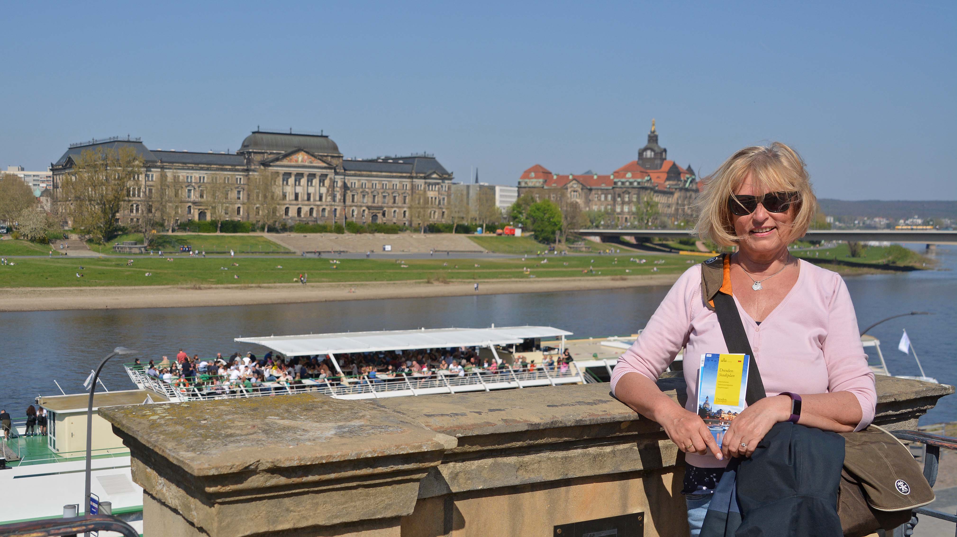 Also richten wir unser Augenmerk auf die Brühlsche Terrasse am Elbufer. Der einstige Lustgarten mit dem Albertinum, einem Museum für moderne Kunst, und dem Delfinbrunnen im Garten, ist bekannt als ‚Balkon Europas‘. Von hier aus genießen wir einen herrlichen Blick auf die Neustadt, die Anlegestelle für die Raddampfer der Sächsischen Dampfschifffahrt und die Augustusbrücke aus Sandstein über der gemächlich dahinfließenden Elbe.