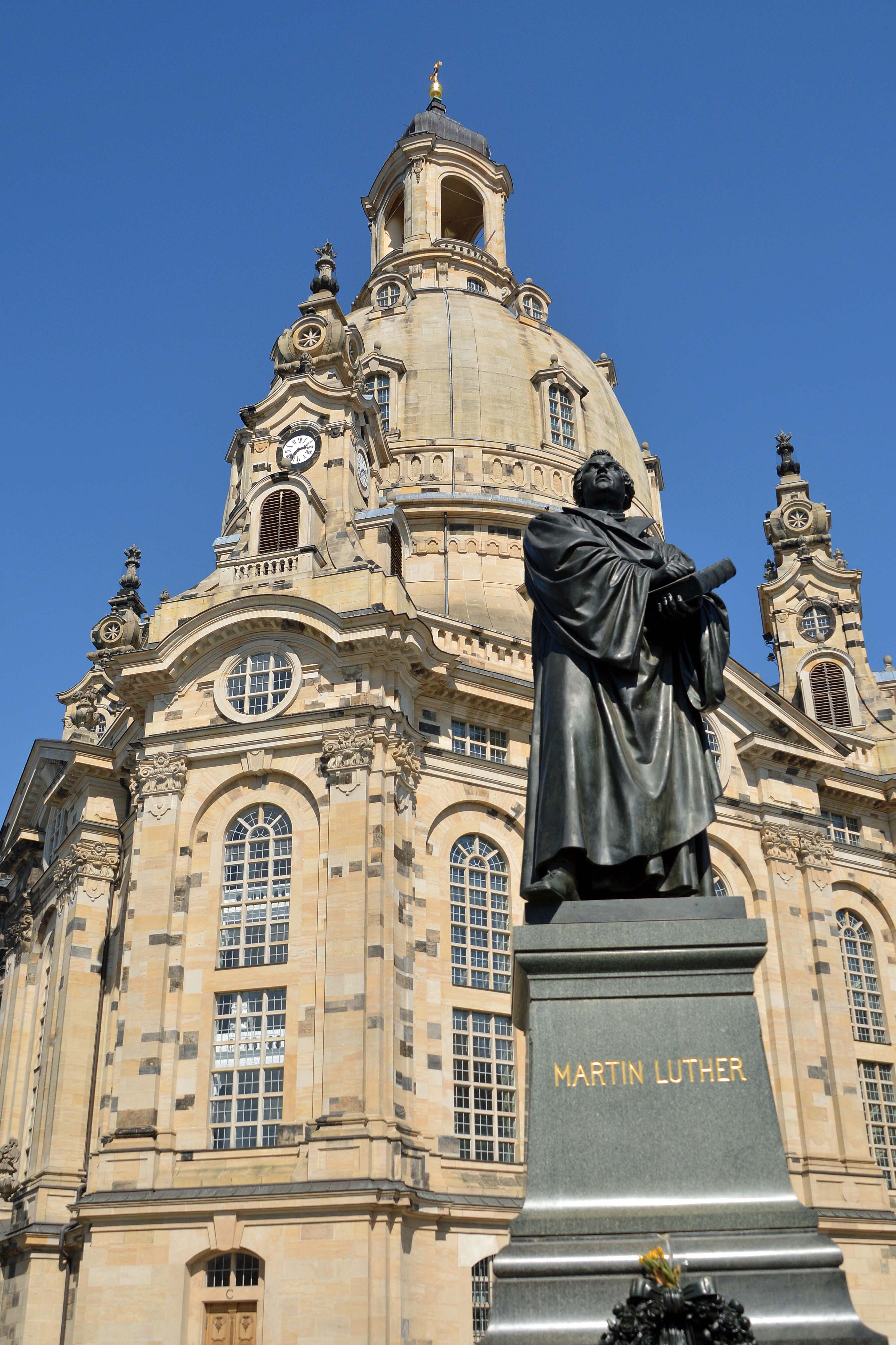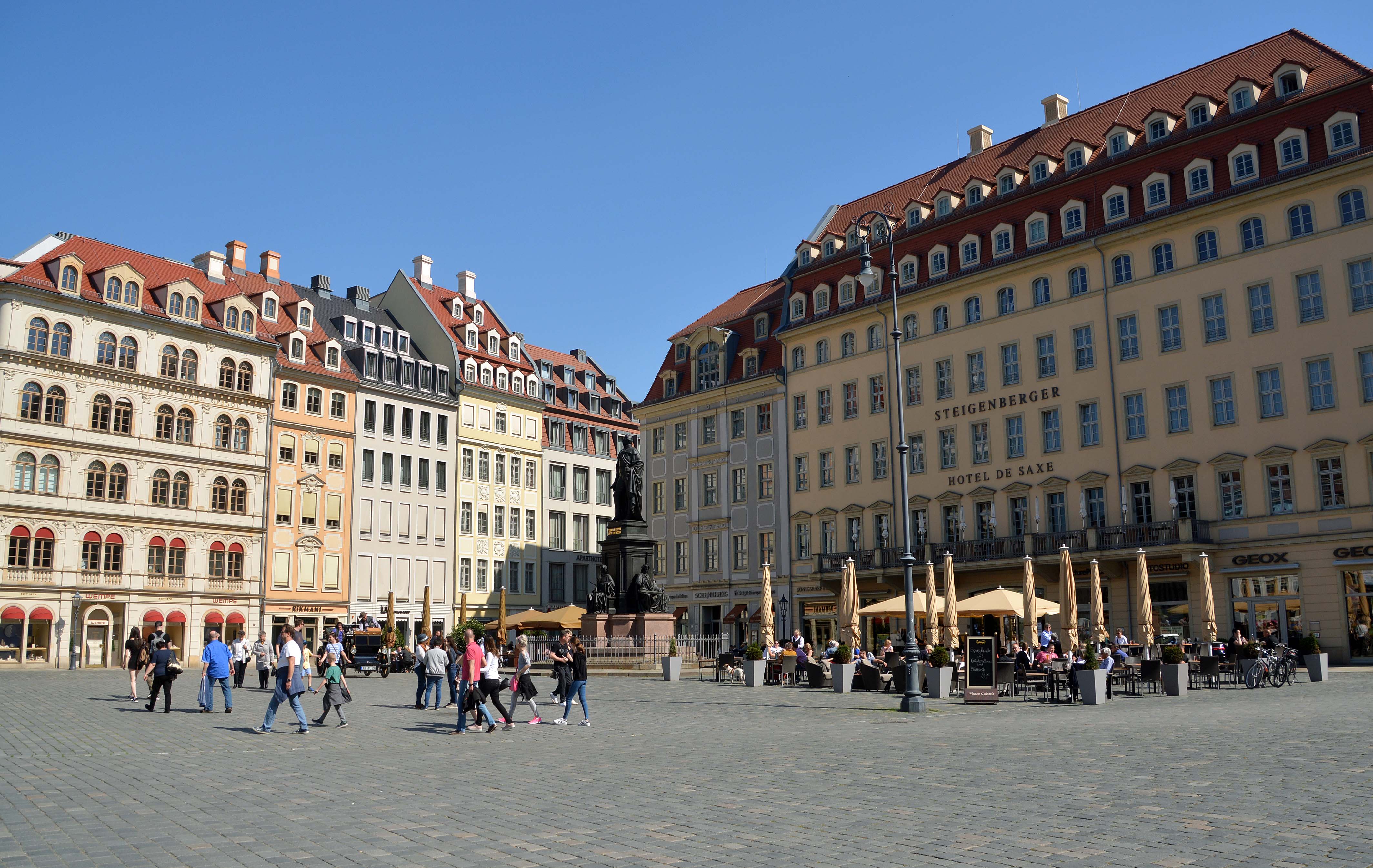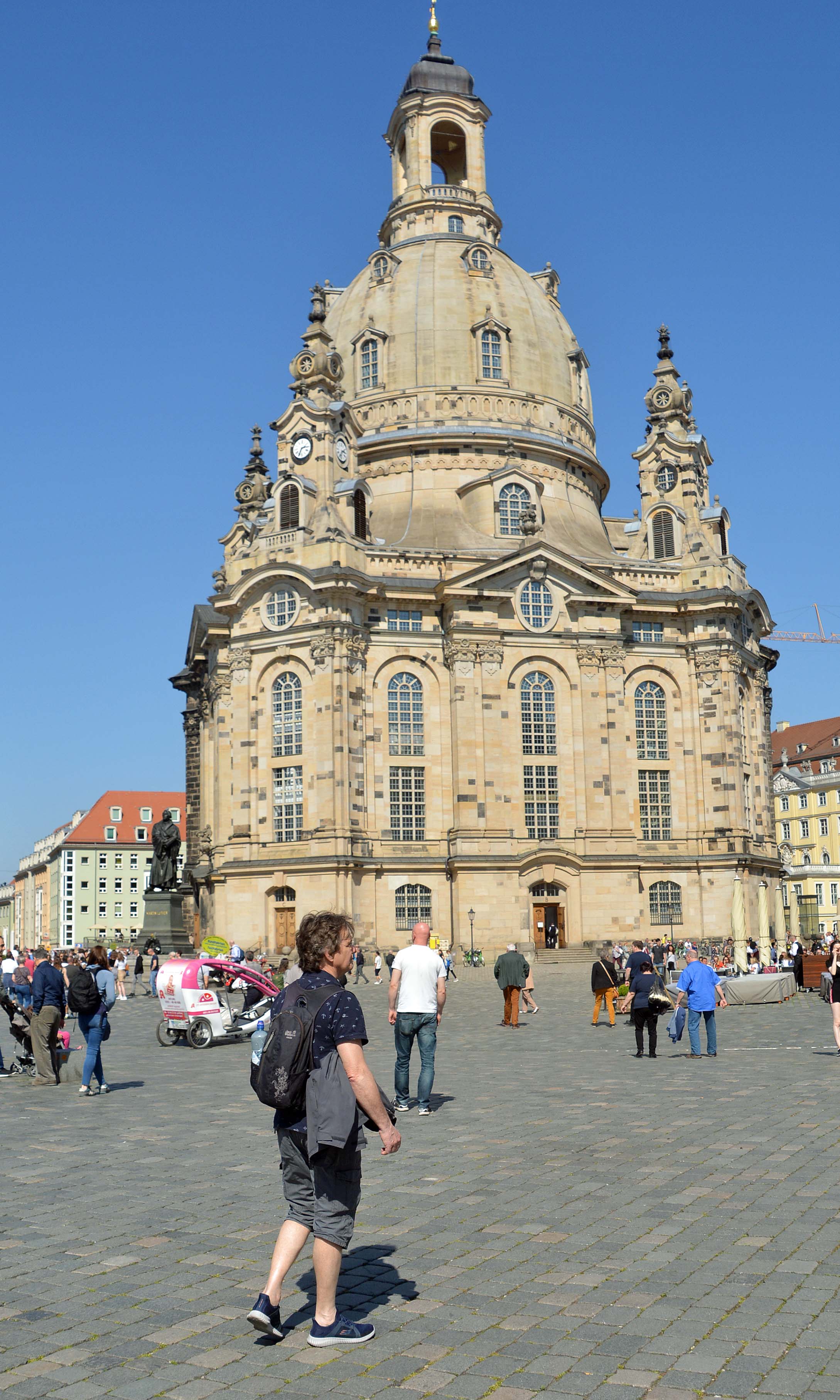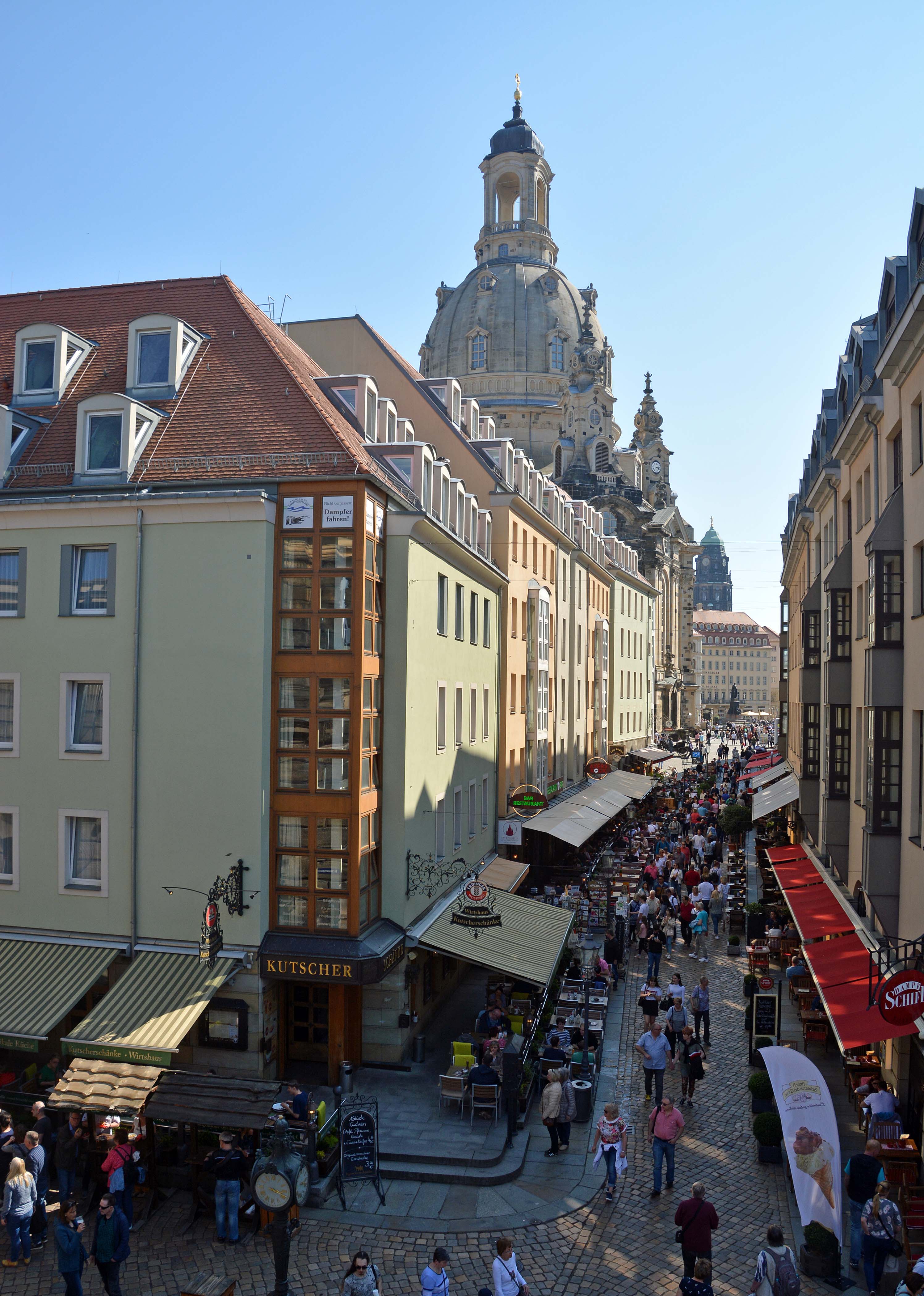 Die wieder aufgebaute Dresdner Frauenkirche prägt die Stadtsilhouette auf dem Neumarkt und ist Publikumsmagnet Nummer 1. Fast ein halbes Jahrhundert war sie präsent und wurde im 2. Weltkrieg in nur einer Nacht komplett zerstört. Für den Wiederaufbau wurden aus einer Million Trümmersteinen viele an ihre originalen Stellen eingesetzt. Heute ist das Wahrzeichen Dresdens ein Symbol der Völkerversöhnung. Wir halten inne, stehen in der Besucherschlange und können uns kaum vorstellen, dass hier vorher 40 Jahre Brachland und Parkplätzen waren. Endlich an der Reihe müssen wir auch hier auf einen Besuch der Kirche verzichten. Es laufen gerade Karfreitagszeremonien! Ganz großes Religions-Kino!