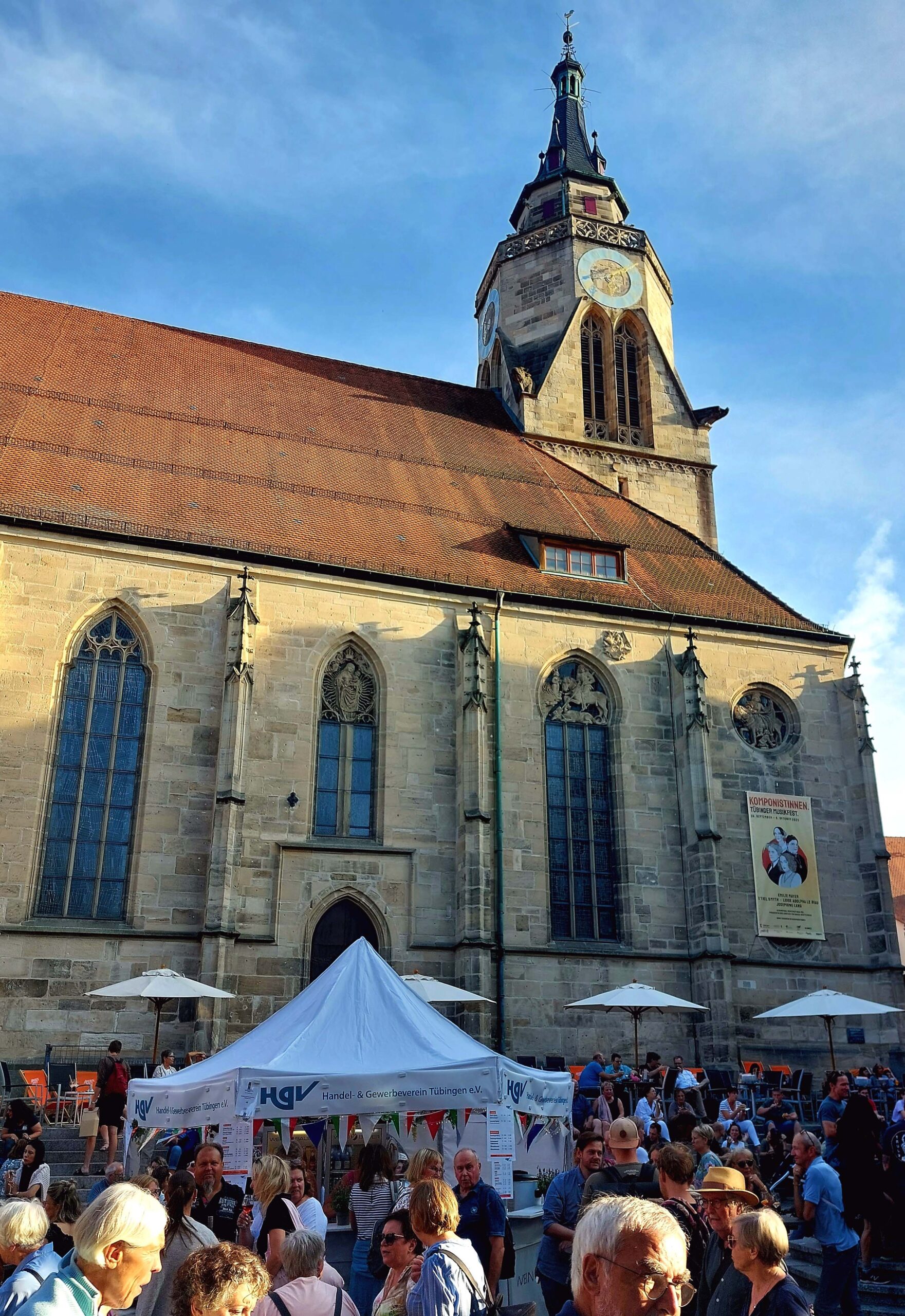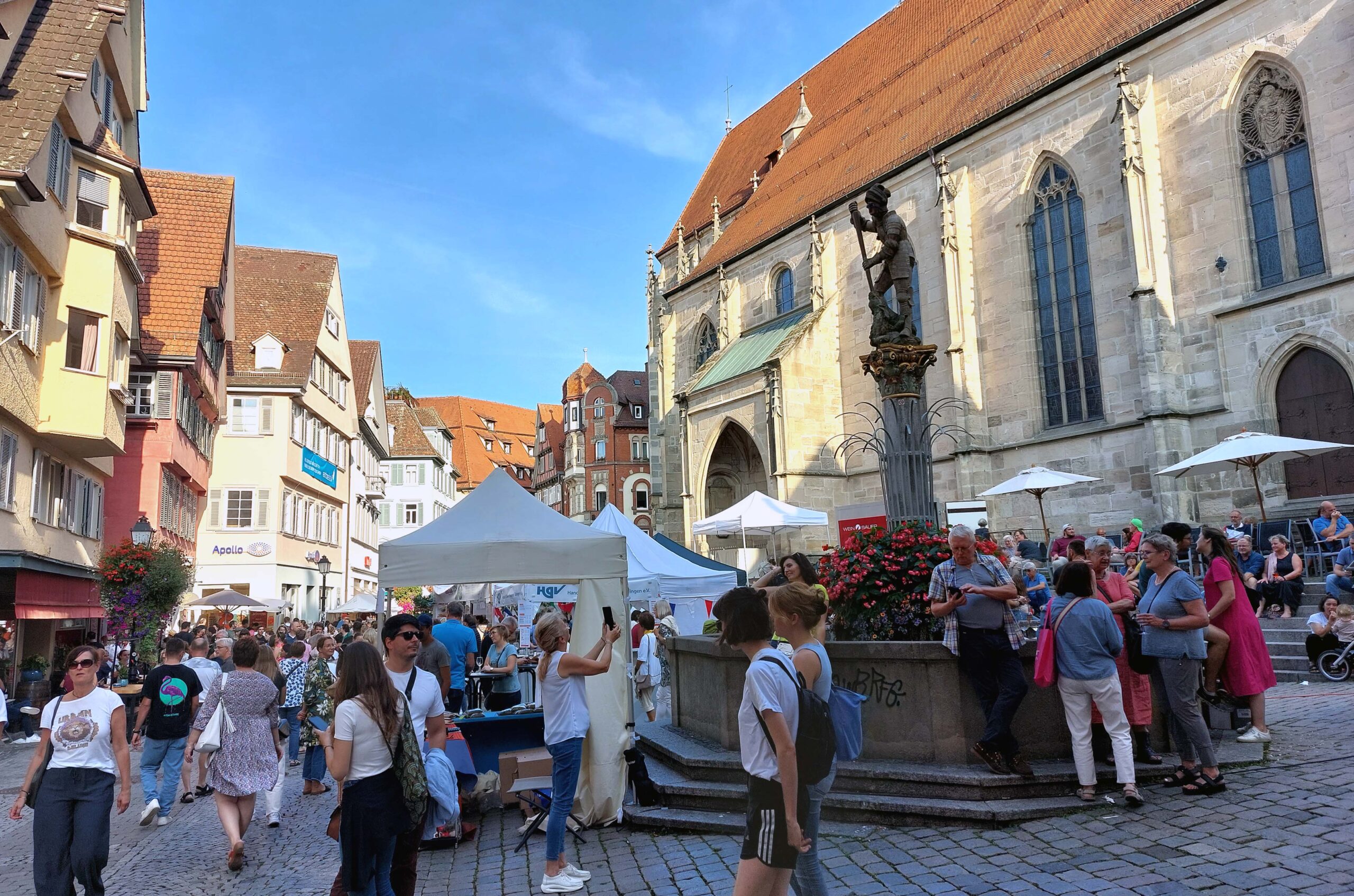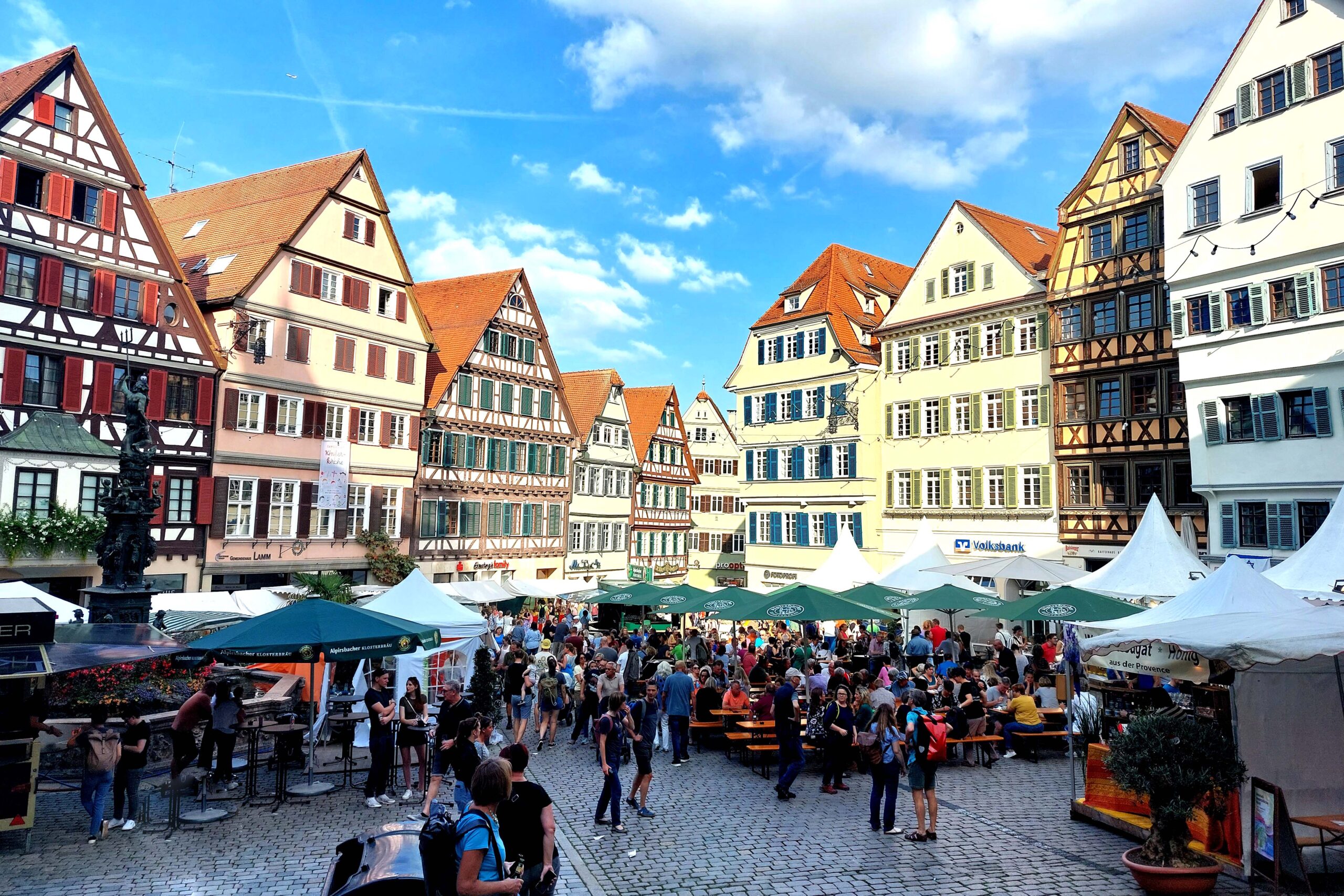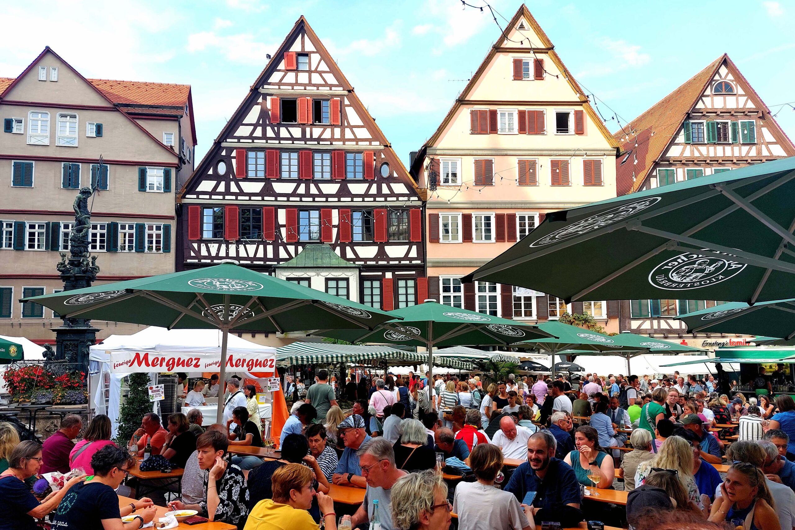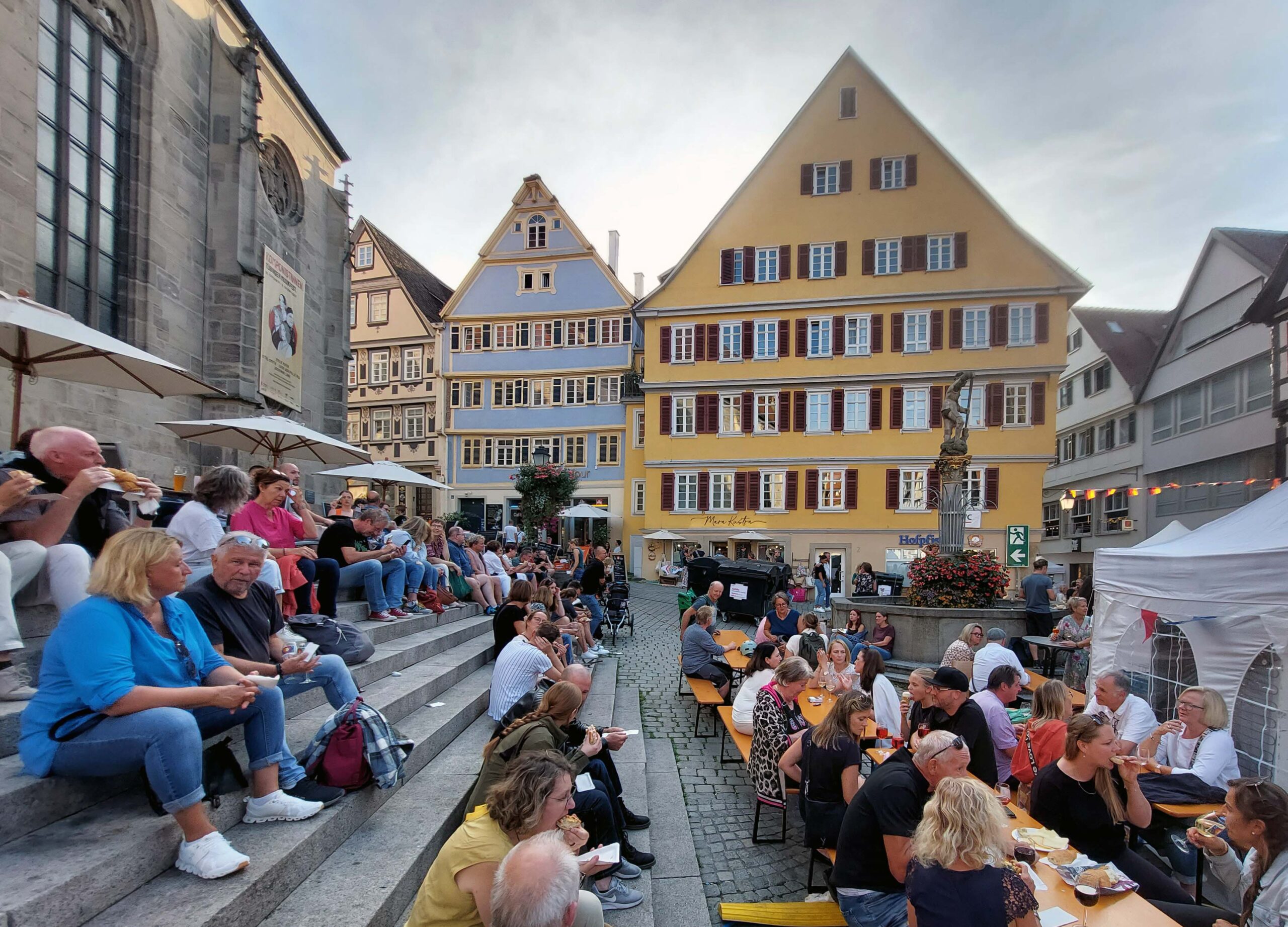 Mein Ziel ist der historische Marktplatz, wo der „Umbrisch-Provenzalische Markt“ stattfindet. Der mediterrane Genussmarkt ist jährlich fünf Tage lang geöffnet. Gemeinsam mit ca. 100.000 Besuchern 😲 genießen die Tübinger „Dolce Vita“ und „Savoir-vivre“ vor historischer Kulisse. Am Neptunbrunnen vor der Jakobuskirche schnabulieren die Besucher typische Köstlichkeiten aus den beiden Partnerstädten und genießen Wein 🍷. Natürlich mache ich das auch. Morgen habe ich noch einen ganzen Tag zum intensiven Sight-Seeing.👀👀👀