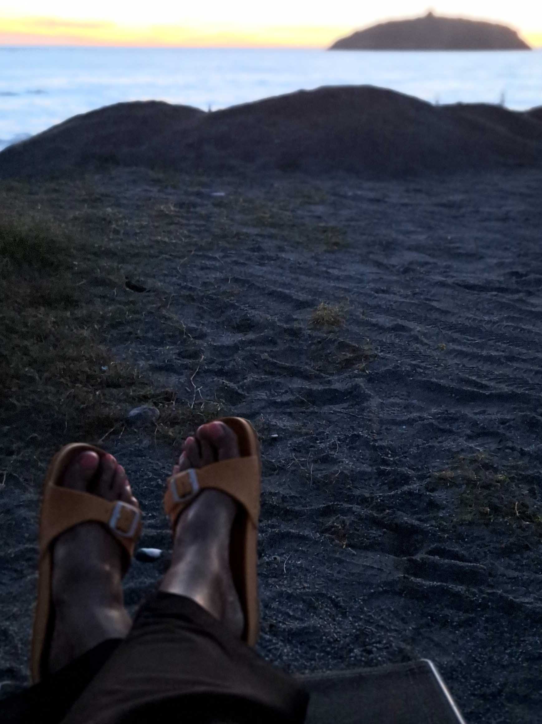 Es ist fast 20 Uhr, ich sitze drauĂen in meinem Campingstuhl, schaue aufs Meer und beobachte den grandiosen Sonnenuntergang đ