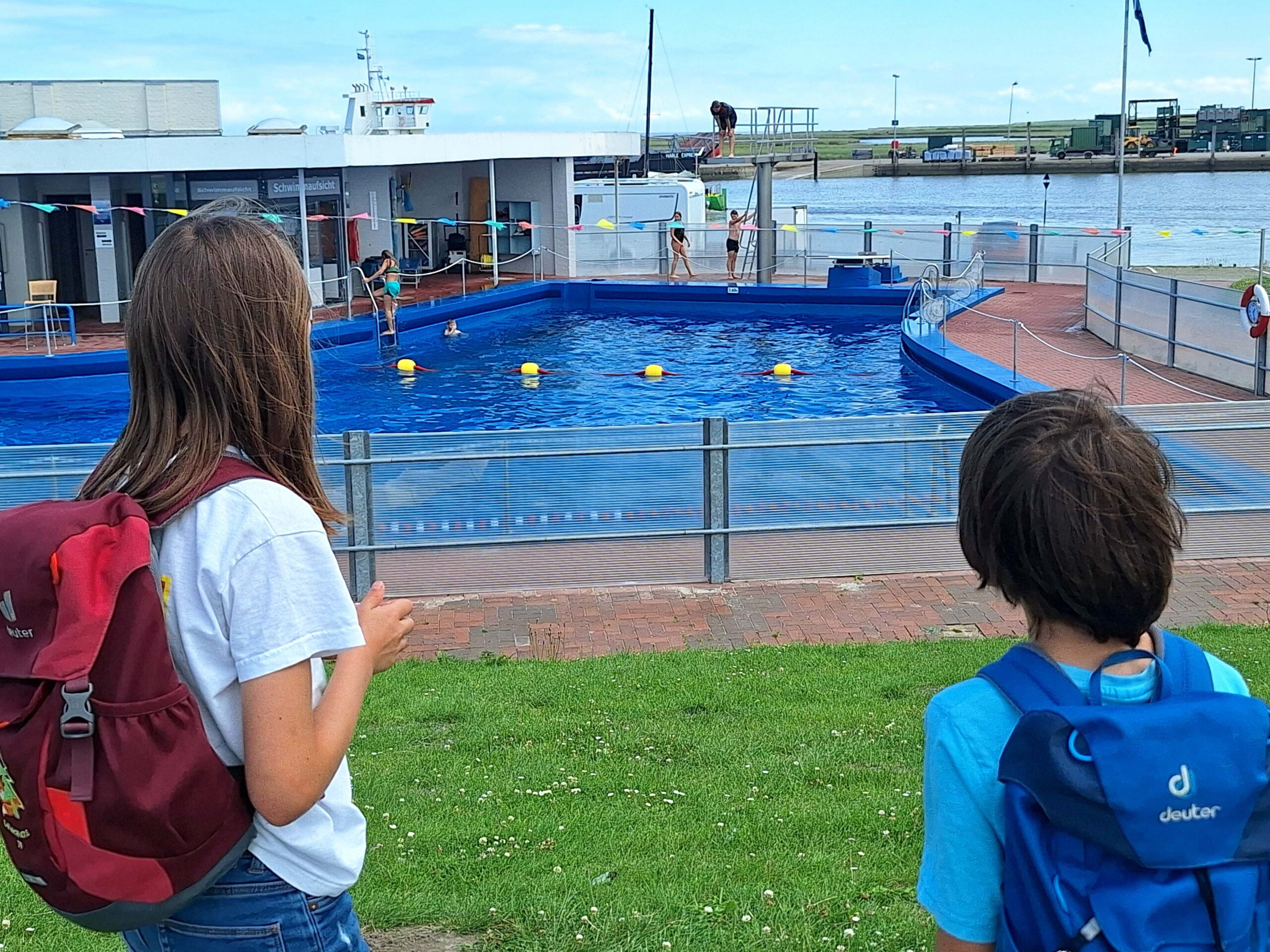 Nach einer kurzen Pause gehen wir ins Schwimmbad „Cliener Quelle. 🏊‍♂️🤿🥽 Das Sole- und Erlebnisbad verspricht Spaß und Gesundheit, ein Becken für Heilanwendungen, zwei tolle Wasserrutschen & mehr. Drei Stunden kosten mit der Nordseecard satte 18 €. Dafür haben die Kids ‚ne Menge Spaß. 😃😅🤭 Weil ich wegen der besonderen Verantwortung als Oma die Kinder nicht alleine im Wasser lassen möchte, muss ich auf’s Schwimmen im Solebecken verzichten.