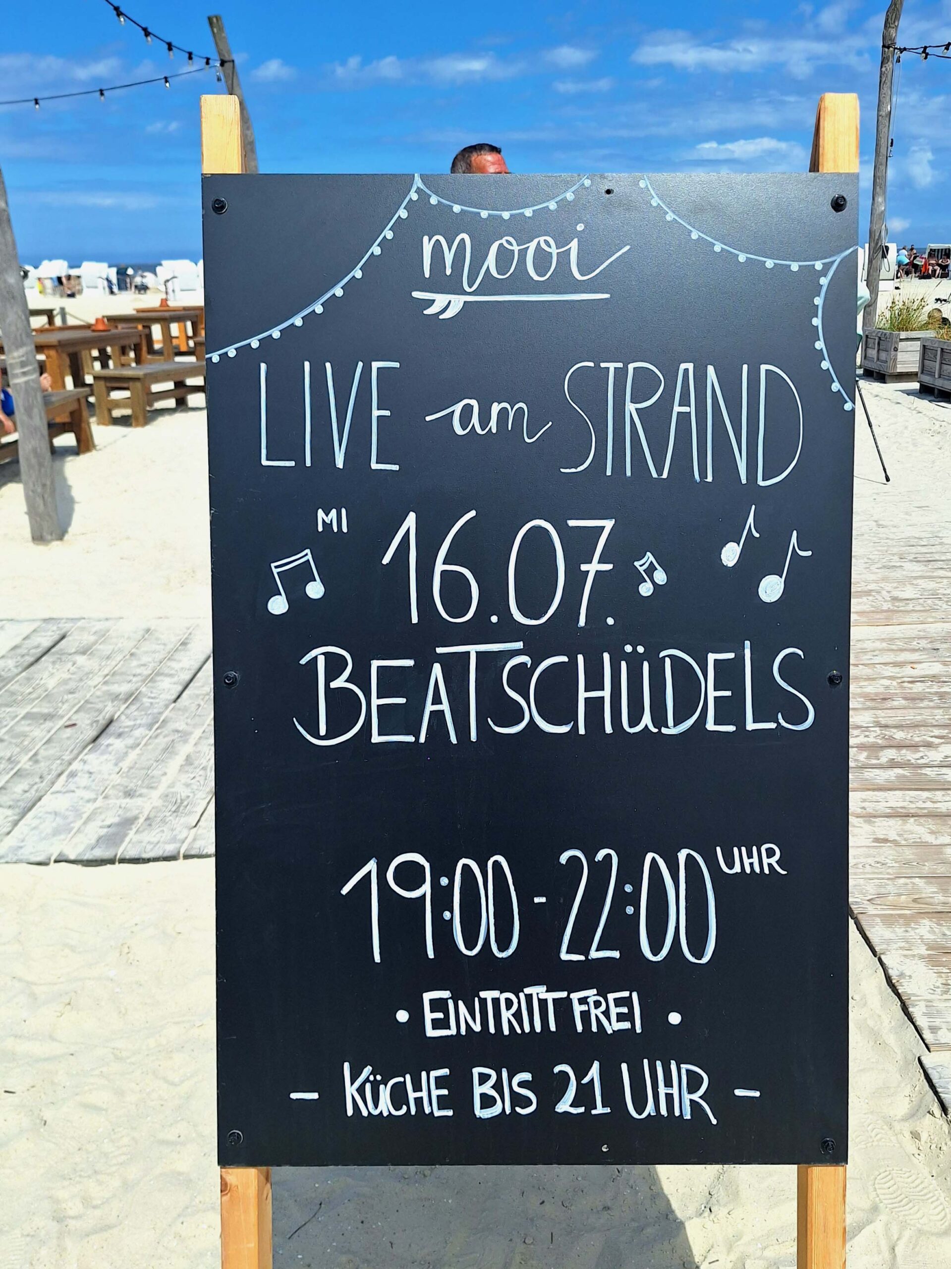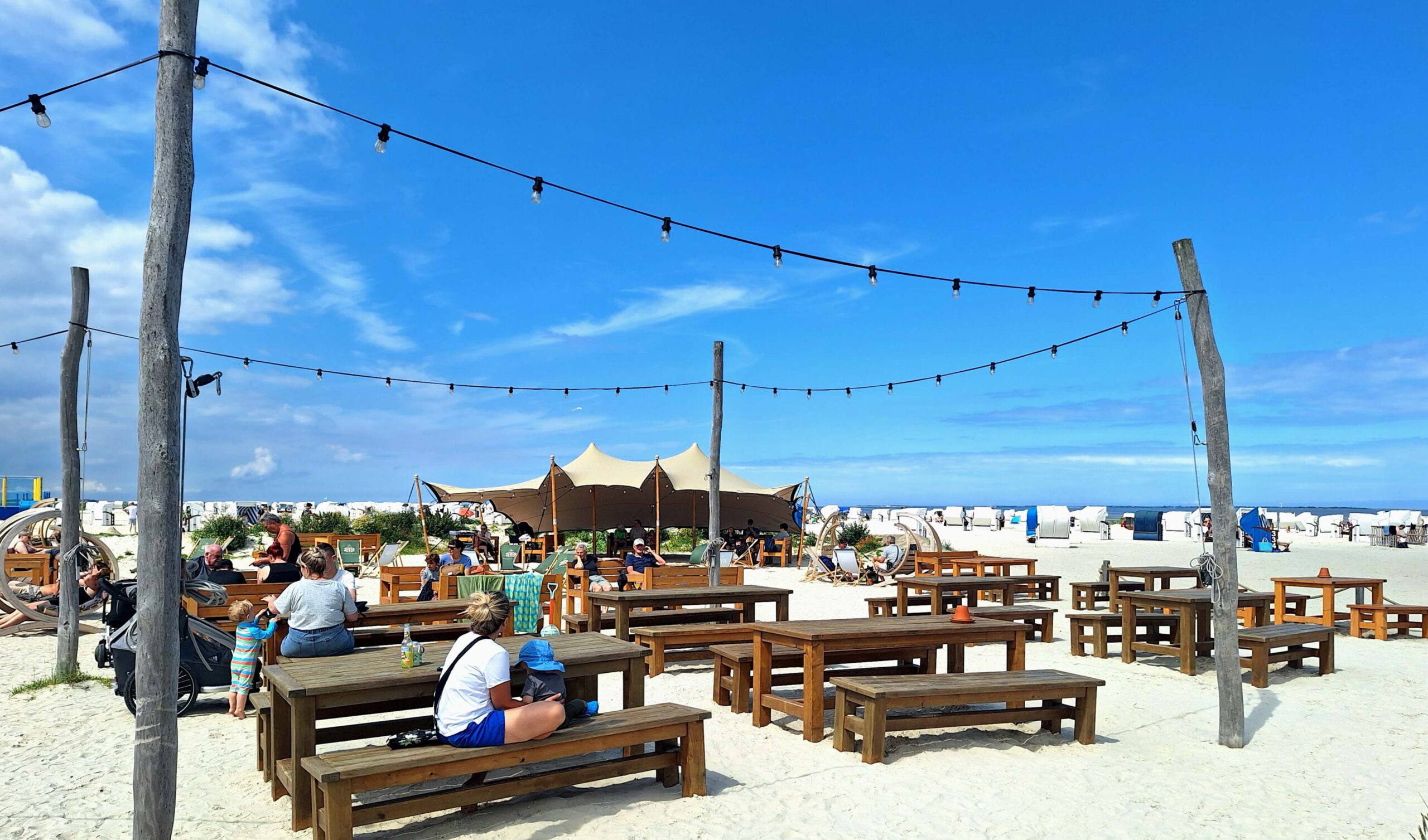 Der Sandstrand ist traumhaft, feiner weißer Sand mit rund 500 blau-weiß gestreiften Strandkörben (pro Tag 12 Euronen!). Die Kids stürzen sich auf die Eisbude 🍧und haben die Qual der Wahl.