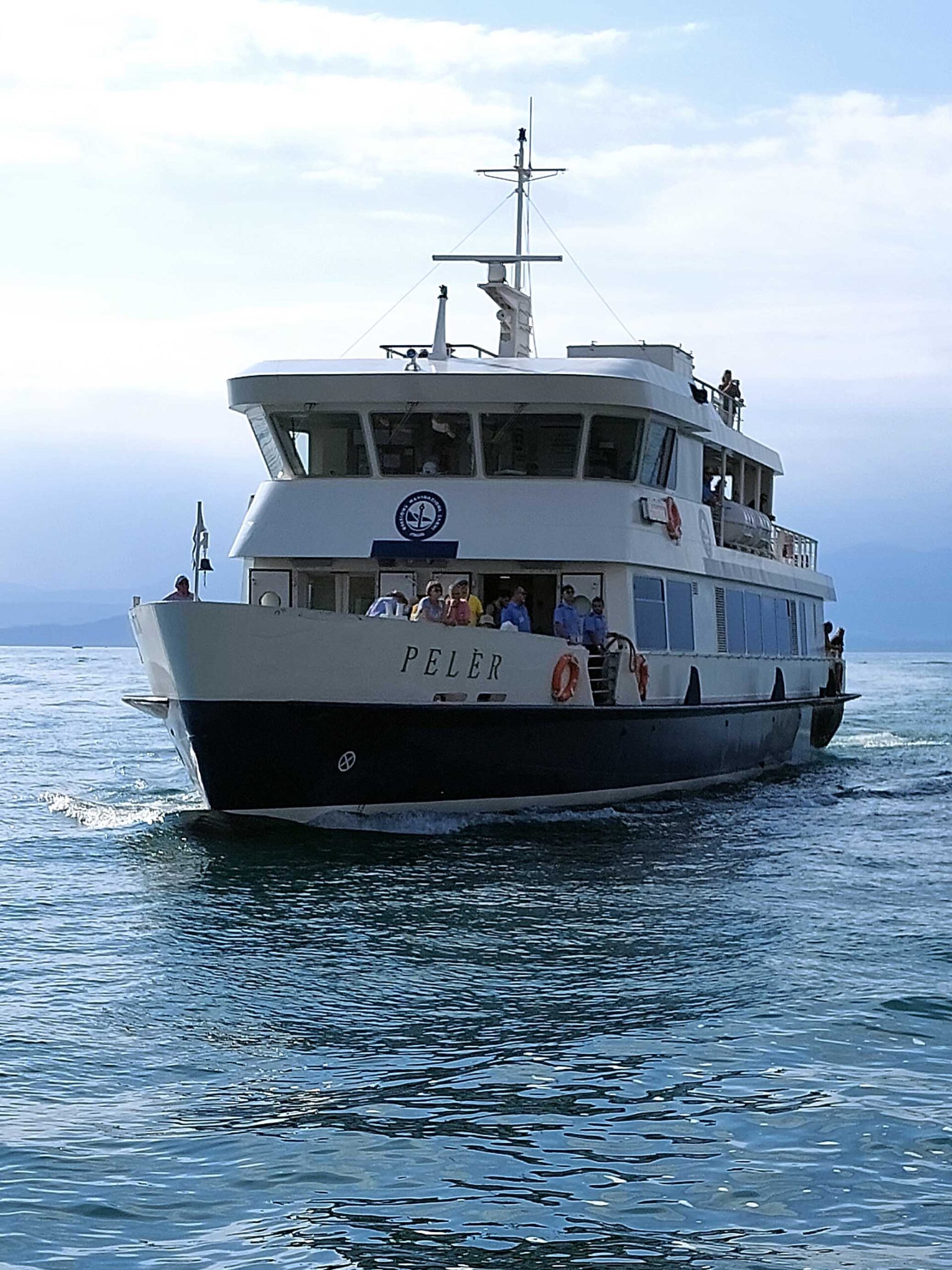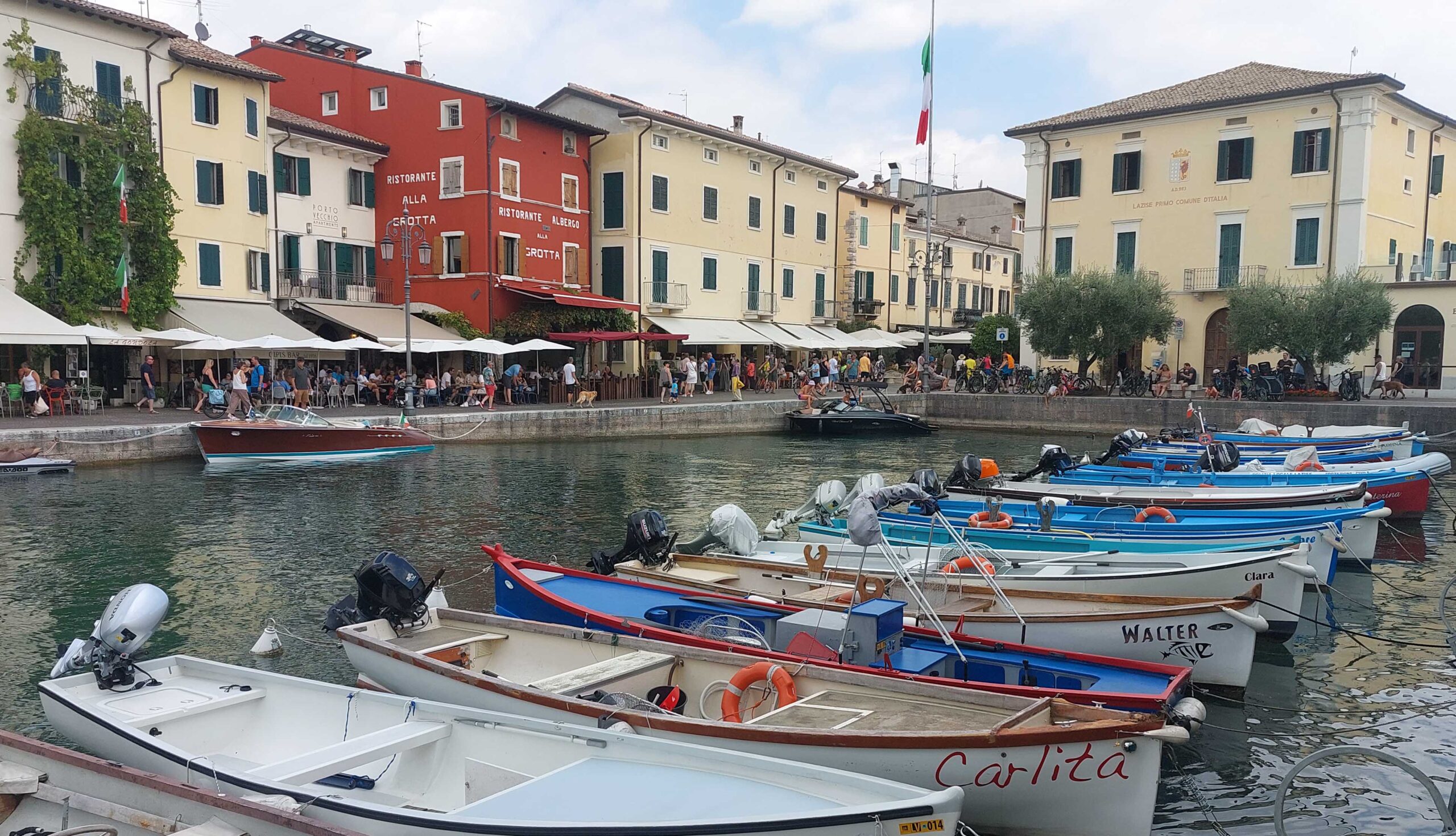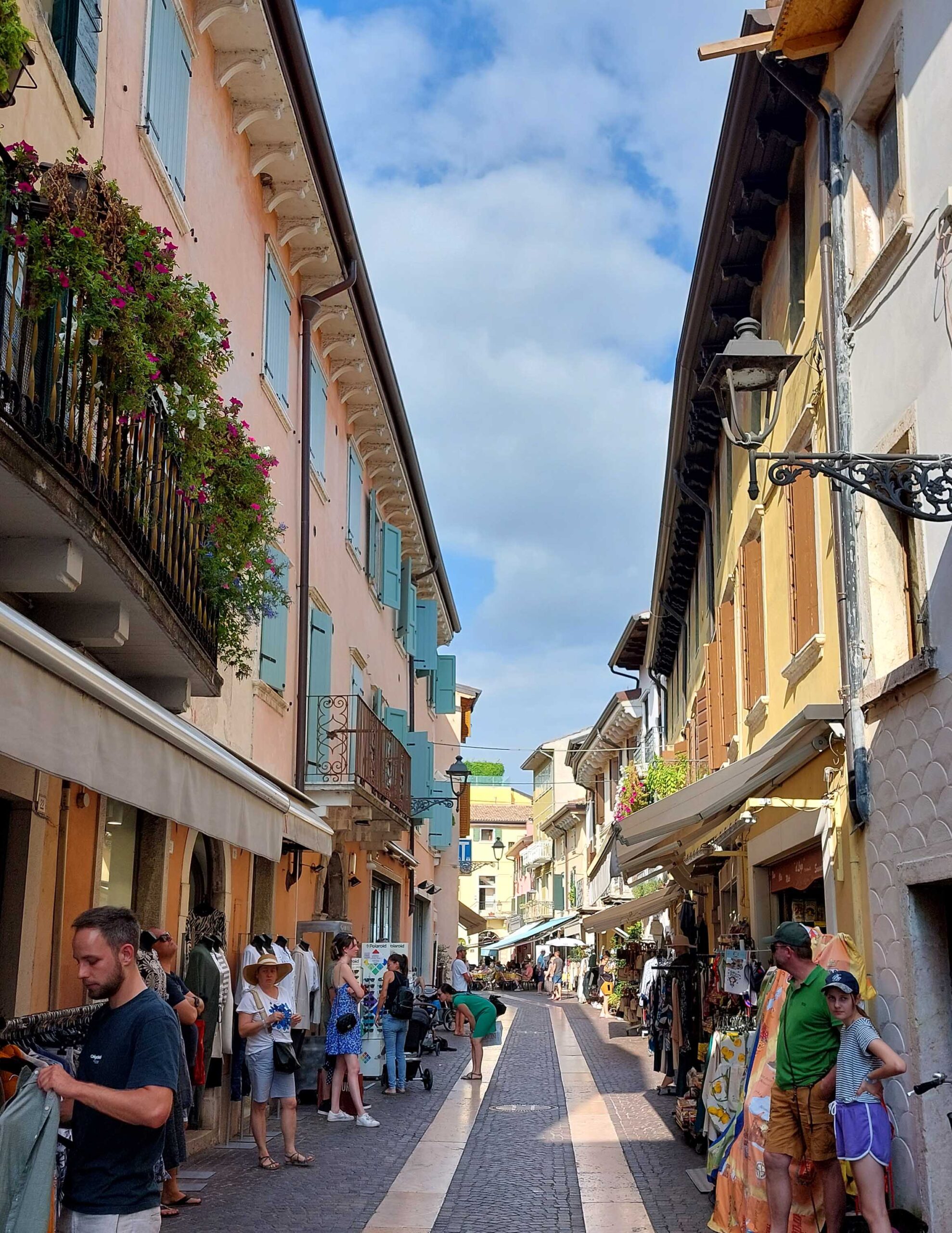 Ich bleibe lieber bei meinem „Aperol“, 🍹von dem ich in einer Strandbar 🏖️ jeden Schluck langsam im Liegestuhl mit Blick auf den See genieße. Weil es sooo schön ist, verbummle ich die Zeit. Radle deshalb mit erhöhtem Tempo nach Bardolino, einem Weinort an der Olivenriviera. Zwei Millionen Touris p.a. befördern das Örtchen auf Platz 24 unter den Reisezielen Italiens. Hier steht mir leider nur ein halbes Stündchen für einen Rundgang zur Verfügung, denn mein Schiff nach Peschiera legt pünktlich um 17 Uhr an.