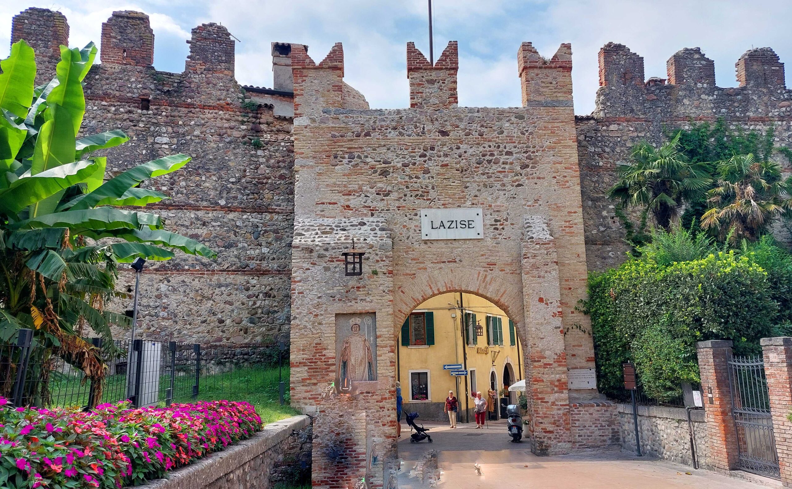 Ich komme in Lazise da an, wo die zinnengekrönte Stadtmauer mit dem Scaliger-Kastell aus dem 13. Jhd. steht. Sie befindet sich in einem Park und kann nicht besichtigt werden, da sie im Privatbesitz des Grafen Bernini ist. Ich fahre durch das imposante Stadttor Porta S. Zeno, eines von dreien der Stadt.