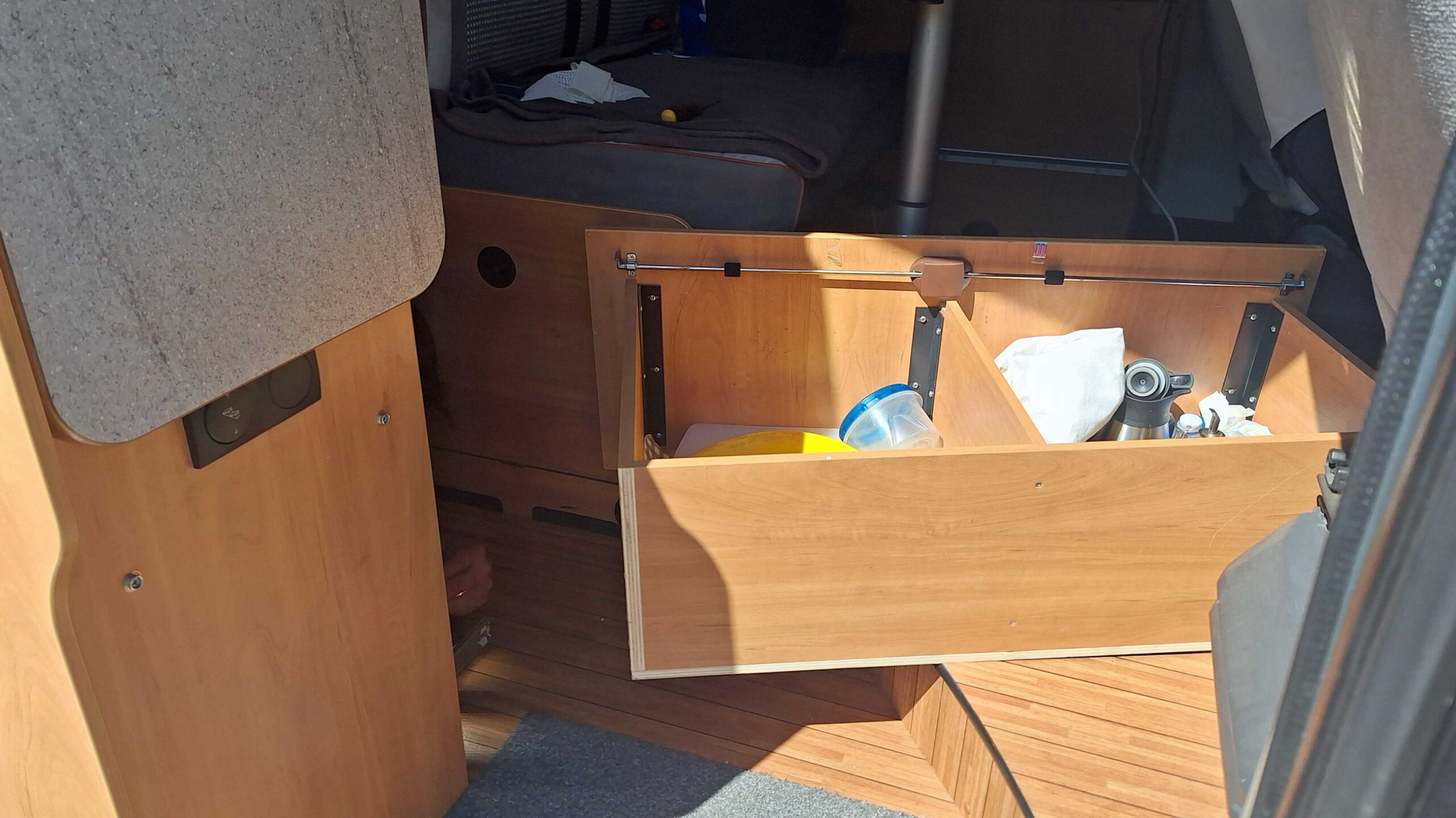 In einer der Cafébars trinke ich einen Café Lungo ☕und esse ein Stück Marmorkuchen. 🍩 Und floppi-galoppi sind gleich mal 6 € weg! Jetzt geht’s Richtung Messina, dem Fährhafen nach Kalabrien. Menno, ein neues Problem auf! Die untere Vorrats-Schublade geht bei der kurvigen Fahrt fortwährend auf und zu. Ich bin ratlos und räume bei Zafferana erstmal den Inhalt aus. 😠