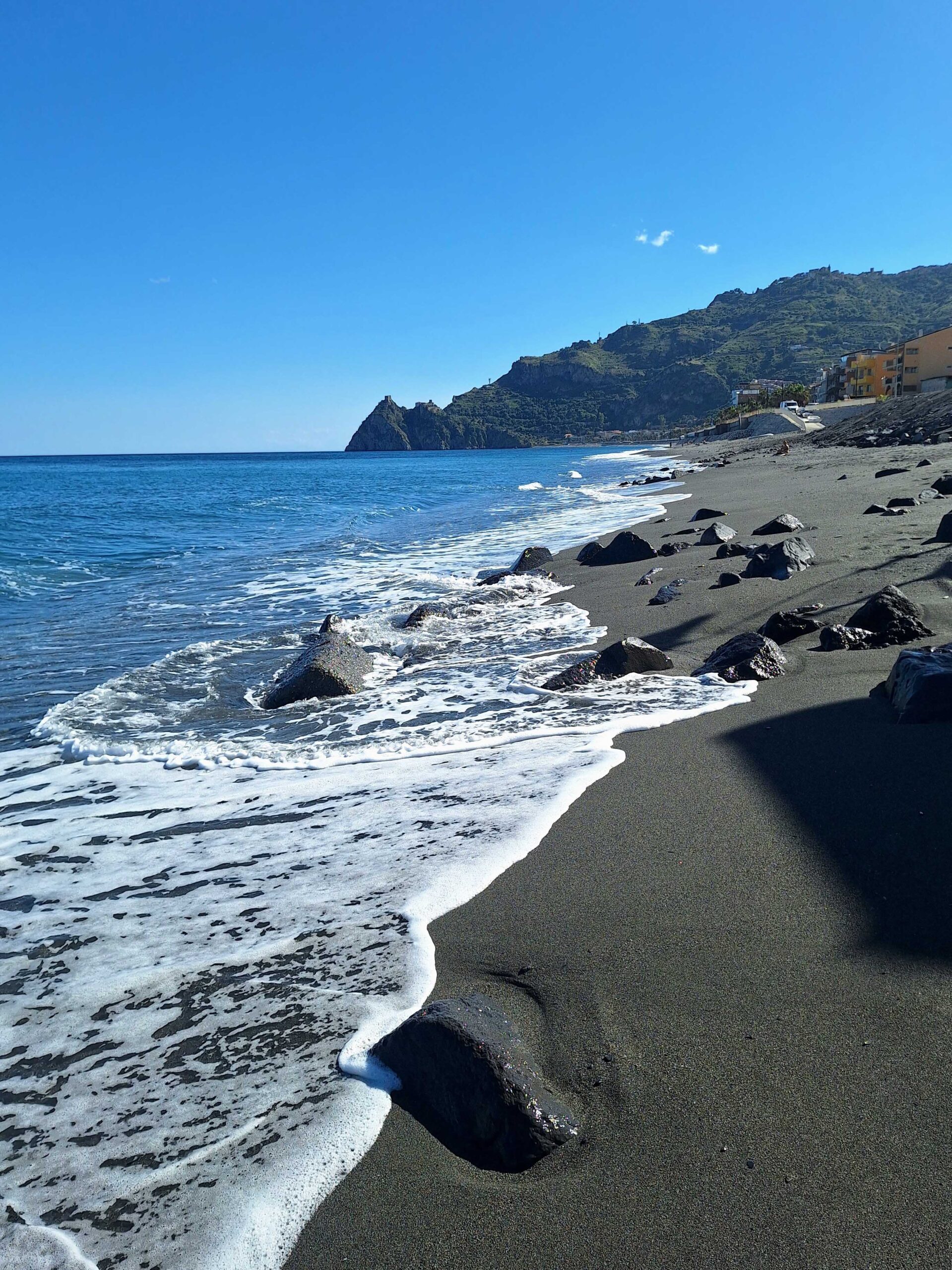 Genug gechillt, 🧘es zieht mich an den körnigen Vulkansandstrand „Spiaggia Sant‘ Alessio“! 🩴Die Farben des Wassers und des Horizonts, das Rauschen der Wellen, 🌊 die salzige Seeluft und der Sand zwischen meinen Zehen geben mir ein Gefühl von Freiheit und Leichtigkeit. Ich schwebe! Das Meer ist mein Ruhepol und meine Kraftquelle. 💪