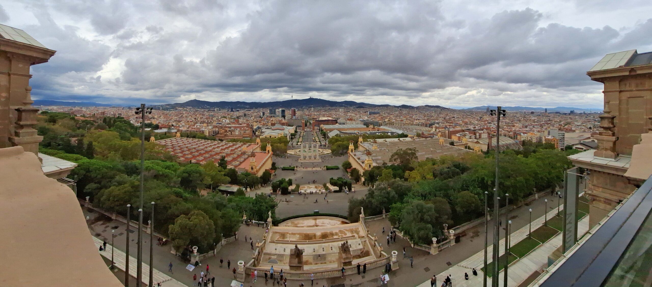 Aber am Ende des Dachrundgangs kommt die Überraschung! Da ist sie, eine herrliche Terrasse mit umwerfendem Blick auf die Font Màgica, ⛲die Cascaden vom Palau und die Vier Säulen, 💈💈💈💈welche die vier roten Streifen der katalanischen Flagge symbolisieren. Von hier haben wir die beste und atemberaubendste Aussicht über Barcelona bis hin zum Tibidabo, dem zweiten Hausberg der Metropole. In der Ferne 🔍🔎 sichten wir die ehemalige Stierkampfarena Las Arenas, 🏟️heute Shoppingcenter, in der wir zum Abschluss des Tages Cocktails 🍹🍸schlabbern werden.