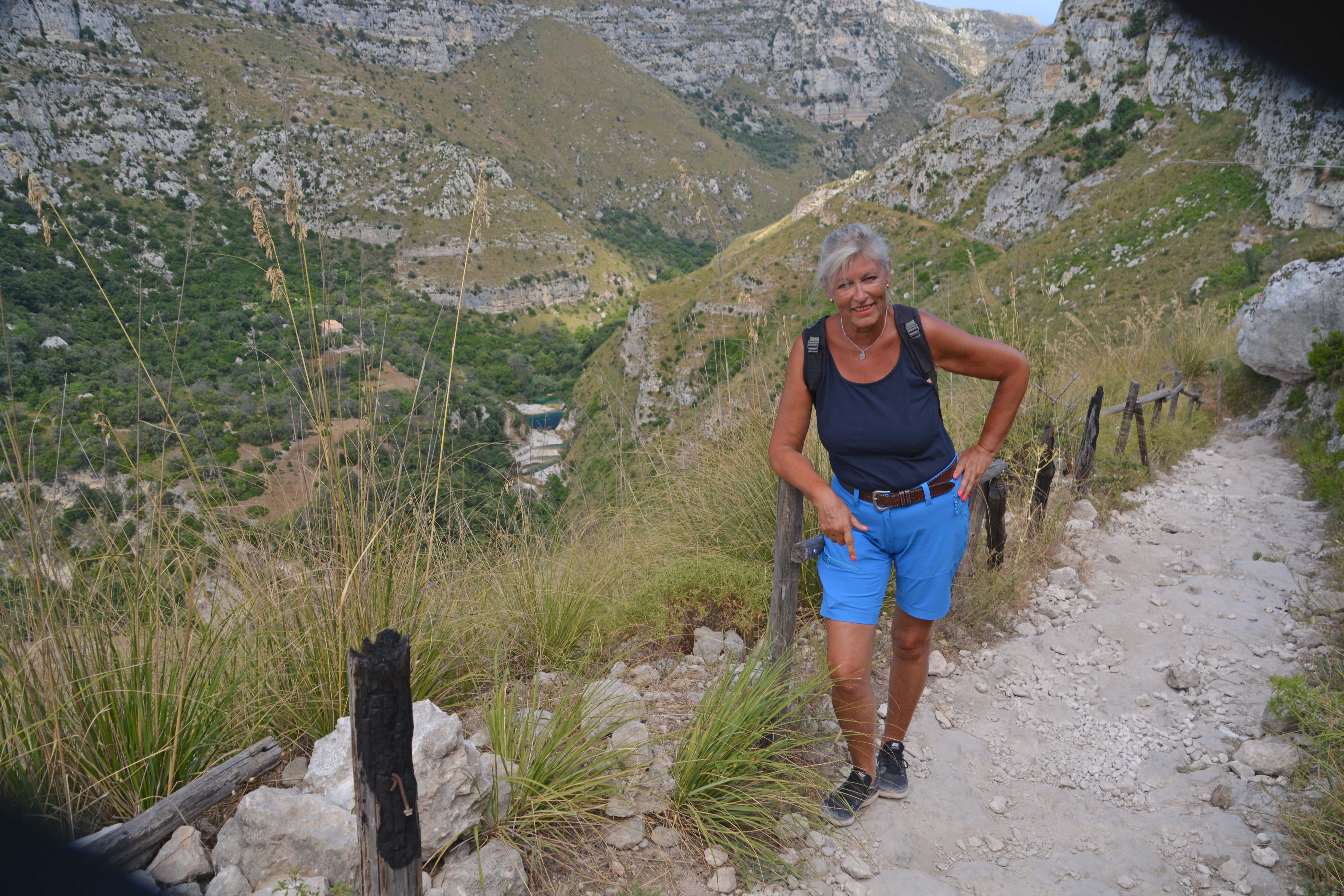 Um halbvier starten wir nach ersten atemberaubenden Blicken vom Hochplateau mit der Bar zum Abstieg in die Schlucht – bei schwülwarmen 29 Grad. Ziel sind die kristallgrün schimmernden ‚Laghetti‘, begehrte Badegumpen für die Wanderer zwischen terrassenartigen hellen Steinplatten. Der Weg führt über hohe Steinstufen über Serpentinen steil den hang hinunter steil, ist steinig, schmal und nur manchmal mit Holzbalken gesichert. Dafür werden wir mit fantastischen Ausblicken auf die grandiosen, steilen Bergwände belohnt. Üppige Macchia und riesige asiatische Planen bestimmen das Landschaftsbild. Immer wieder läuft uns das Wasser im Munde zusammen, wenn wir die fantastisch schimmernden glasklaren Badegumpen in der Tiefe erblicken. Ich will da jetzt rein, denke ich, und habe noch mindestens 100 Meter Abstieg vor mir. Mittlerweile hat es sich bewölkt.