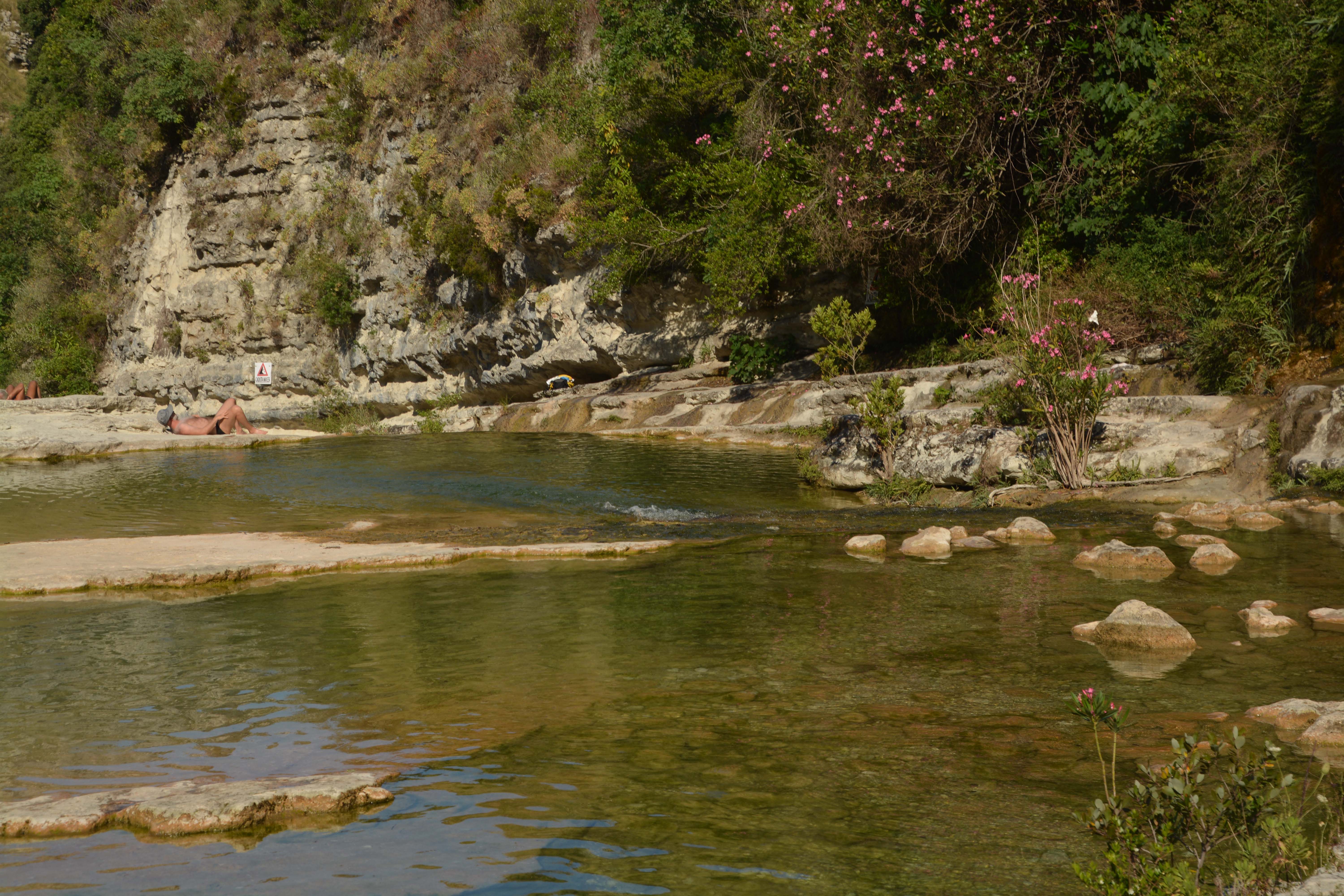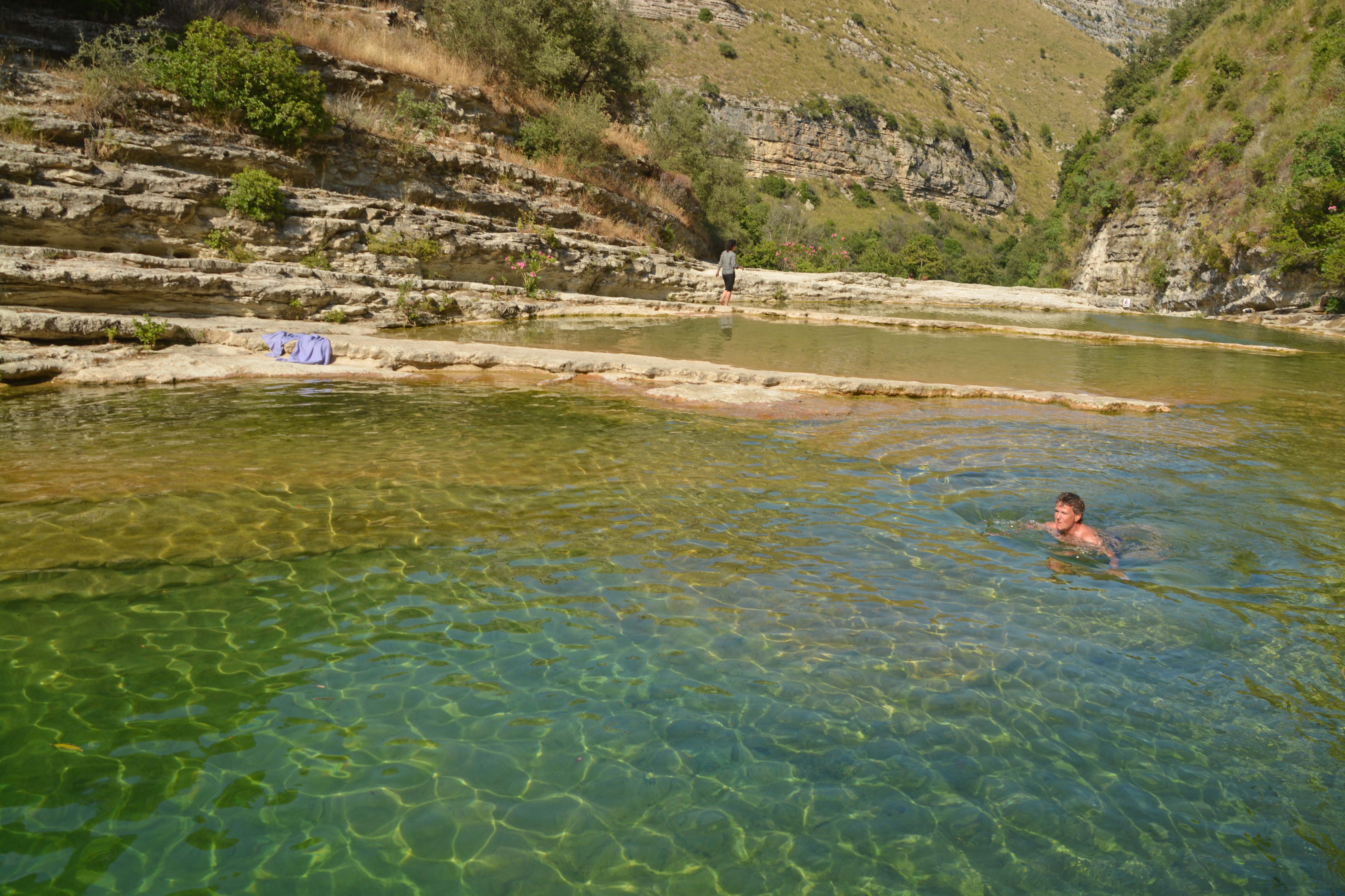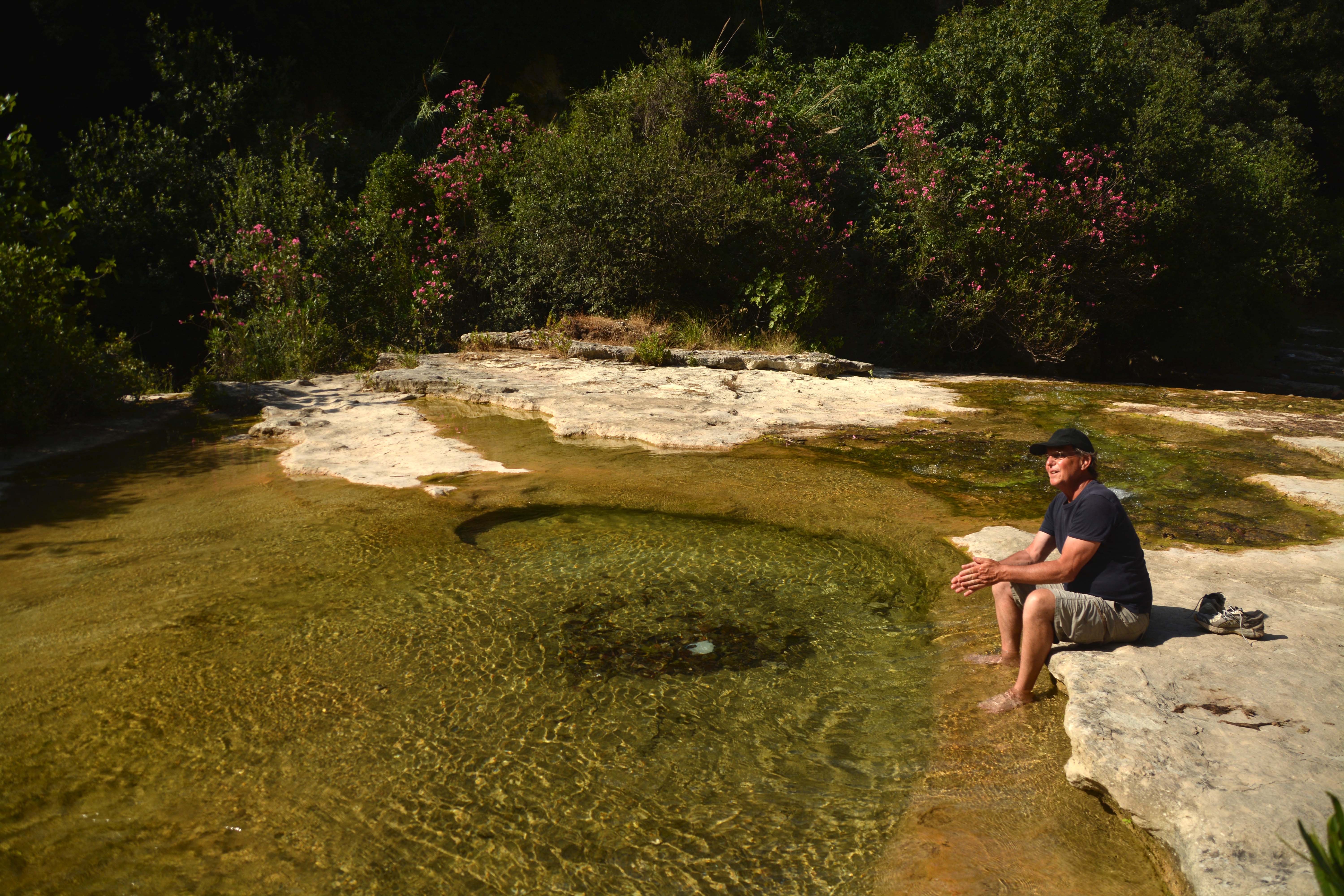 Wow, endlich. Wir hören jauchzende Stimmen, die aus den Badegumpen kommen müssen. Nach 1 ¼ Stunden Abstieg erreichen wir das Traumziel. Umgeben von Felswänden öffnet sich das Tal in seiner ganzen Pracht. Phänomenal. Klaus ist begeistert. Erstmal auf die glatt gespülten Felsplateaus setzen, das Flusstal genießen, die Macchia riechen, die Oleandersträucher und Schilfbüschel bewundern und die sagenhaft tiefgrüne Wasserfarbe genießen. Ganz großes Paradies-und-Gumpen-Kino!