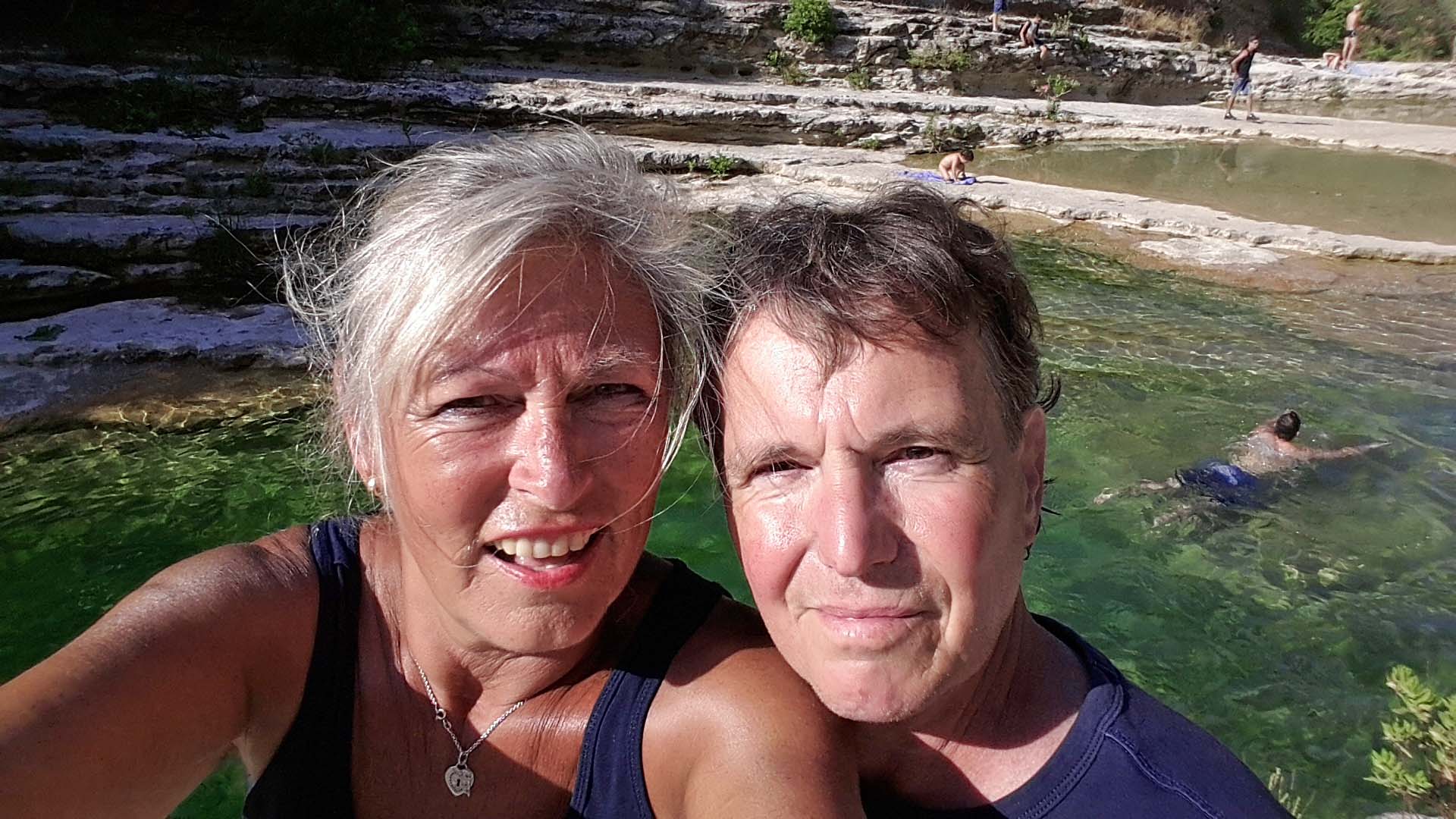 Nach einer Stunde Genuss beginnen wir den Aufstieg. Nur nicht nach oben gucken, sage ich mir. Immer schön langsam und regelmäßig Schritt für Schritt nach oben trotten. Wir haben Glück, dass der Pfad jetzt meist im Schatten liegt. Natürlich ist es anstrengend, der Schweiß rinnt und ich denke pausenlos an die herrlichen Gumpen.  Plötzlich ändern sich die Gedanken in Richtung Kaltgetränke aus der Bar. Und richtig, nur noch zwei Wegbiegungen und wir kommen leicht erschöpft, aber mit tollen Natureindrücken nach einer dreiviertel Stunde Aufstieg wieder am Ausgangspunkt an. Bei Bier und Eistee schauen wir uns das Naturspektakel nochmal an und ich bin ein bisschen stolz, dass die RentnerinAuf- und Abstieg ohne Blessuren gemeistert hat.