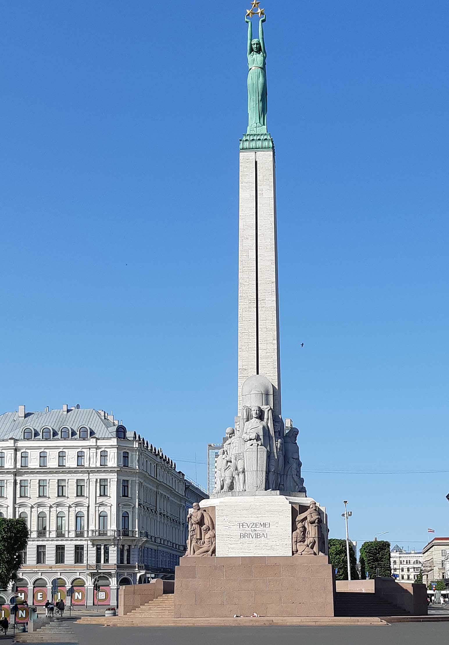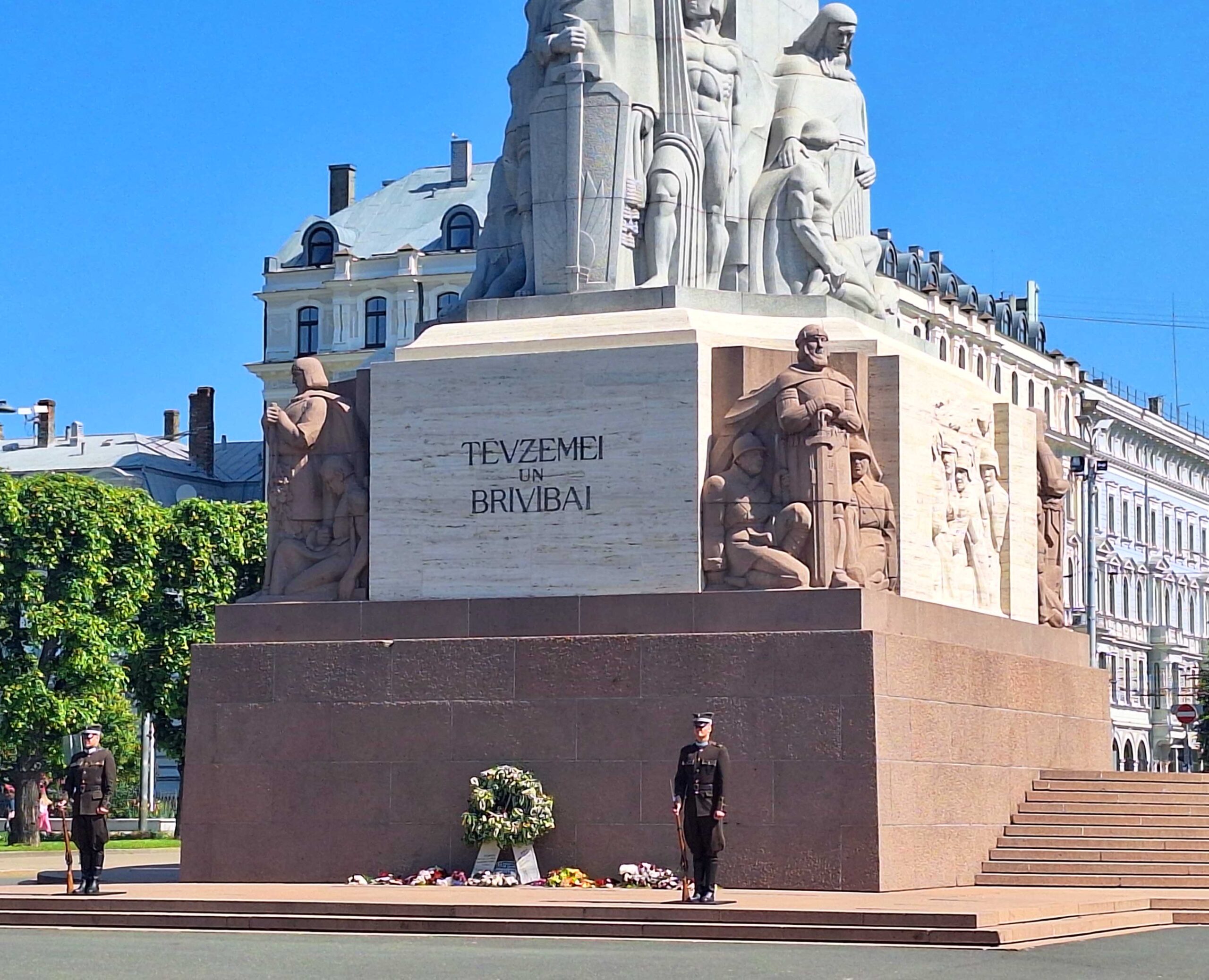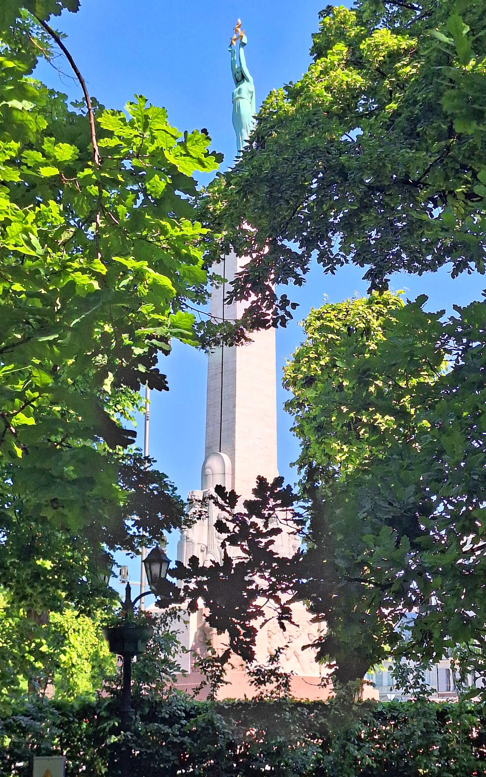 Wenige Minuten später stehen wir auf dem Freiheitsboulevard vor dem 42 Meter hohen Freiheitsdenkmal (1935). Es ist äußerst bedeutend für die Letten, denn es steht für Vaterland und Freiheit und richtet sich demonstrativ nach Westen aus. Bewacht wird es von der Ehrengarde, 🪖🪖🪖die stündlich abgelöst wird. In der Nähe steht ein Soldat, der sicherstellt, dass alles korrekt abläuft. Ines verwickelt ihn in ein längeres Gespräch und erhält Antworten auf ihre Fragen. ❓❓❓Im Volksmund heißt die Statue Milda, einmal der beliebteste Mädchenname. Die Letten selbst haben durch ihre Spenden 👛🪙👛🪙 den Bau ermöglicht. Der Boulevard wurde bis 1812 als Exerzierplatz der in Riga stationierten zaristischen Truppen benutzt. Kaum zu glauben, dass im Mittelalter einmal Sanddünen standen!