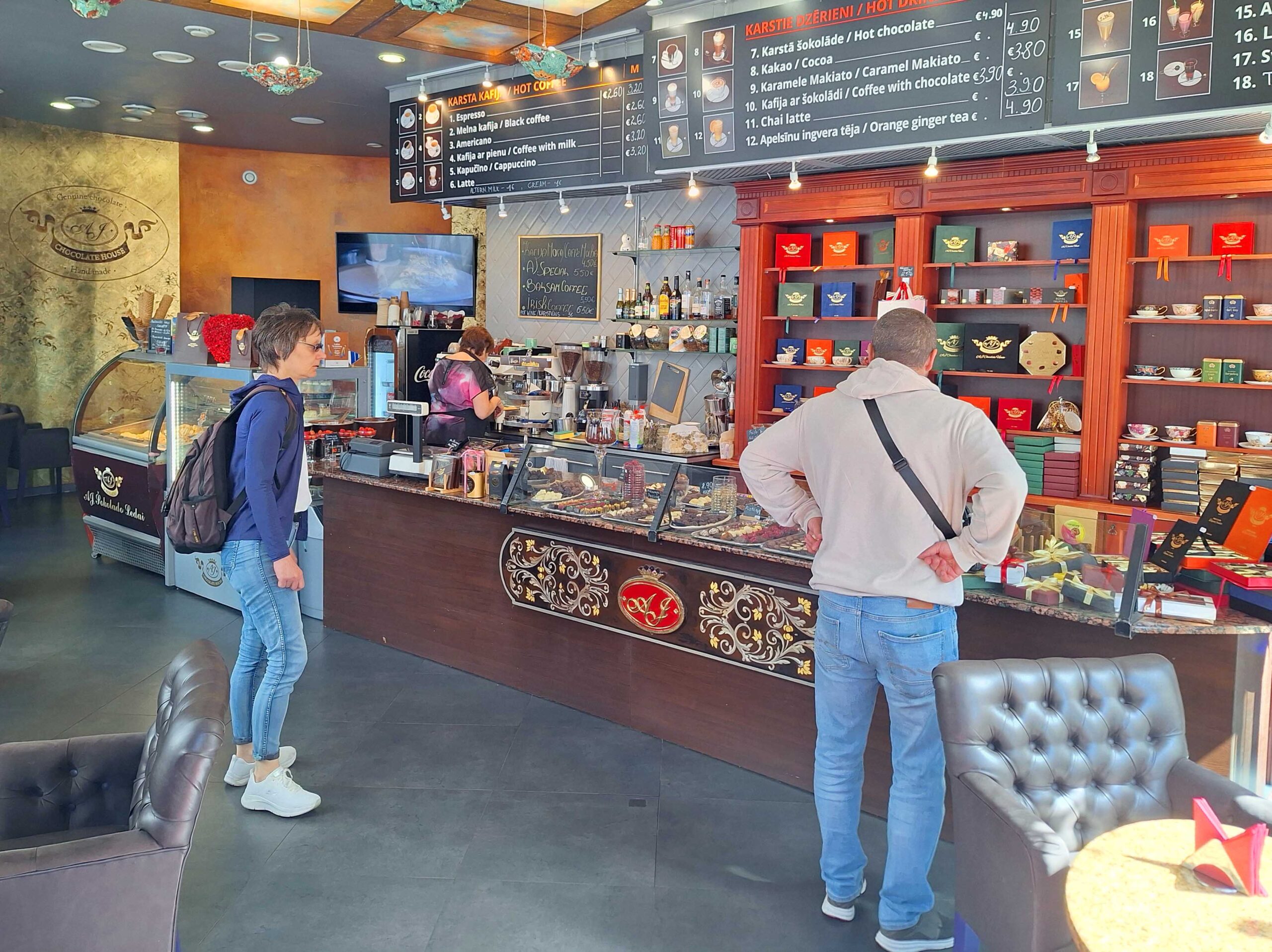 Birgit muss sich heute im Schokoladengeschäft 🍫für ihre Mitbringsel entscheiden und im Touriladen des Schwarzhäupterhauses kaufen wir für „echte Männer“ den für Lettland bekannten „Rigaer Schwarz-Balsam“. Das ist ein traditioneller, hochprozentiger Likör, der aus Kräutern, 🌿🌿 Blüten🌸🌸🌸, Ölen 🛢️und Beeren 🫐🫐🫐 hergestellt wird.