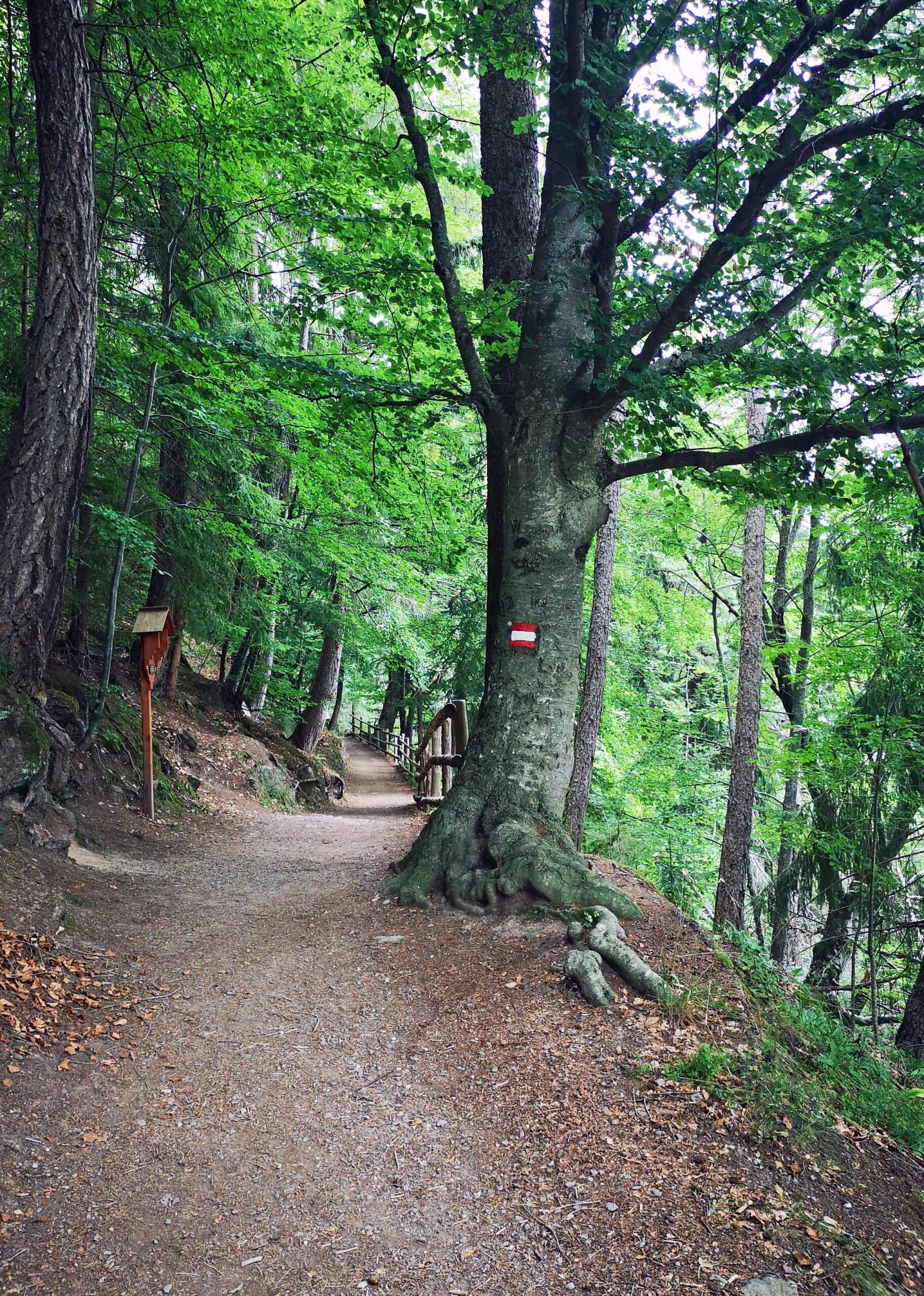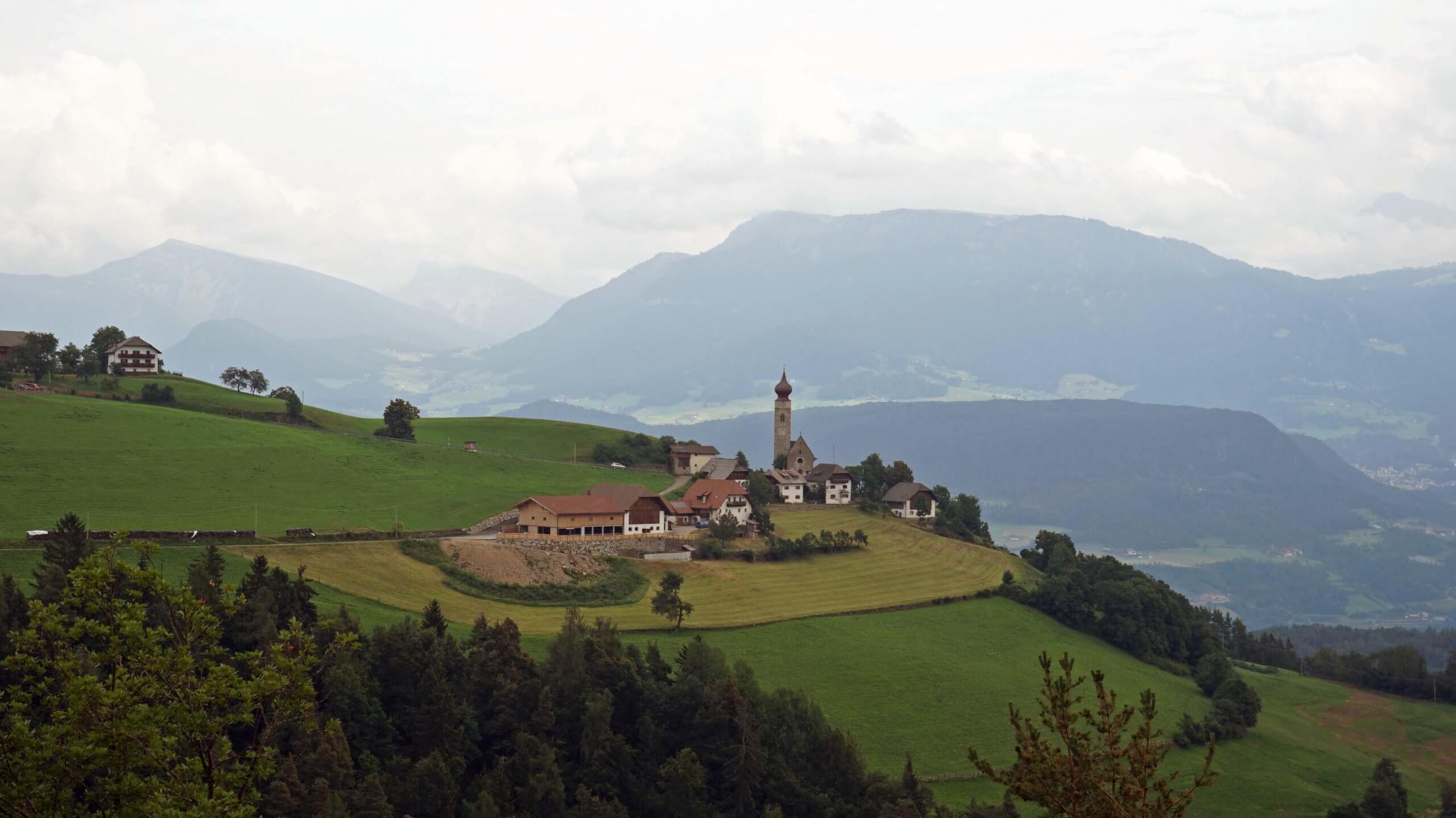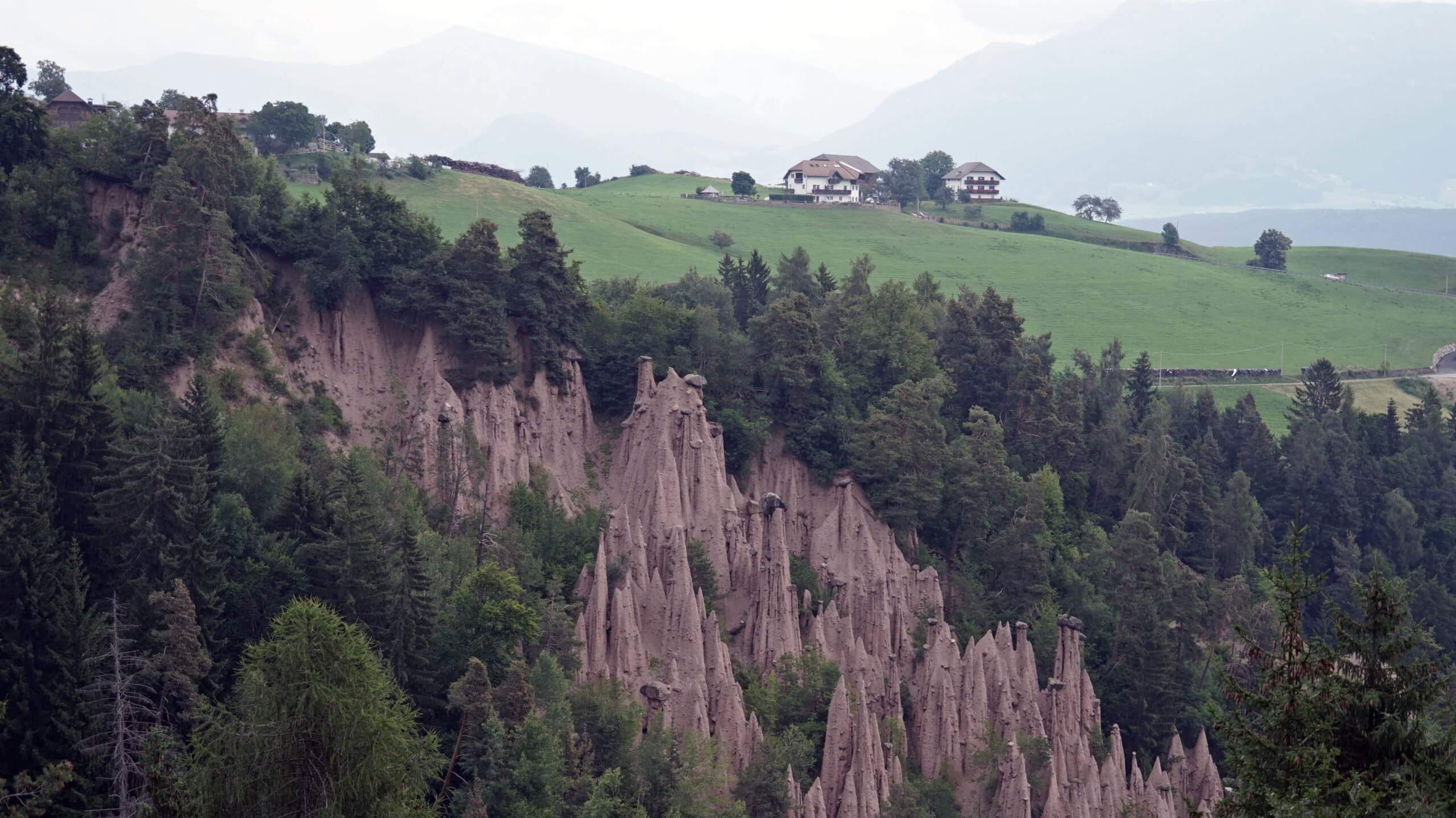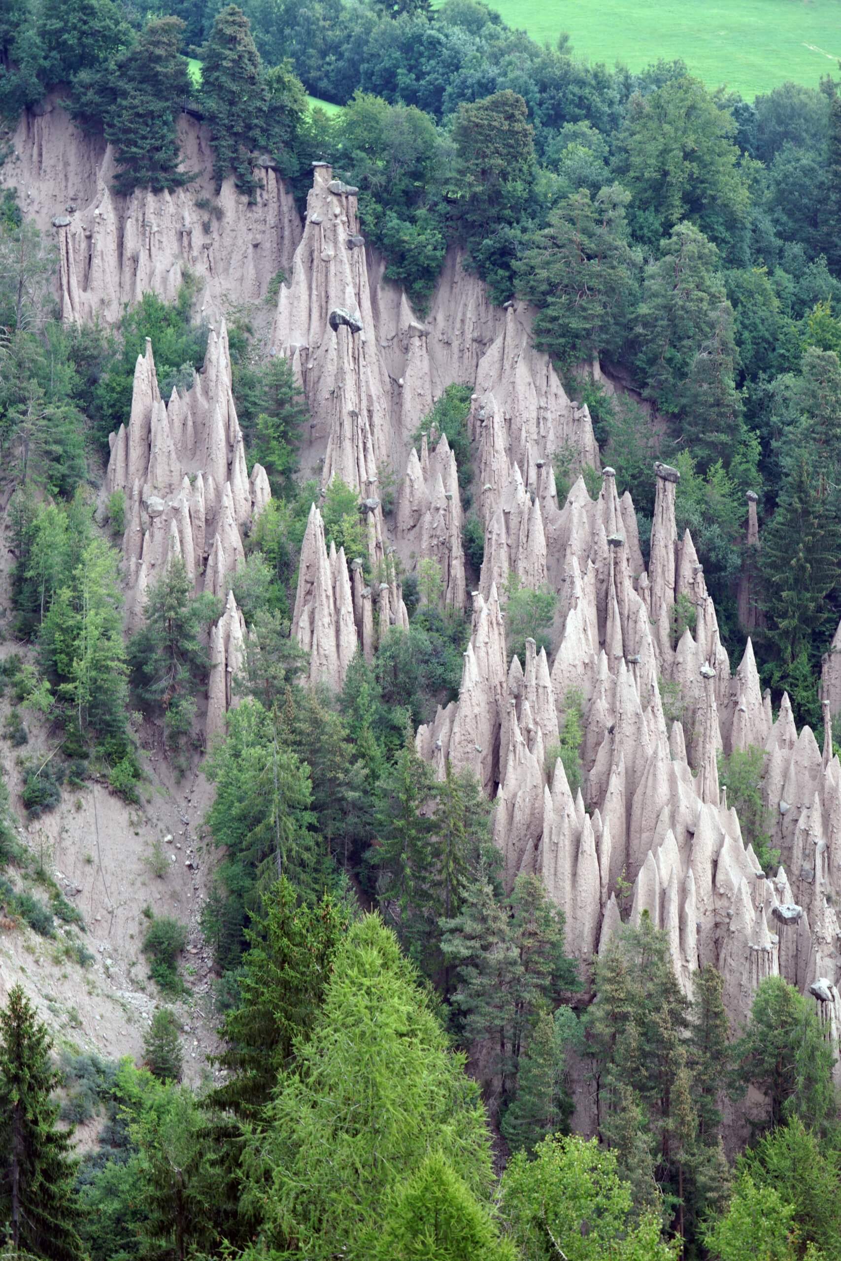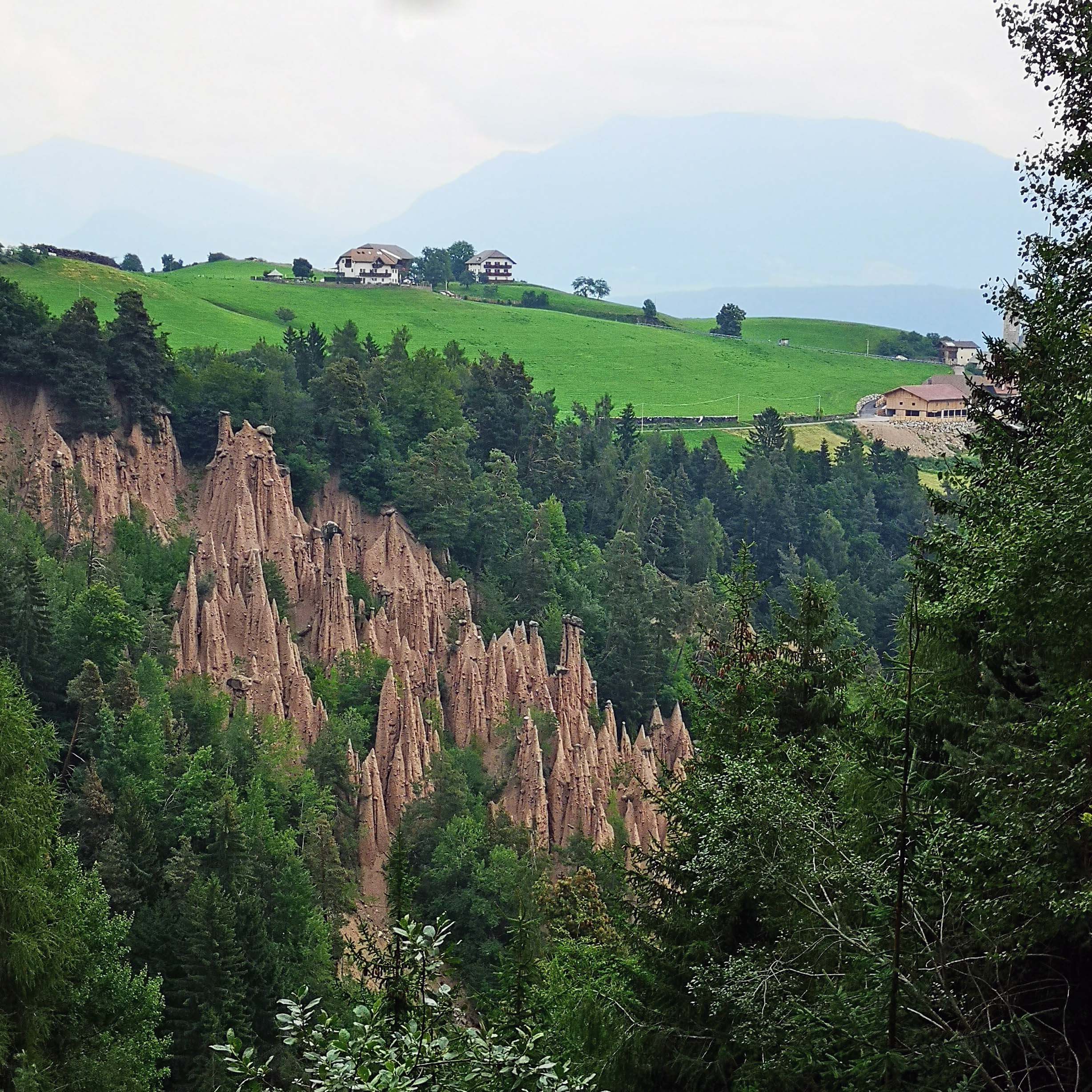 Meine Einstiegswanderung (Nr. 24) nach dem gestrigen nervenaufreibenden Autobahnverkehr führt von Klobenstein zu den Lengmooser Erdpyramiden im Finsterbachtal, eine der berühmten Sehenswürdigkeiten dieser Gegend, die aus dem Moränenschutt eiszeitlicher Gletscher entstanden sind. Es handelt sich um bizarre aus Lehm gewachsene Säulen. Die Aussichtsterrassen bieten nicht nur tolle Blicke auf die pilzförmigen Gebilde, sondern vor allem auch auf die dahinterliegenden Dolomiten. Heute ist es dafür leider zu diesig. Das prachtvolle Bergpanorama versteckt sich hinter den Wolken.