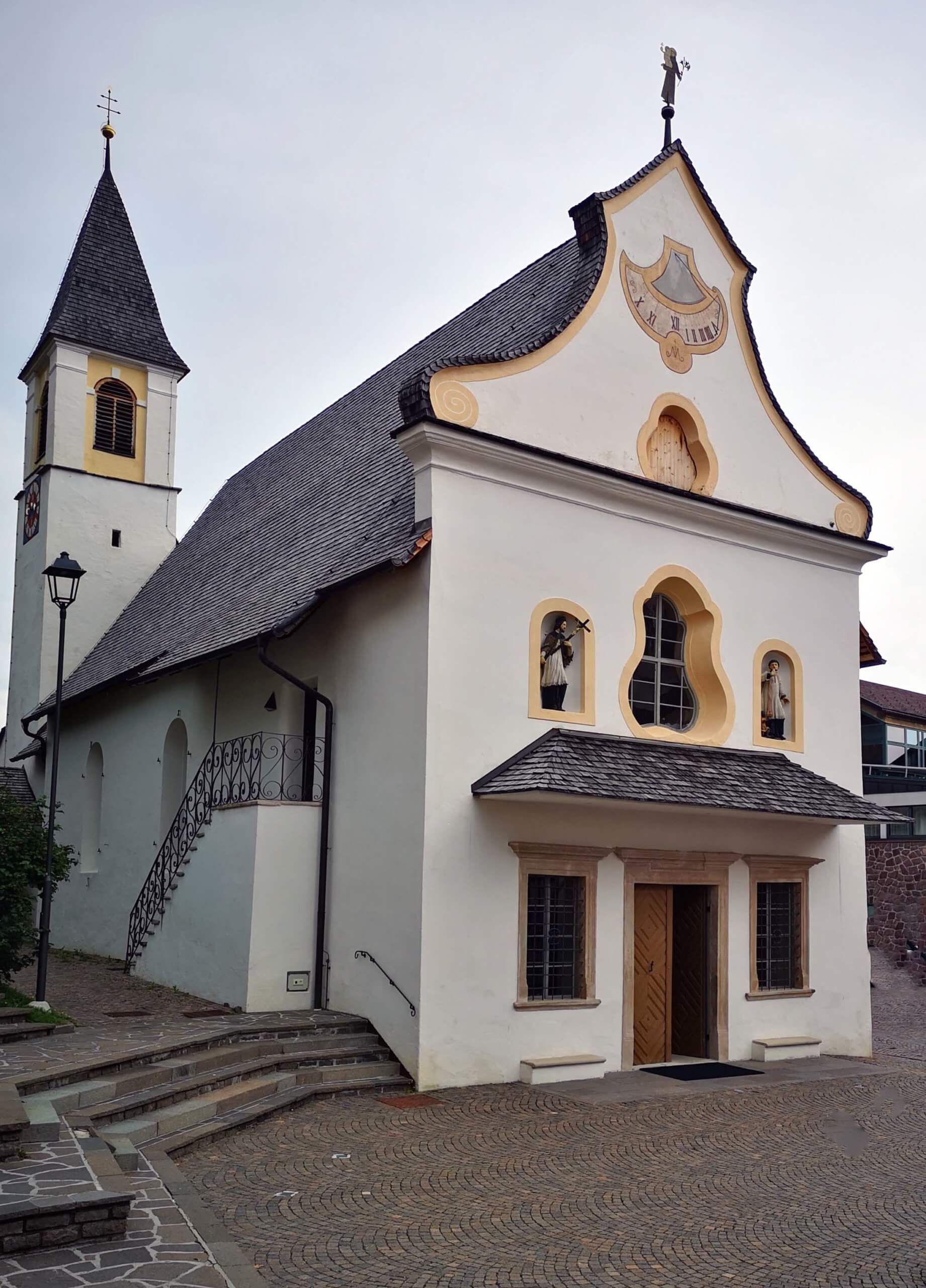 Es ist warm, hat ein paar wärmende Sonnenstrahlen und viele Wolken und ich starte um halbelf mit dem Rad zur etwa 6 Kilometer entfernten Seilschwebebahn- zum Hausberg in Bozen. Es ist nicht viel los. Die Fahrt führt mich durch den bekannten Bozener Stadtteil Gries. Ich mache einen kurzen Abstecher zur idyllisch gelegenen mit „Alten Grieser Pfarrkirche“, die eingebettet in einem alten Friedhof liegt.