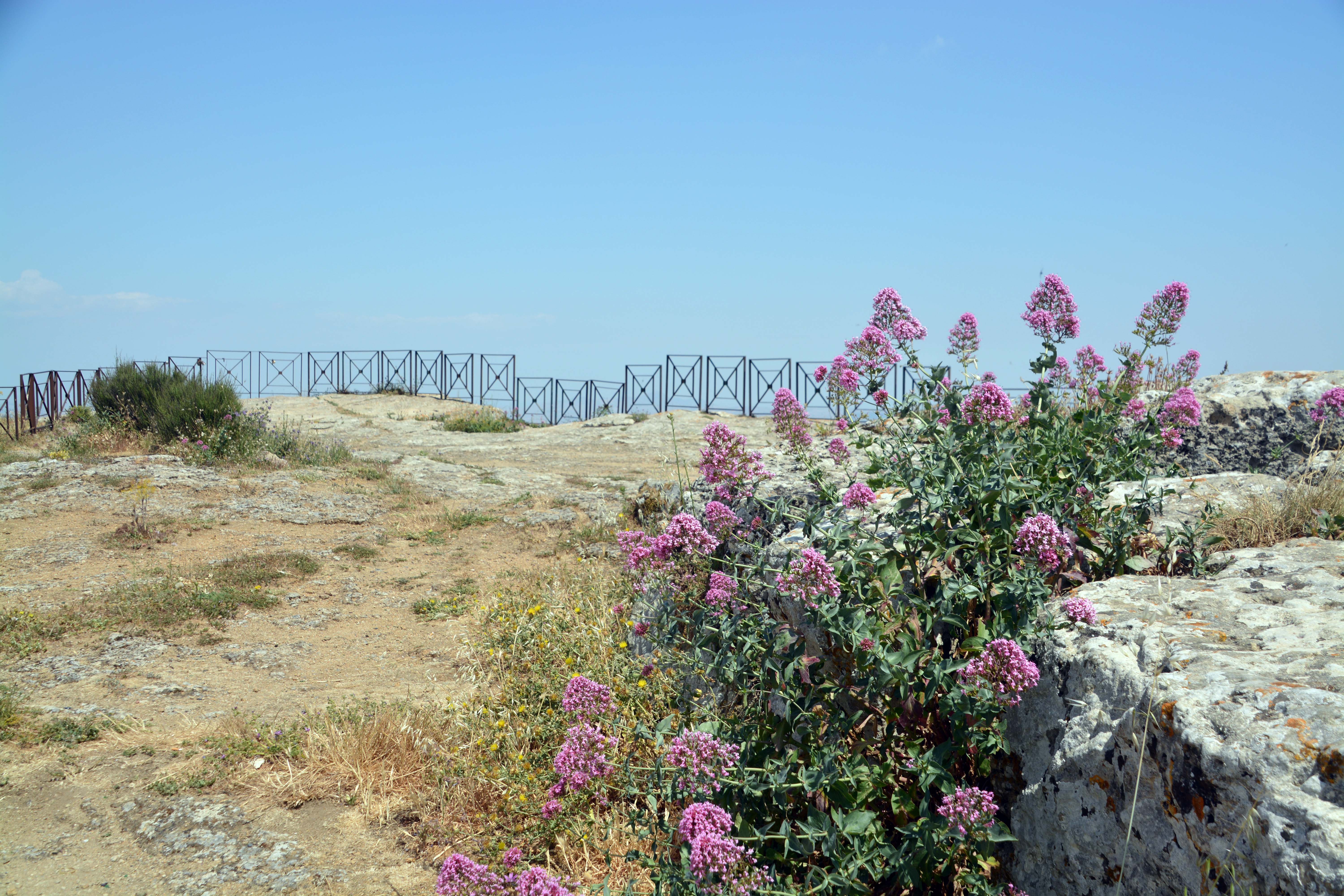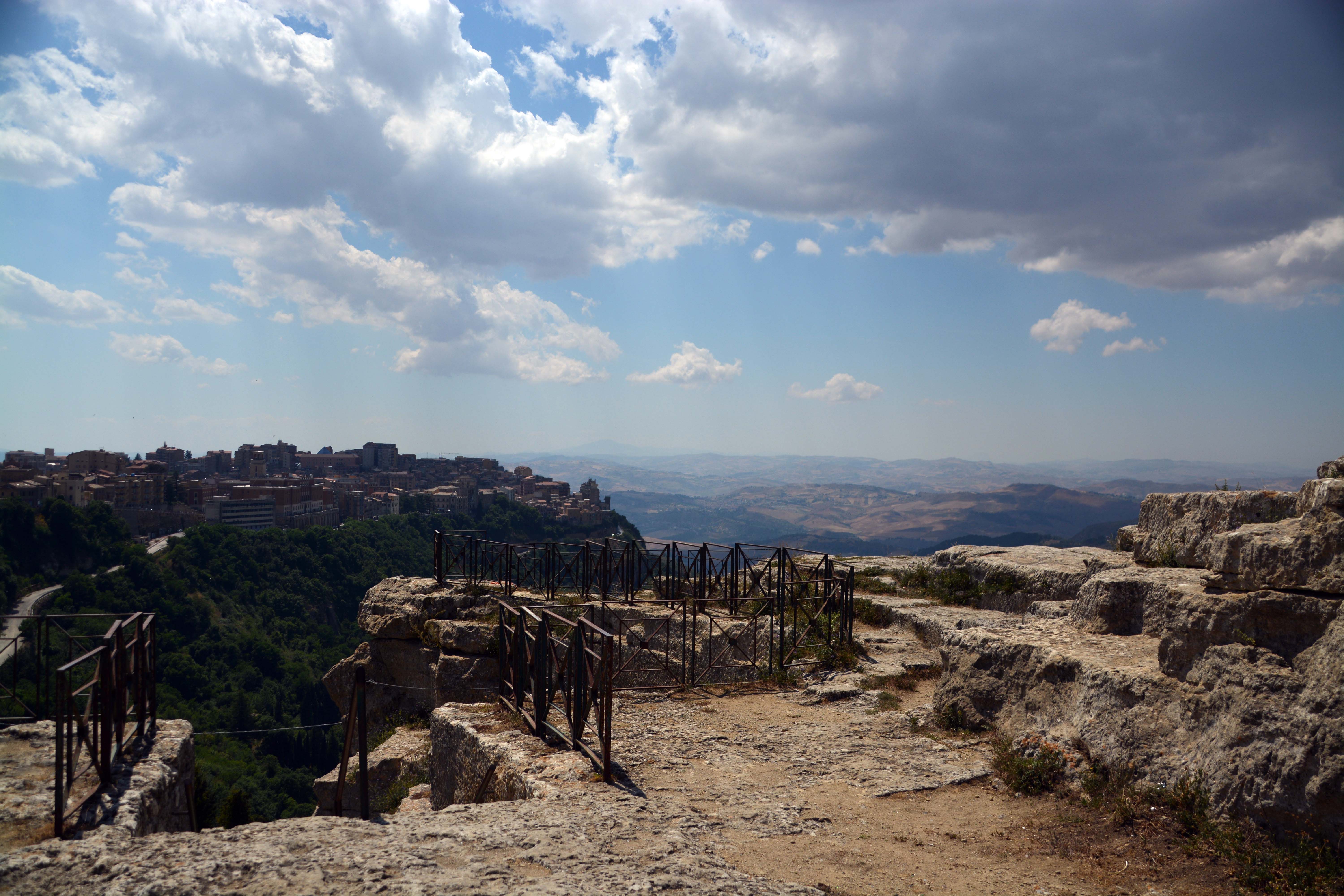 Das Castello sieht an vielen Stellen wie eine Baustelle aus. Wir vermuten, dass es an vielen Stellen restauriert wird und jetzt mal eben eine längere Pause eingelegt wird. Wir können nicht hinein, also laufen wir erstmal drumherum. Dabei findet Klaus den ‚Rocca di Cerere‘, einen kleinen Felsvorsprung, den wir besteigen. Hier befand sich einst das von Cicero beschriebene berühmte Demeterheiligtum. Wir genießen einen tollen Blick auf Enna.