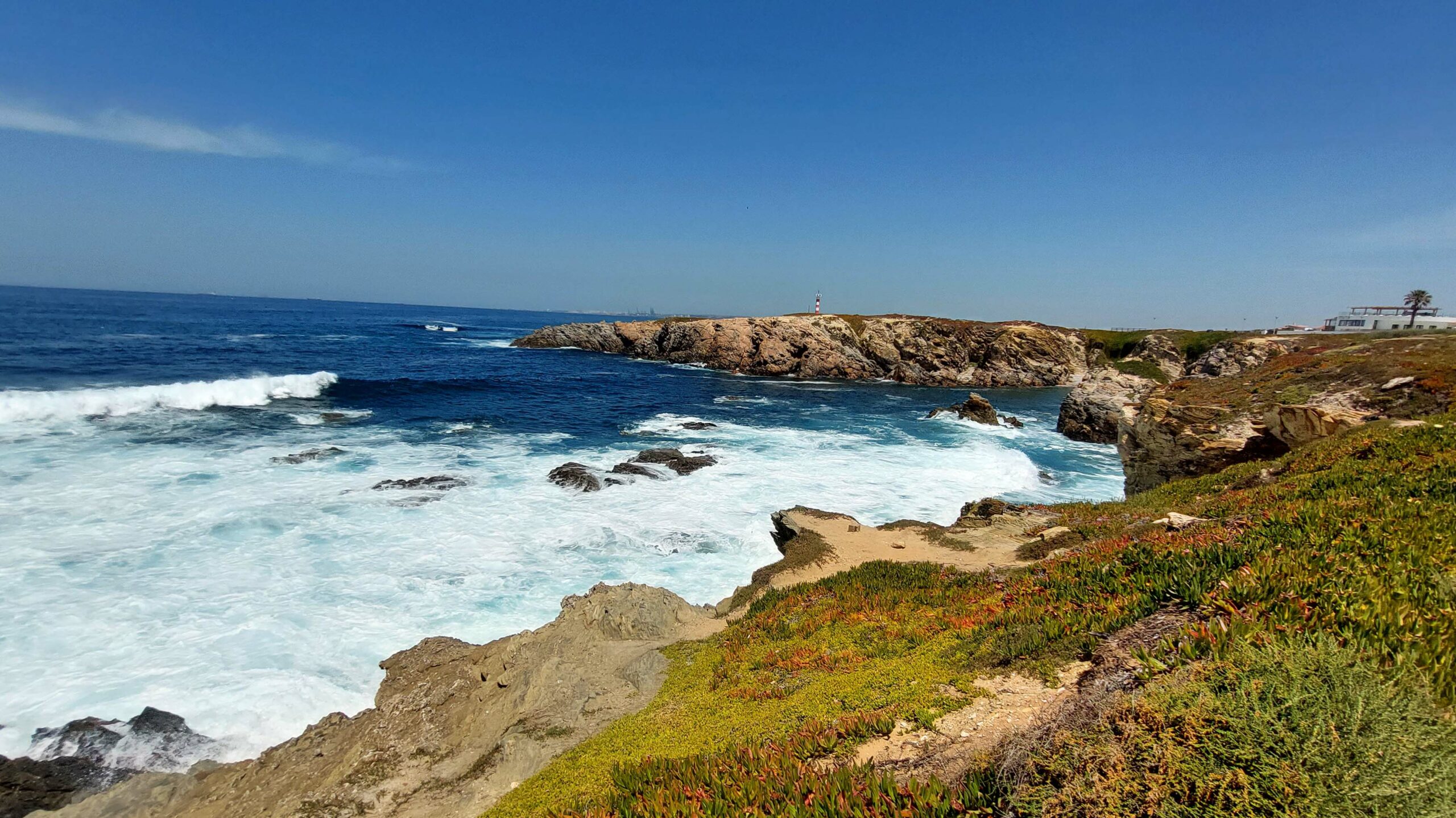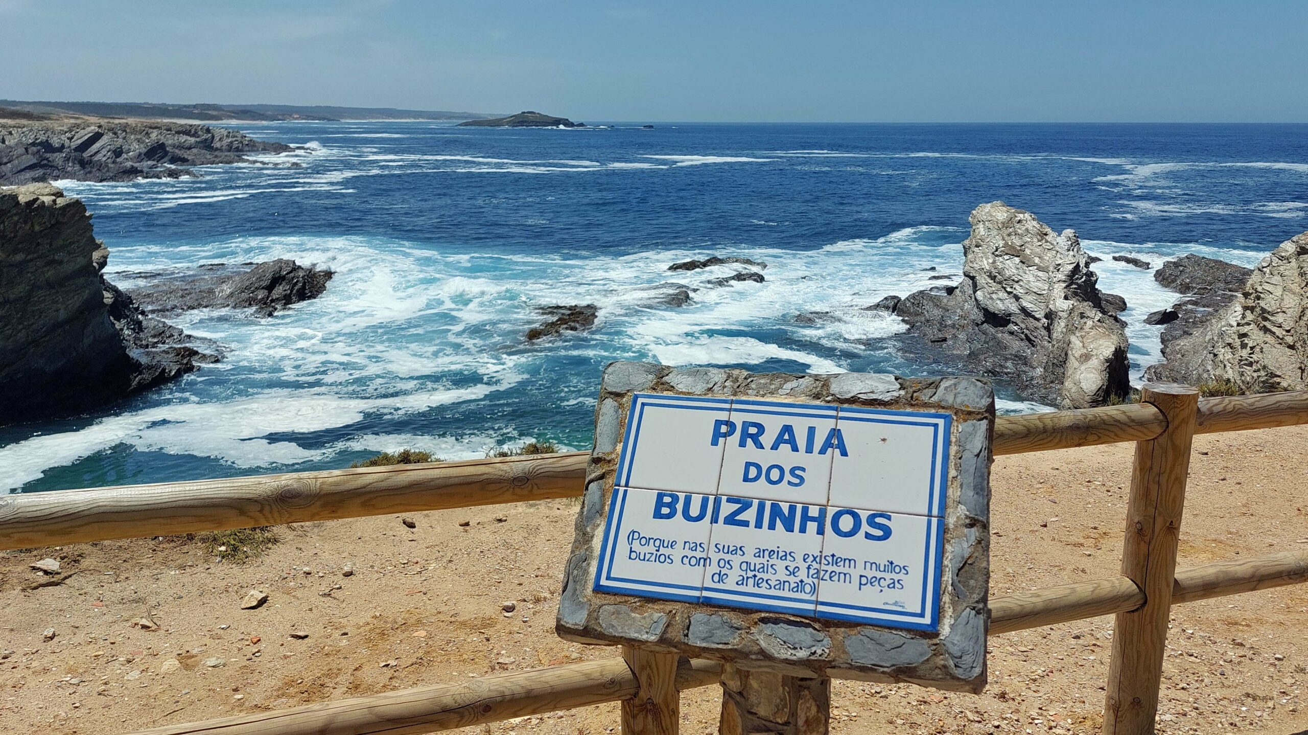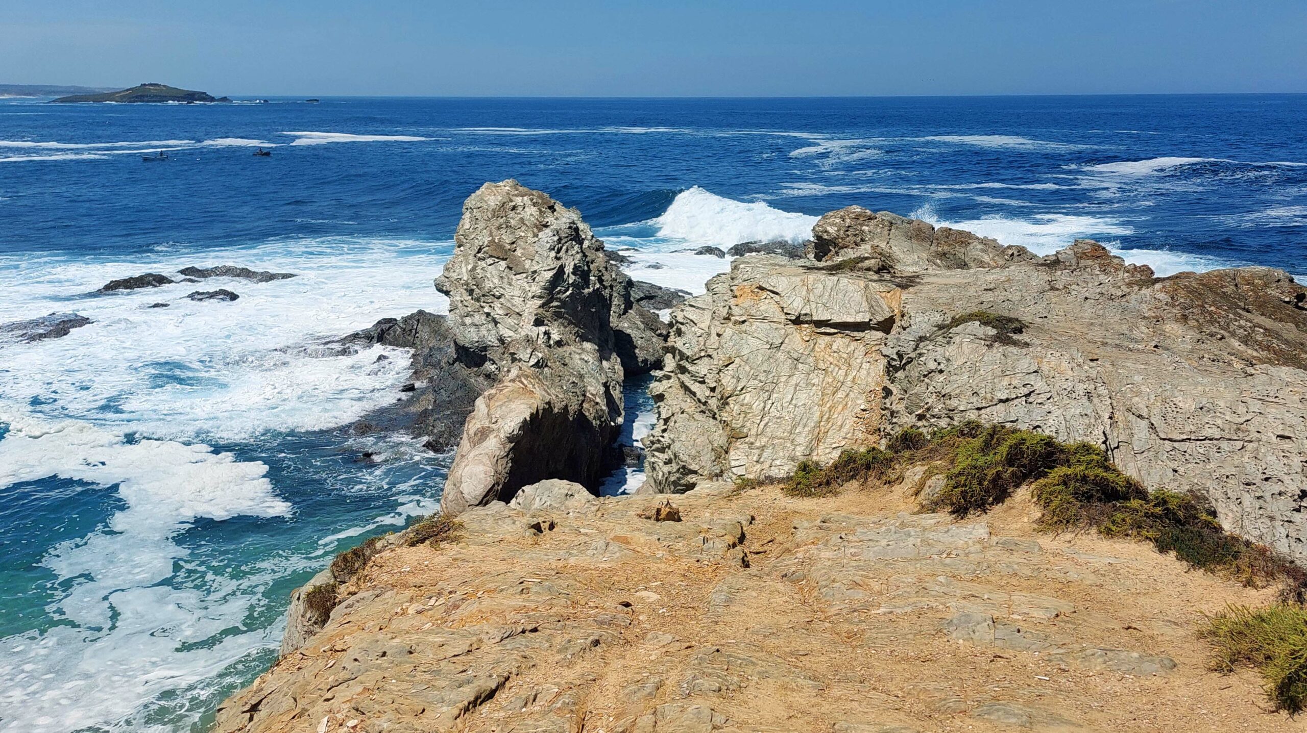 Ich erreiche das hübsche Porto Covo mit seinen gepflegten weiß-blauen Häusern und einem ausgezeichneten Strand. Im Fischerdorf selbst geht es recht touristisch zu. Ich suche zunächst den pompös ausgeschilderten Porto de Pesce gegenüber der vorgelagerten Insel „Ilha do Pessegueiro“. Mit Fiete ist das wegen der engen Gassen nicht möglich, aber zu Fuß werde ich fündig. Der Hafen ist eine einzige Enttäuschung, dafür ist die Küste traumhaft. Der Atlantik rollt hier mit voller Wucht an Land.