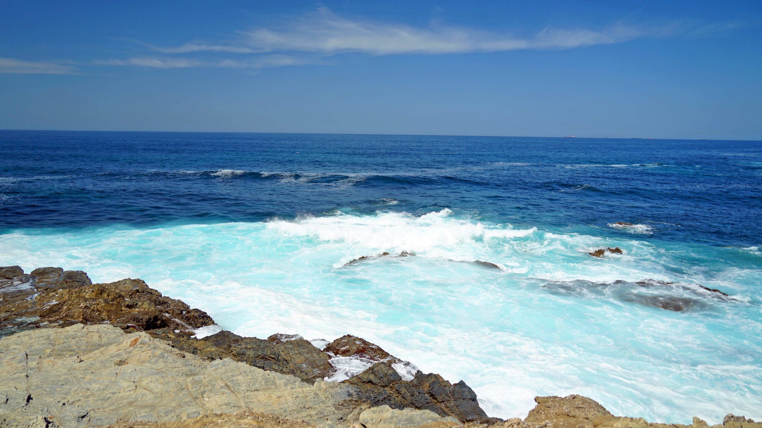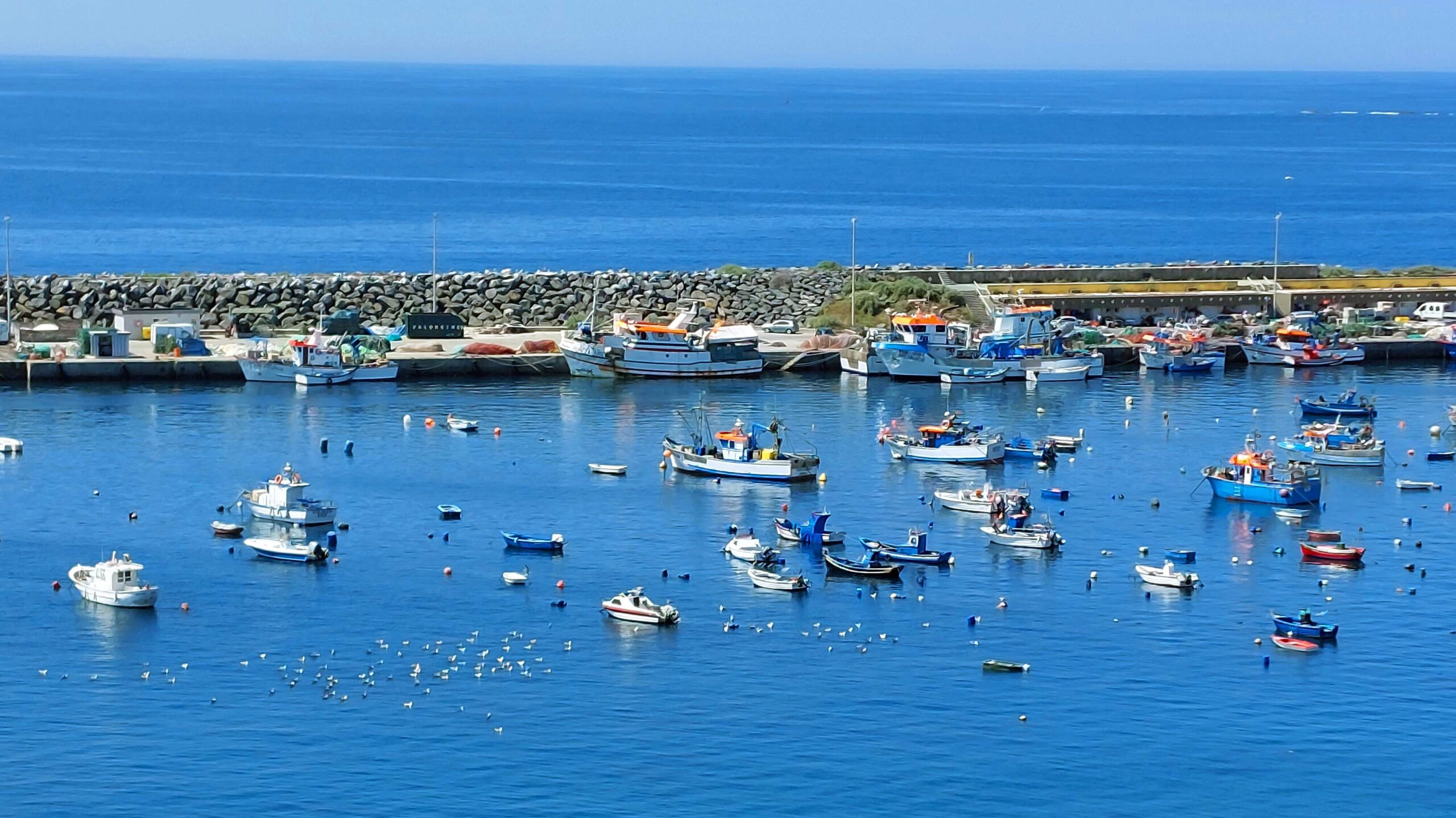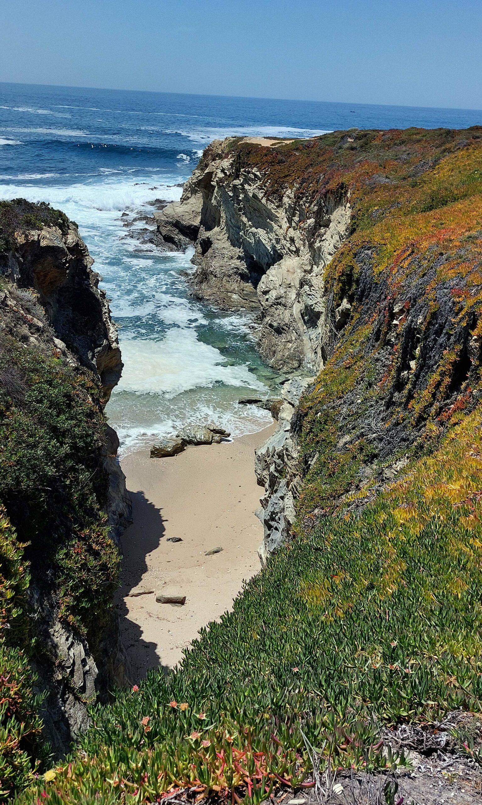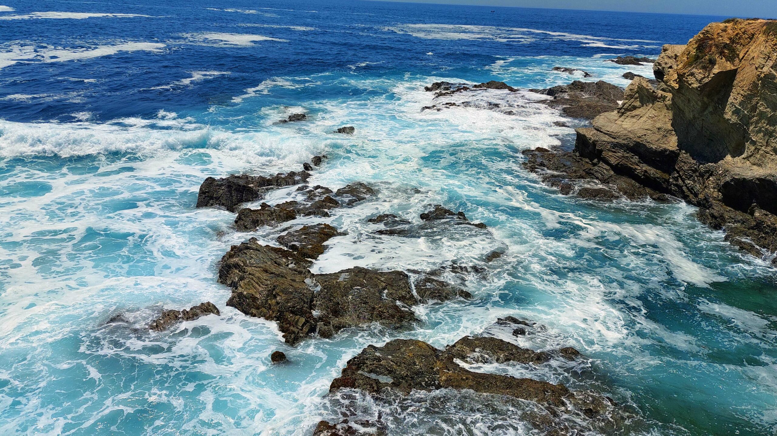 Ich erreiche das hübsche Porto Covo mit seinen gepflegten weiß-blauen Häusern und einem ausgezeichneten Strand. Im Fischerdorf selbst geht es recht touristisch zu. Ich suche zunächst den pompös ausgeschilderten Porto de Pesce gegenüber der vorgelagerten Insel „Ilha do Pessegueiro“. Mit Fiete ist das wegen der engen Gassen nicht möglich, aber zu Fuß werde ich fündig. Der Hafen ist eine einzige Enttäuschung, dafür ist die Küste traumhaft. Der Atlantik rollt hier mit voller Wucht an Land.