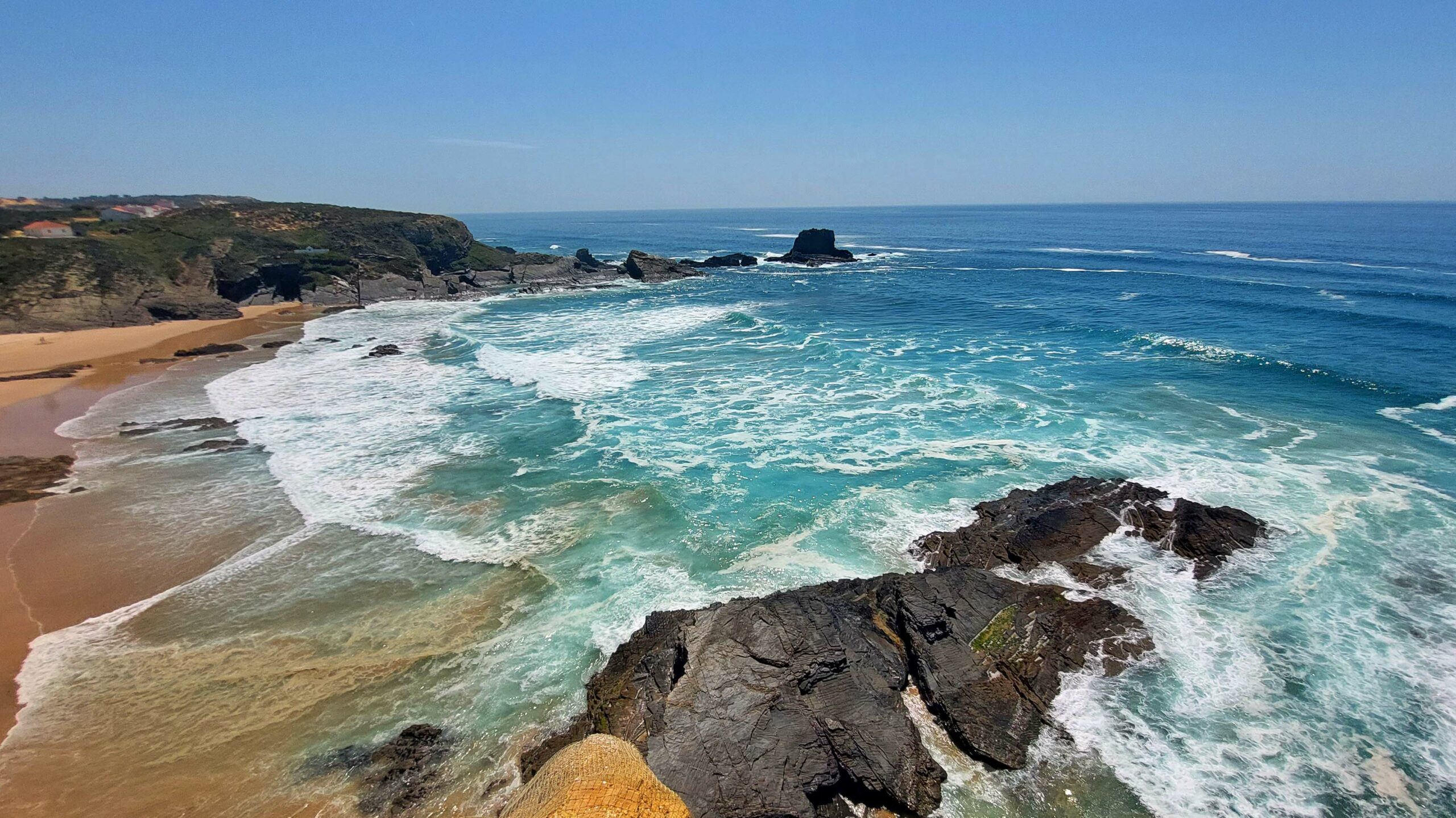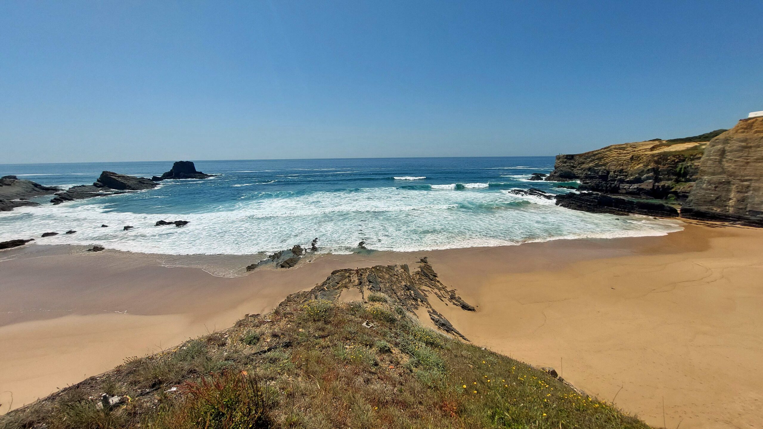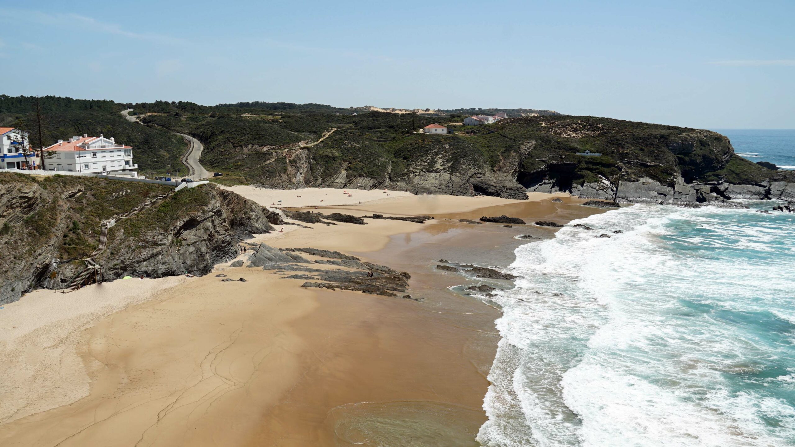 Am Ende der kilometerlangen Holperstrecker treffe ich auf das Fischerdorf an der schroffen Felsküste. Ein typischer Badeort. Das Highlight hier ist die weiß gekalkte Kapelle “Capela de Nossa Senhora do Mar‘ mit der Schutzpatronin der Fischer. Das denkmalgeschützte Kleinod thront unmittelbar über der Steilküste auf einer 130 Meter hohen Klippe. Gleich nebenan befindet sich der Hausstrand mit dunklem Sand und von Felsklippen umrahmt.