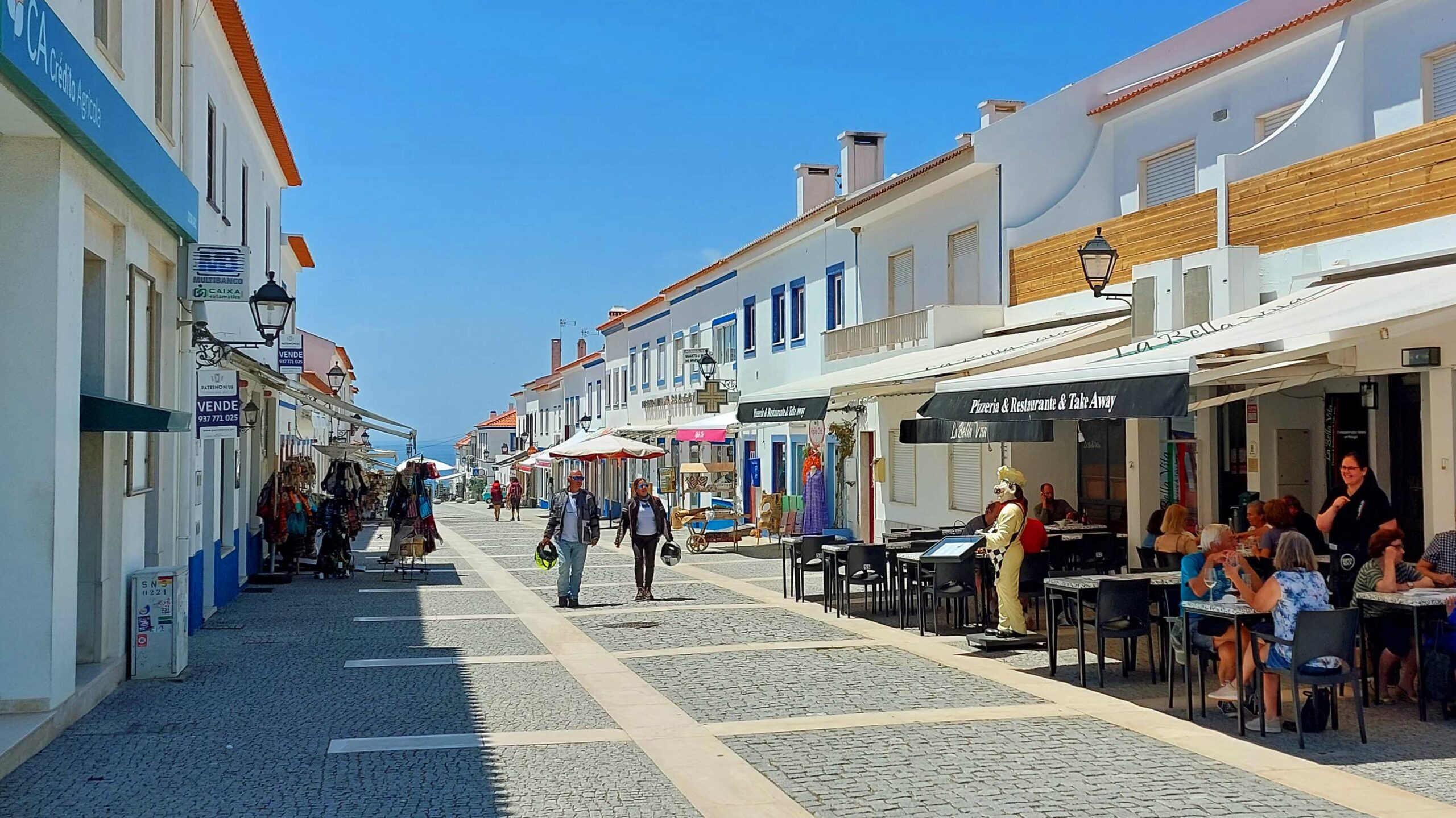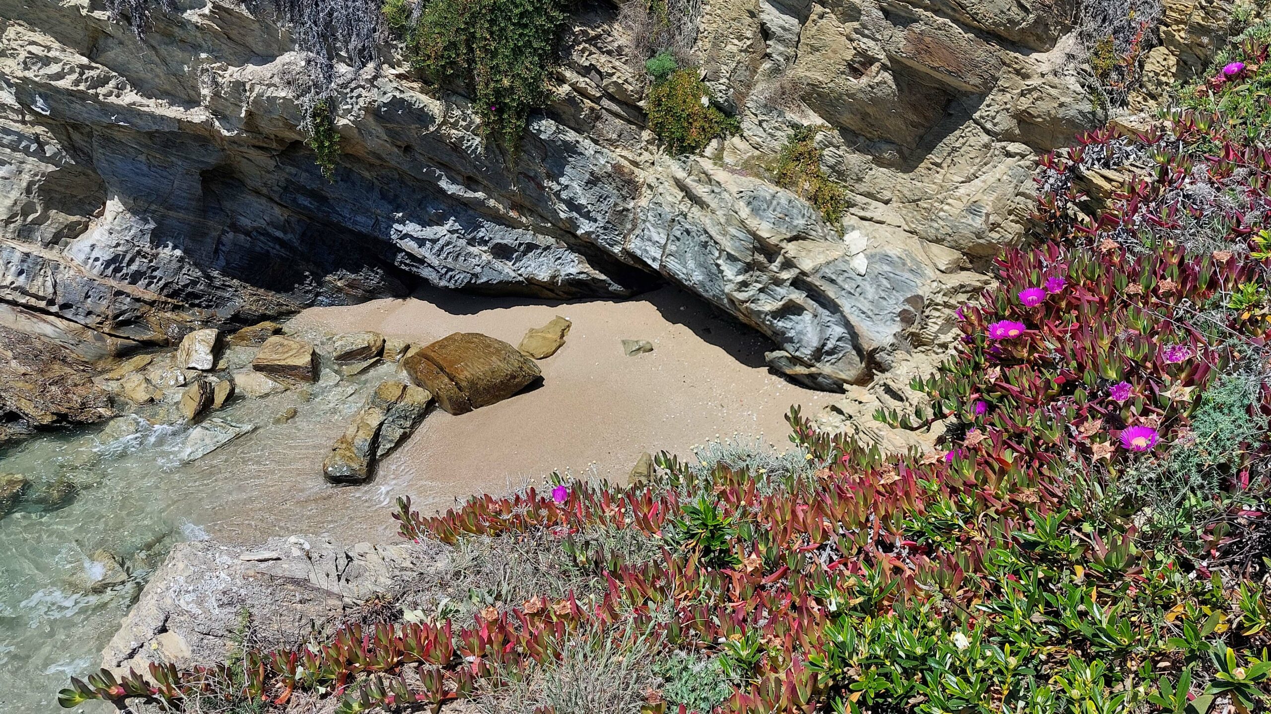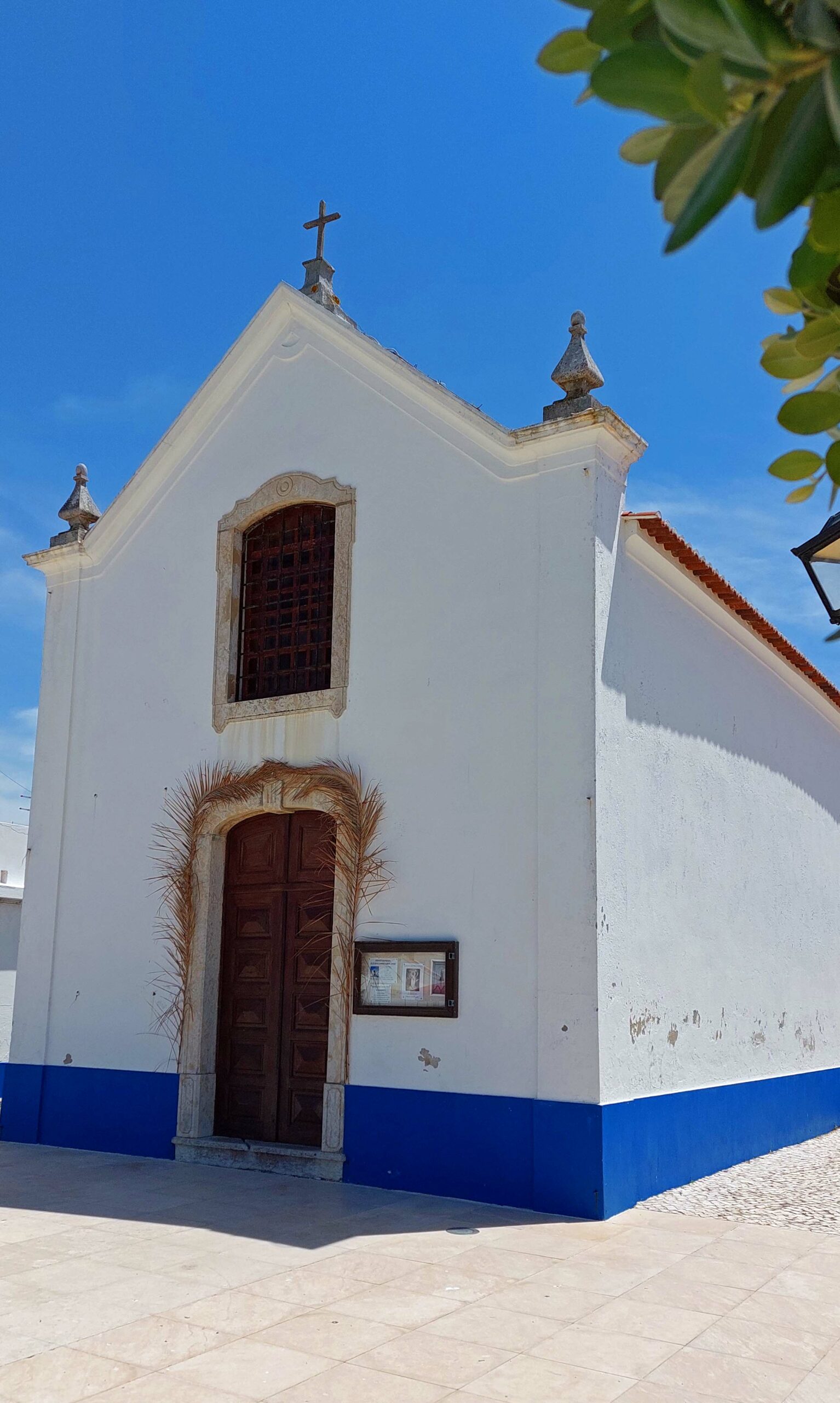 Am Ende der kilometerlangen Holperstrecker treffe ich auf das Fischerdorf an der schroffen Felsküste. Ein typischer Badeort. Das Highlight hier ist die weiß gekalkte Kapelle “Capela de Nossa Senhora do Mar‘ mit der Schutzpatronin der Fischer. Das denkmalgeschützte Kleinod thront unmittelbar über der Steilküste auf einer 130 Meter hohen Klippe. Gleich nebenan befindet sich der Hausstrand mit dunklem Sand und von Felsklippen umrahmt.