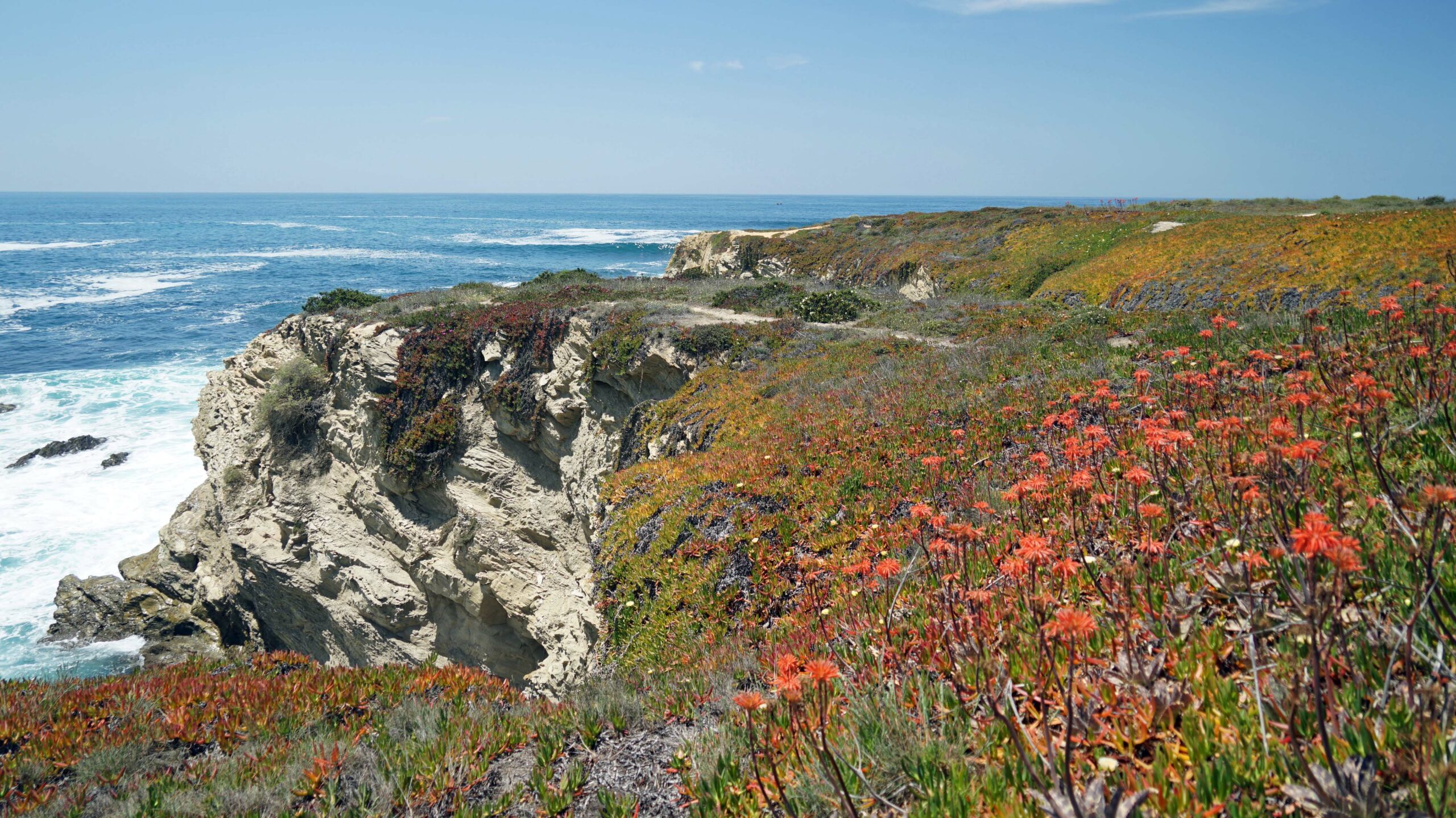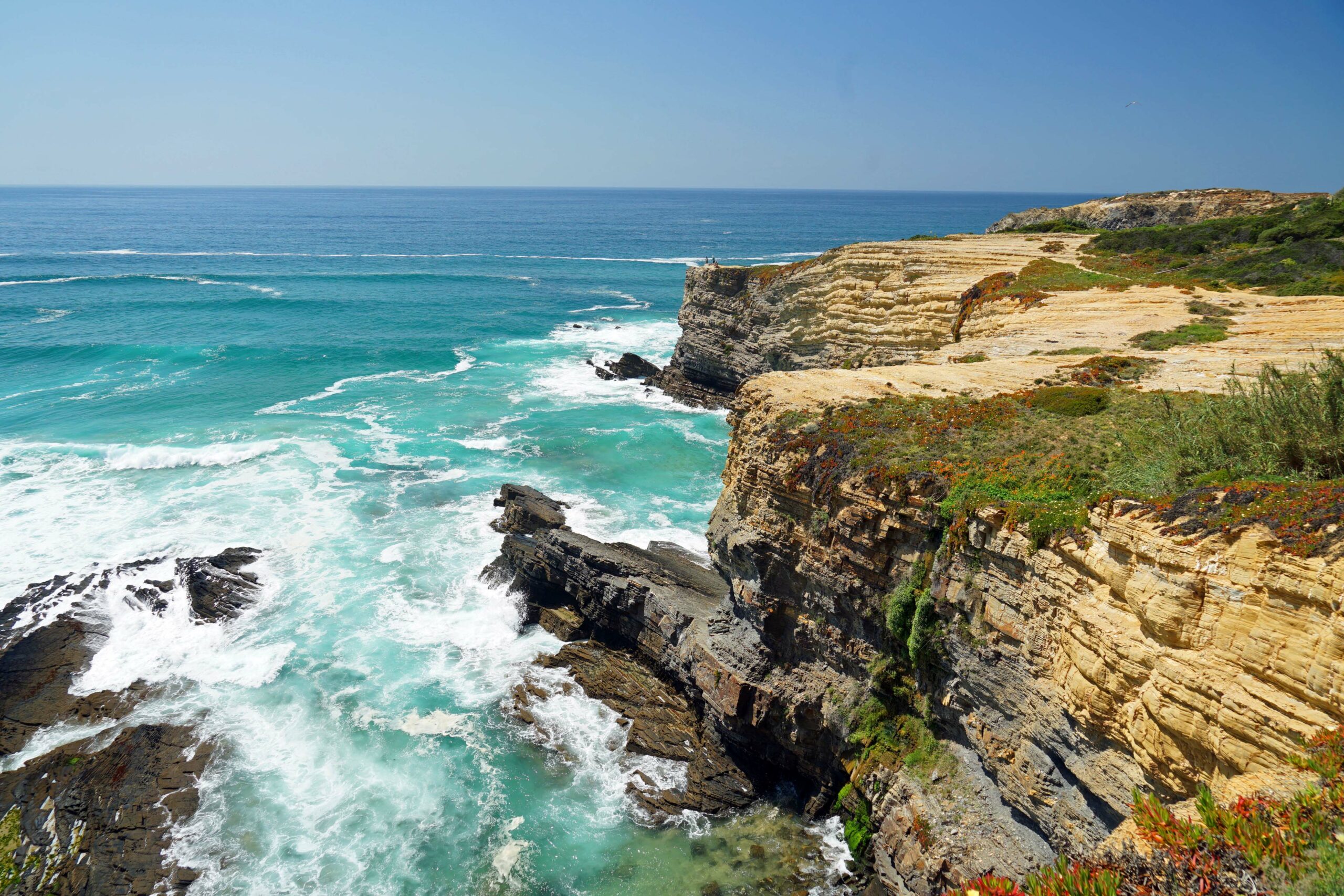 Südlich der Stadt beginnt der Naturpark „Parque Natural do Sudoeste Alentejano et Costa Vicantina“. Ich fahre jetzt durch dünn besiedeltes Gebiet und verlassene Höfe. Links und rechts der Straße weiden Schafe, Ziegen und Rinder und es nisten zahlreiche Weißstörche. Es gibt keine Bettenburgen – die mich an der südlichen Algarveküste erwarten werden – nur Natur und kilometerlange Sandstrände, die oft lediglich per pedes zu erreichen sind. Der Naturpark ist ein Paradies für Tiere, Pflanzen und Naturliebhaber, welche die Ruhe suchen. Haltemöglichkeiten sind bewusst nicht vorgesehen. Die Landschaft ist sehr abwechslungsreich: Es gibt Dünen und Moore, Salzwiesen und Sümpfe, Bergketten und Täler, Flüsse und Lagunen. Highlight aber sind die bis zu 150 Meter hohen Klippen an den zerklüfteten Steilküsten.