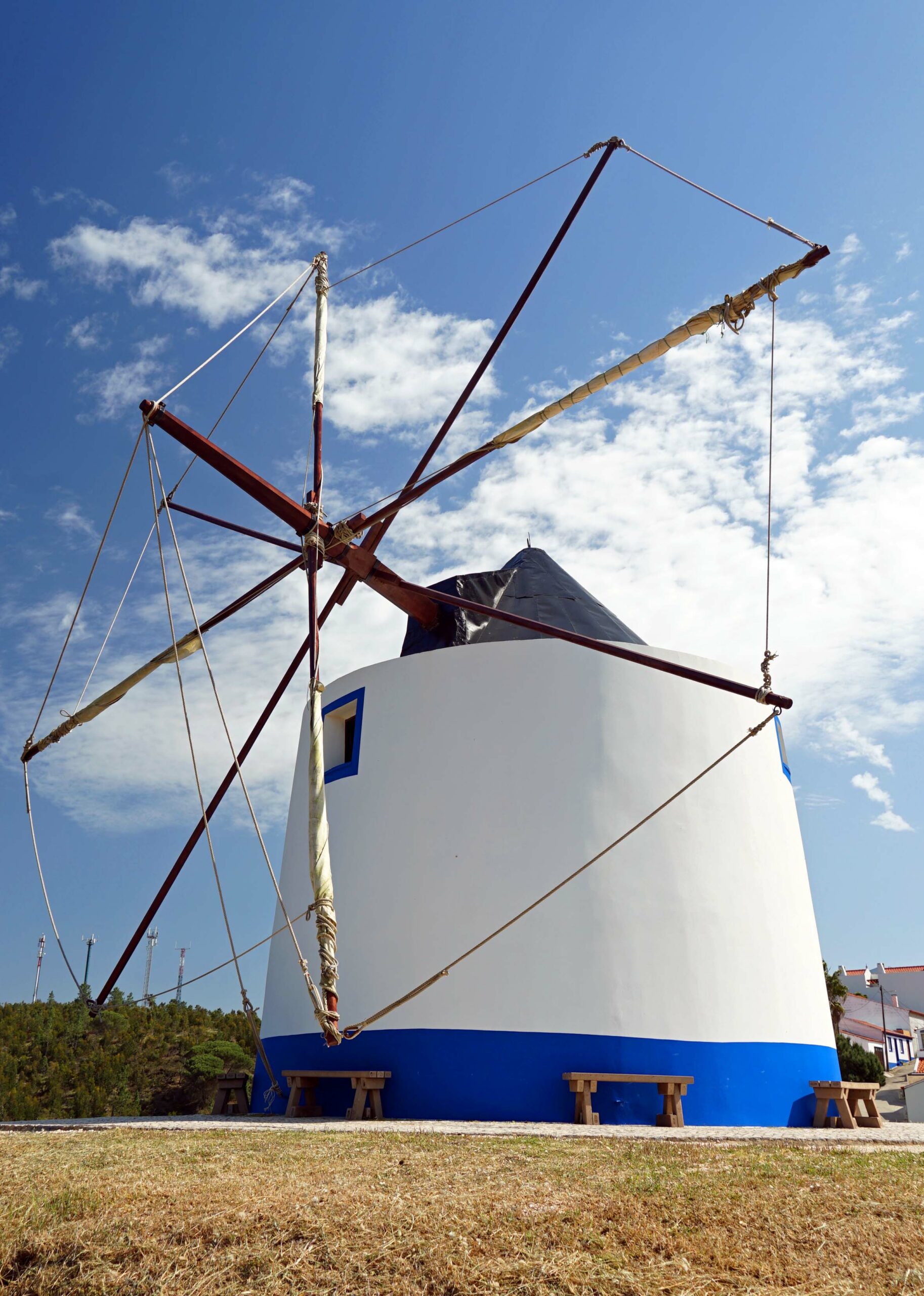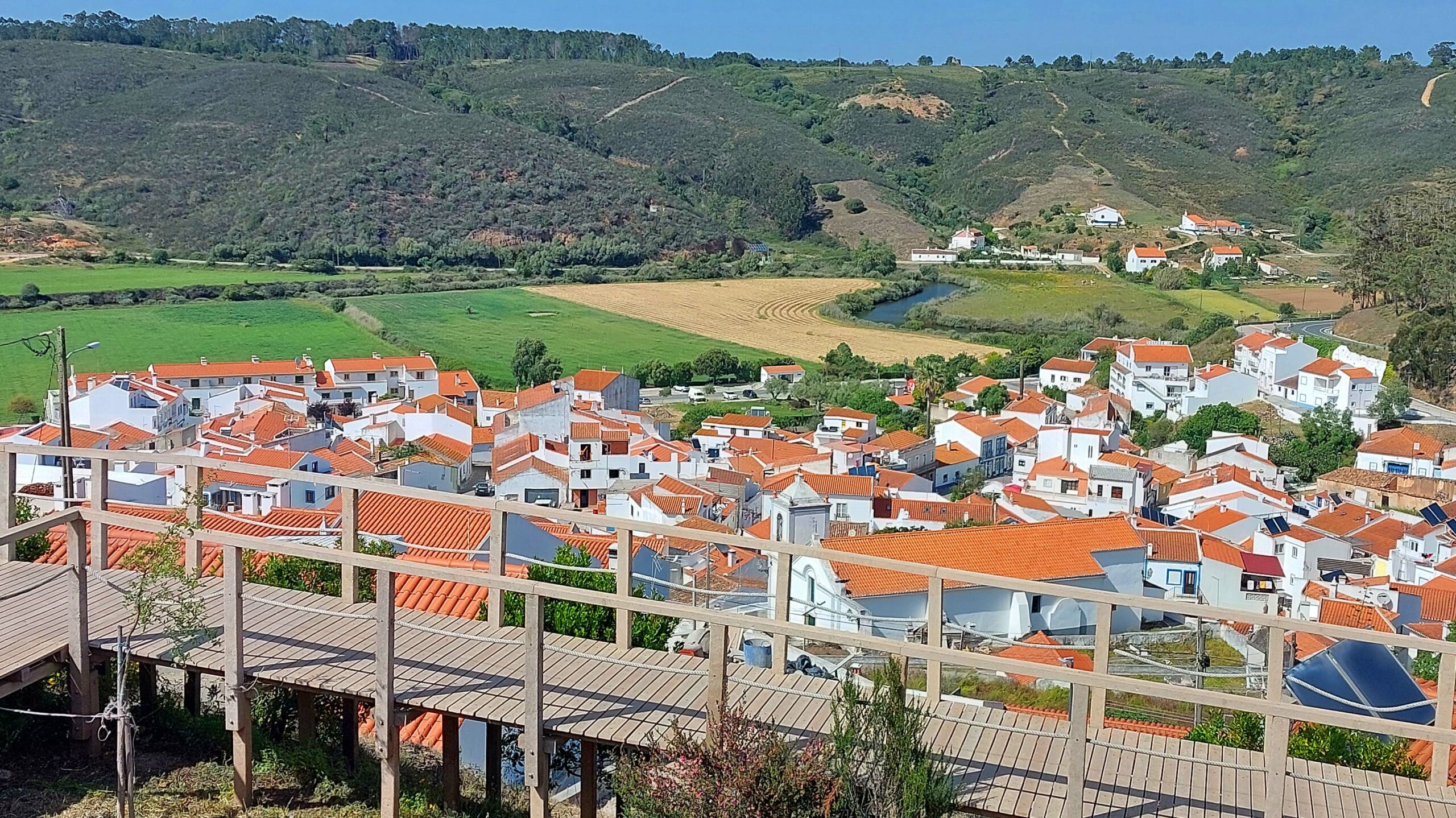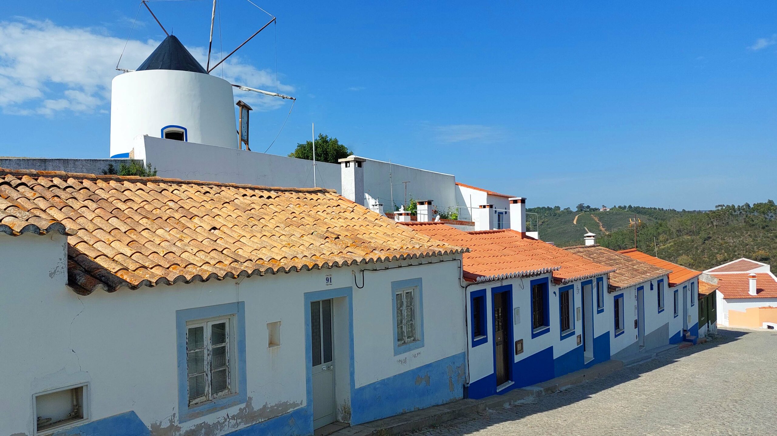 Odeceixe liegt am Rio de Seixe, und ist ein beschauliches Städtchen. Sein Wahrzeichen ist die noch im Betrieb befindliche blau-weiße Windmühle ‚ Moinho de Odedeixe‘ hoch über dem Ort. Ich genieße meinen Rundgang ohne einen einzigen Touri, das blau-weiße Häusermeer mit den roten Dächern und den steilen Kopfsteinpflasterweg zur Mühle. Die Gässchen und die auf dem Weg zur Mühle liegende Dorfkirche ‚Igreja Matritz‘ von 1880 mit urigem Friedhof sind eine Augenweide. Die Aussicht auf die Stadt und das Flusstal ist wunderschön. Ich besichtige die Mühle und steige wieder zu Fiete hinab.