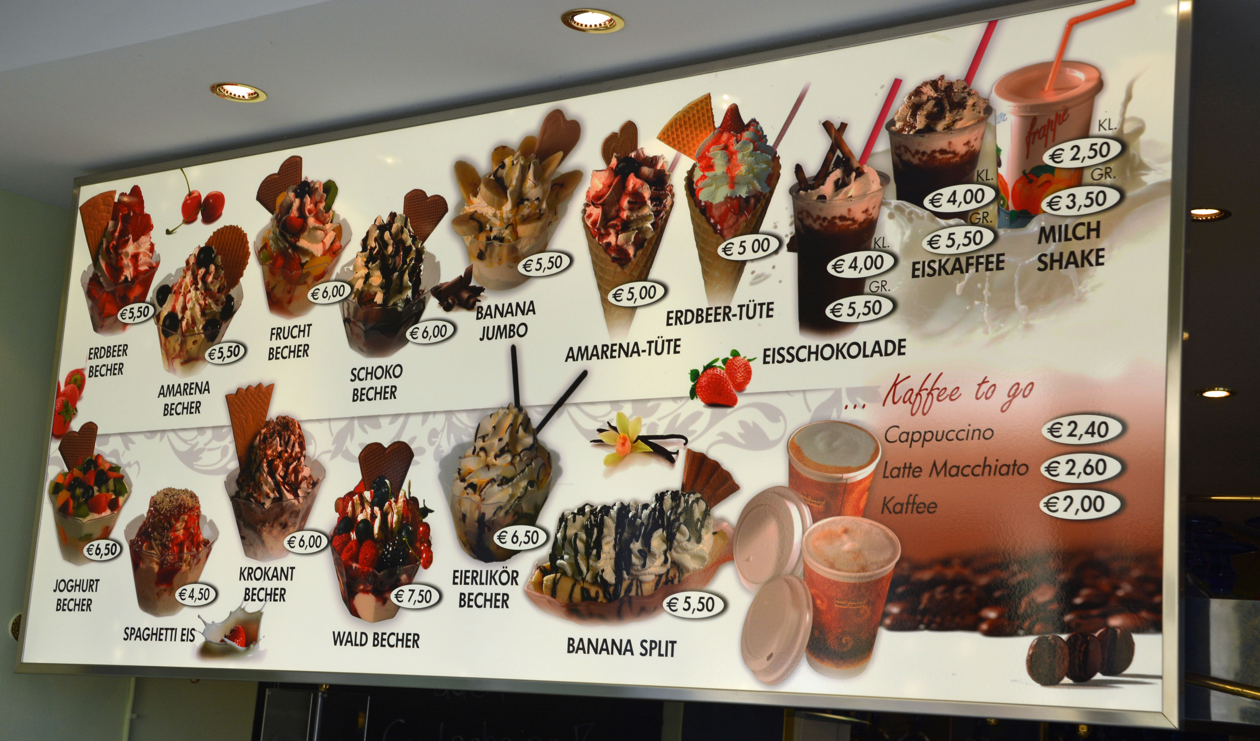 Mittlerweile sticht die Sonne und es ziehen Schönwetterwolken auf. Ich erklimme noch schnell die Pfarrkirche und dann geht es rechtsmainisch zurück. Wir setzen erneut auf die andere Mainseite über, weil wir auf keinen Fall durch die Weinberge wollen. Wir genießen die letzten Radlkilometer – insgesamt sind es 25 – und fallen mit „Zwölf auf einen Streich“ in der Eisdiele ‚Angelo‘ gleich hinter dem Volkacher Untertor ein. Wir kühlen uns mit Eisbechern aller Art und trennen uns bis zum Abendessen für eine kurze Siesta.