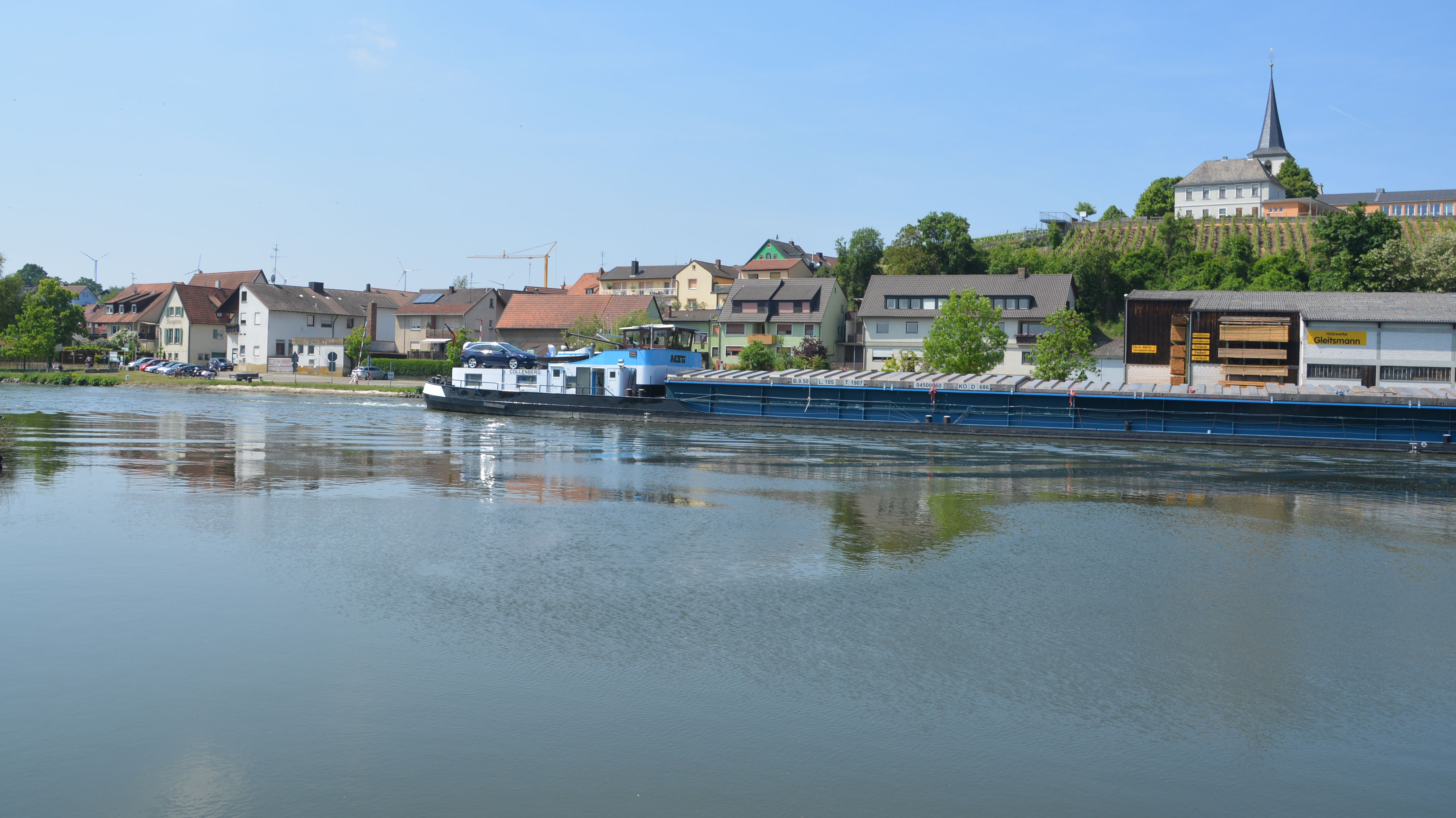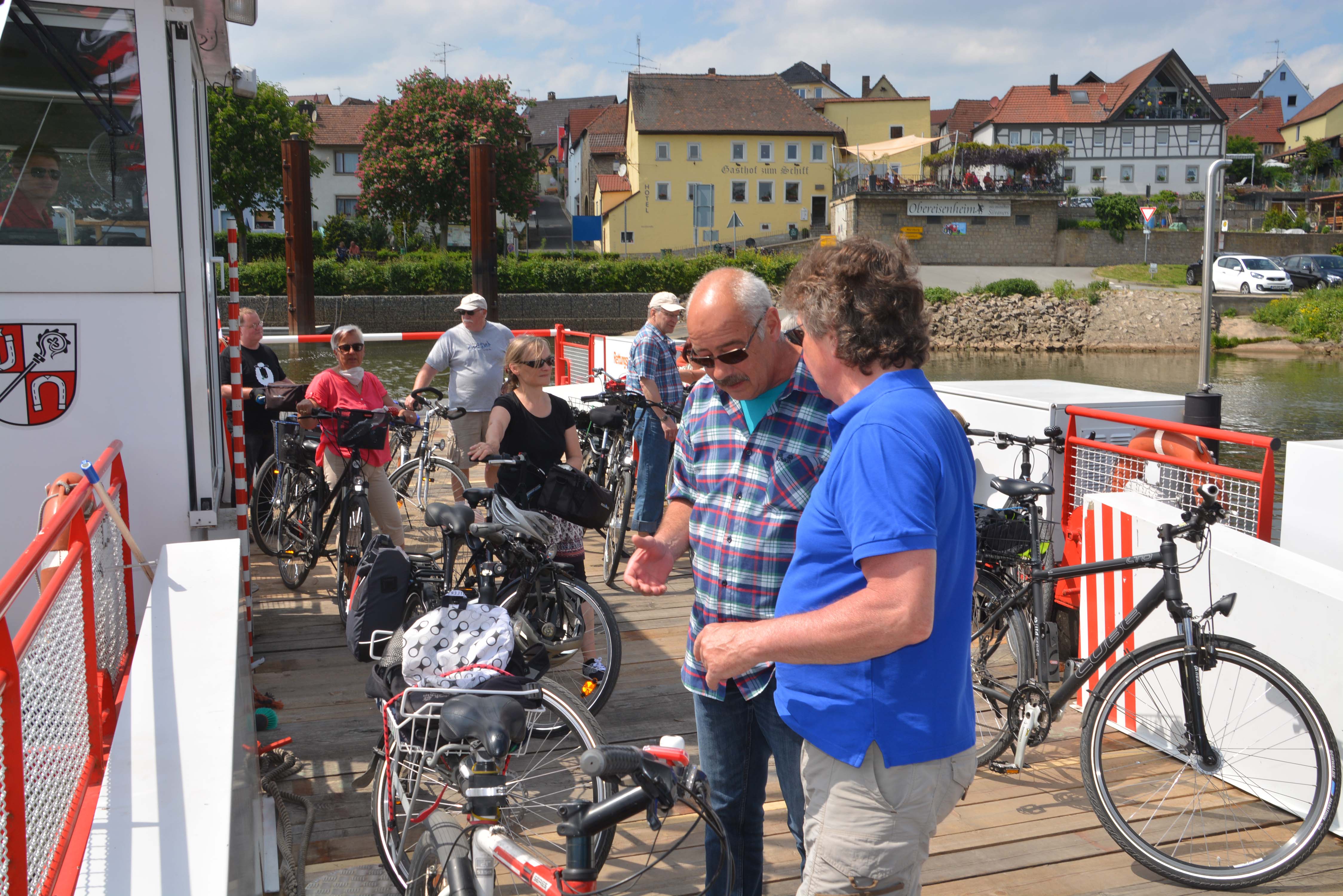 Bei Stammheim – kurz hinter Fahr – rasten wir im Schatten und informieren uns über die Radwege im Schweinfurter Land. Nach weiteren vier Kilometern erreichen wir die Mainaue St. Ludwig und setzen mit der Fähre nach Wipfeld über. Hier ist trotz verlängertem Wochenende tote Hose, alles sieht etwas heruntergewirtschaftet aus, und Jutta meint, nur ein Biergarten habe geöffnet. Man soll es nicht glauben, dass es auch hier gut schmeckende fränkische Brotzeit, bestes Bier und süffigen Wein gibt.